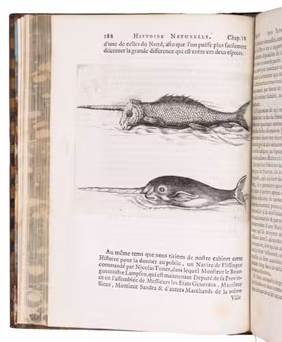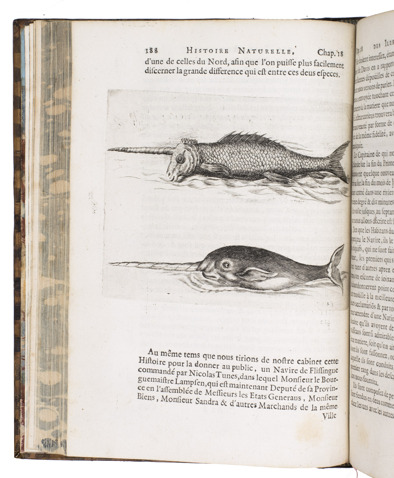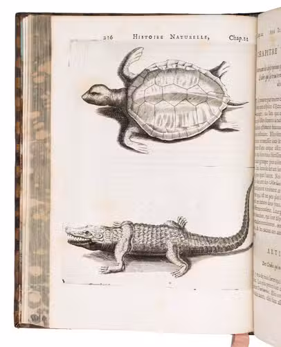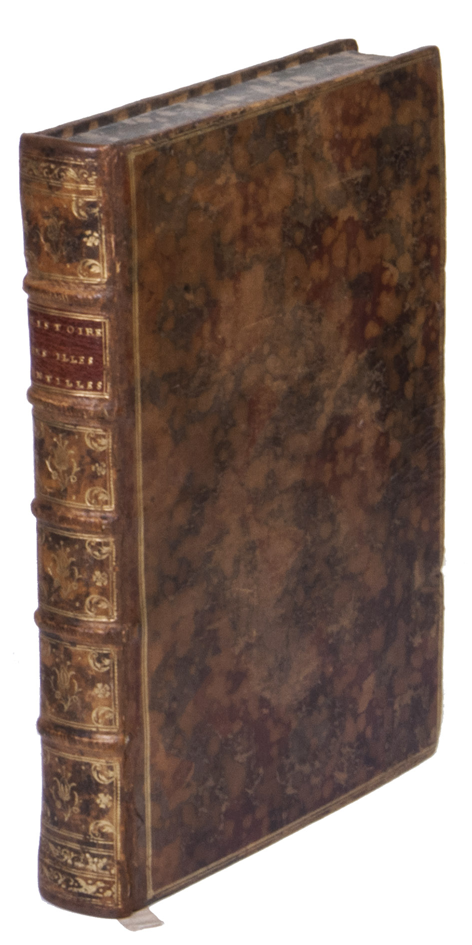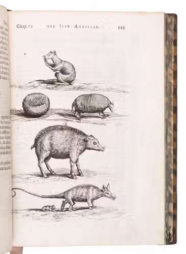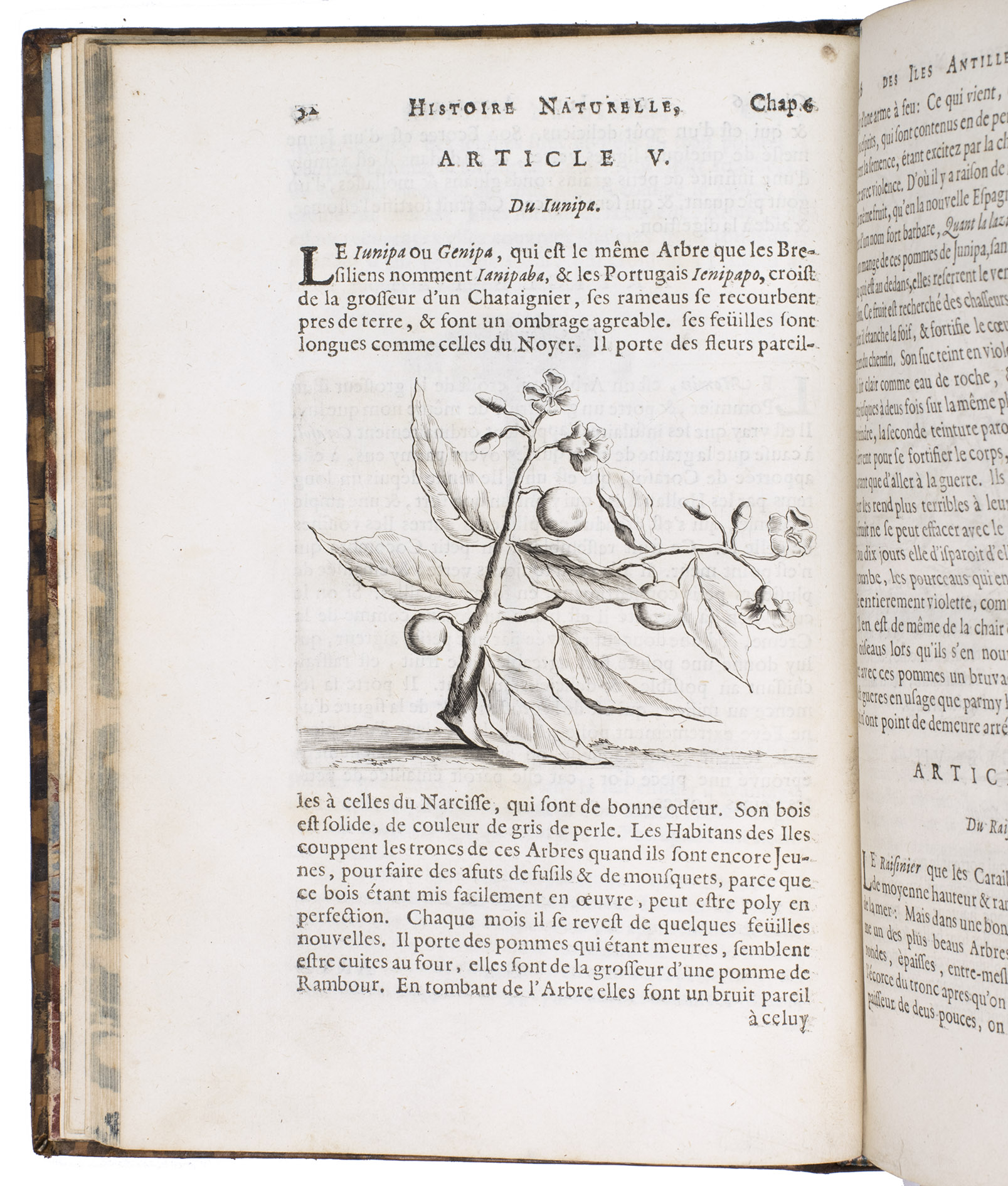 Rotterdam, Arnout Leers, 1658. 2 parts in 1 volume. 4to. With an engraved title-page, a woodcut printer's device on the typographical title-page, a full-page portrait of Amproux, 43 engraved plates in the text of all kinds of plants, trees, animals and costumes from the Antilles. Further with a divisional title-page for the second part, and woodcut decorated initials, head- and tailpieces throughout. Contemporary gold-tooled marbled calf, with a red morocco title-label lettered in gold, gold-tooled board edges, marbled edges, marbled endpapers, and a bright pink reading ribbon. [1], [1 blank], [12], 527, [12], [1 blank] pp.