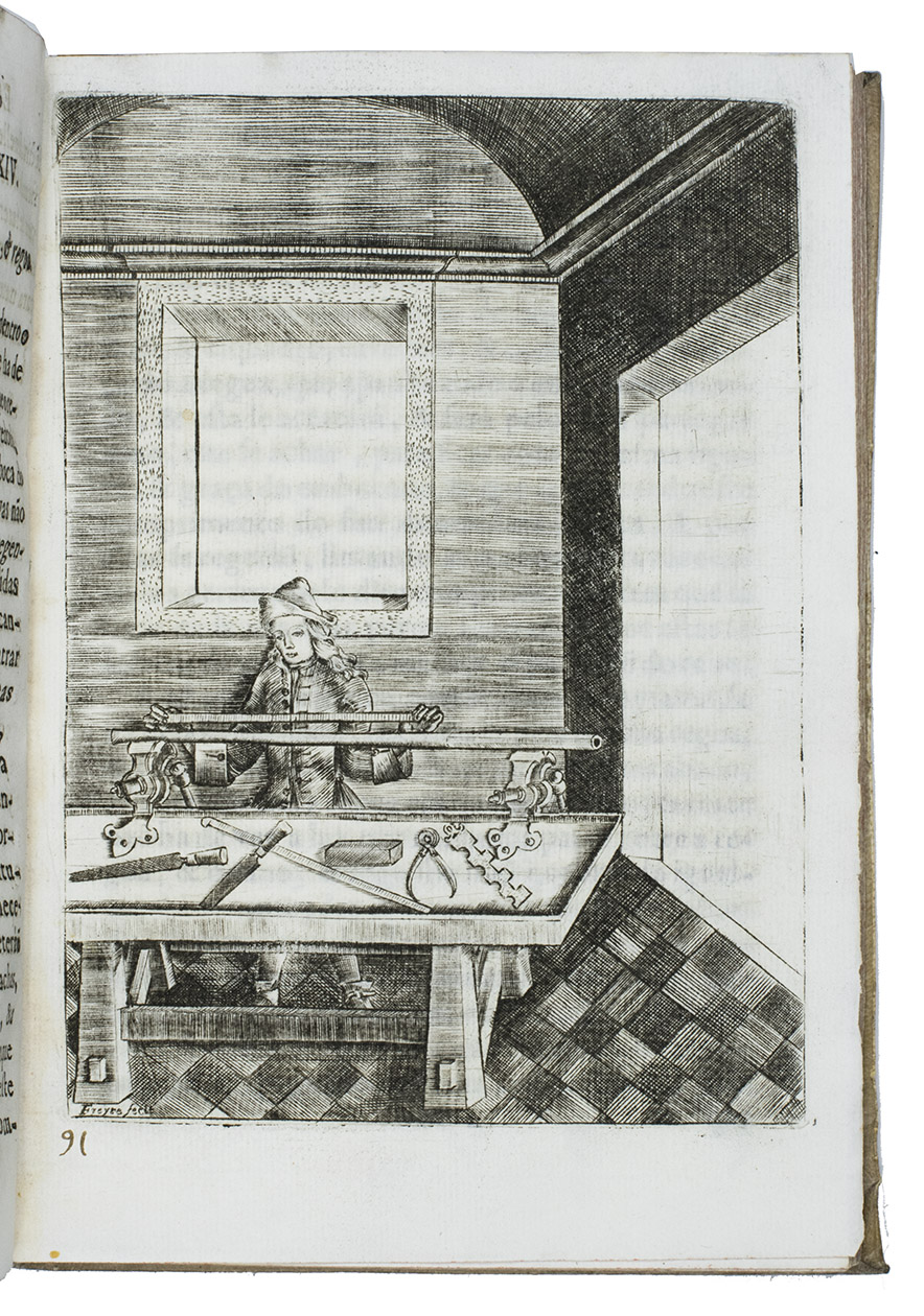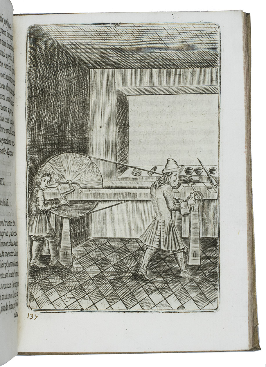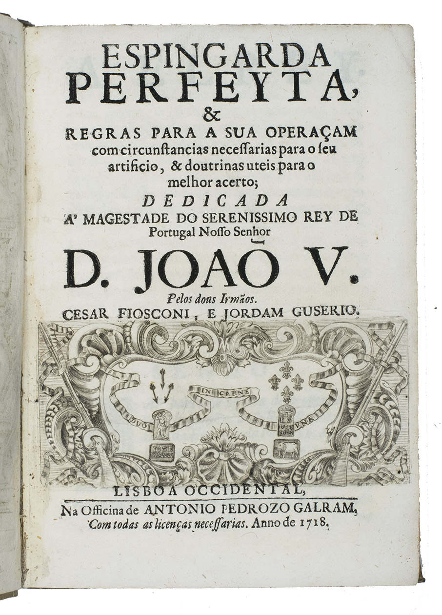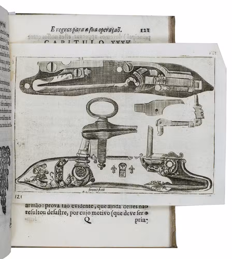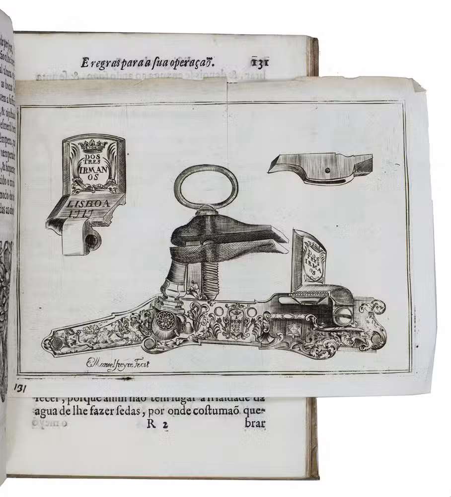 First (and only early) edition of a rare Portuguese manual devoted primarily to gun smithing, but also discussing the use of guns in hunting. It gives detailed instructions and excellent illustrations concerning the techniques of gunsmithing ca. 1700, with views of men at work at the forge, with many tools in view, a man using a lathe, men using several other tools, decorated gunlocks and other decorative elements. One plate shows a man shooting a bird. Written by two brothers, the Lisbon gunsmiths José Fransisco and João Rodrigues, it is "the most remarkable treatise on the subject of gunmaking of this period'' (Daehnhardt in the introduction of the 1974 reprint). The Rodrigues brothers broke with tradition by setting down in print knowledge that had previously been passed down from master to apprentice within the closed circles of the trade guilds.
