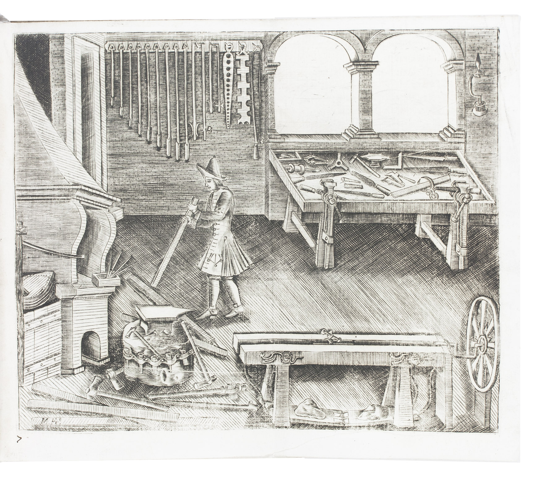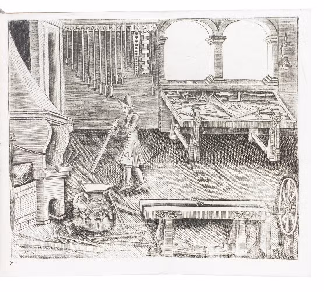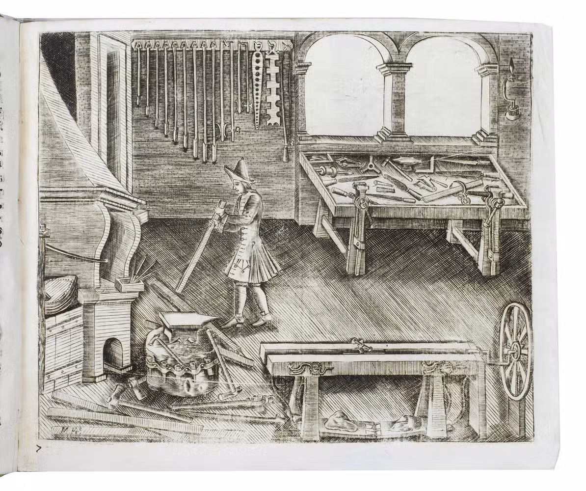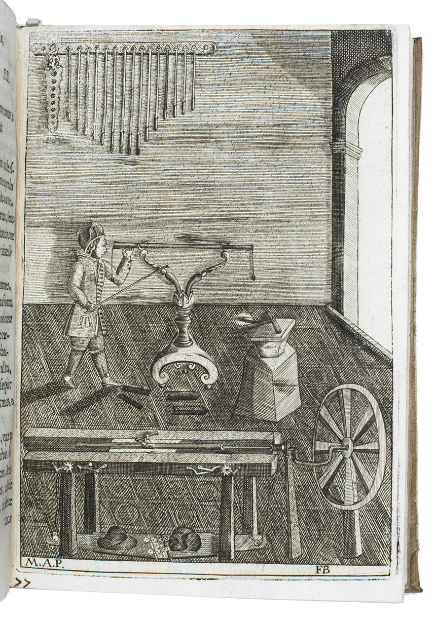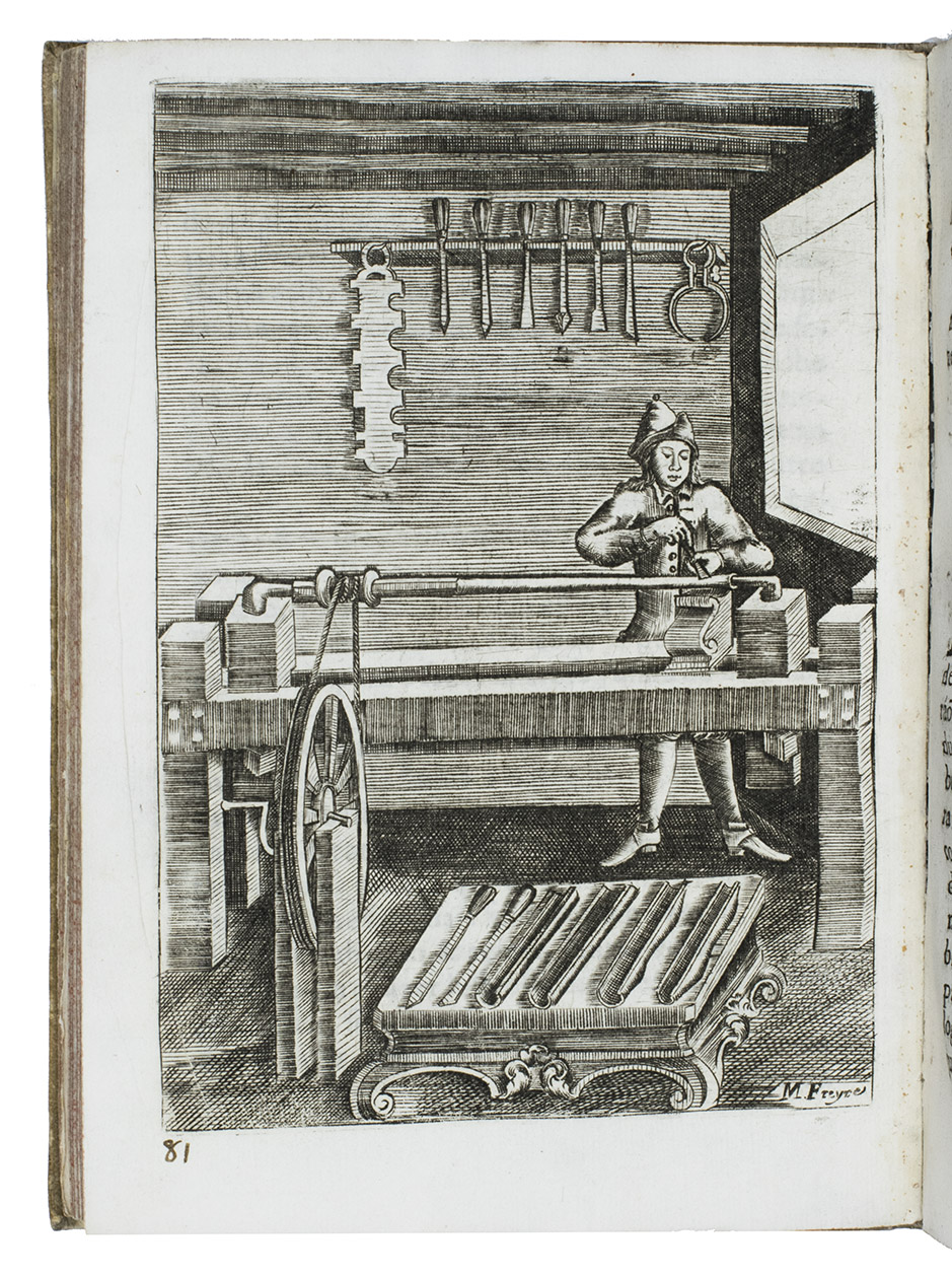 First (and only early) edition of a rare Portuguese manual devoted primarily to gun smithing, but also discussing the use of guns in hunting. It gives detailed instructions and excellent illustrations concerning the techniques of gunsmithing ca. 1700, with views of men at work at the forge, with many tools in view, a man using a lathe, men using several other tools, decorated gunlocks and other decorative elements. One plate shows a man shooting a bird. Written by two brothers, the Lisbon gunsmiths José Fransisco and João Rodrigues, it is "the most remarkable treatise on the subject of gunmaking of this period'' (Daehnhardt in the introduction of the 1974 reprint). The Rodrigues brothers broke with tradition by setting down in print knowledge that had previously been passed down from master to apprentice within the closed circles of the trade guilds.