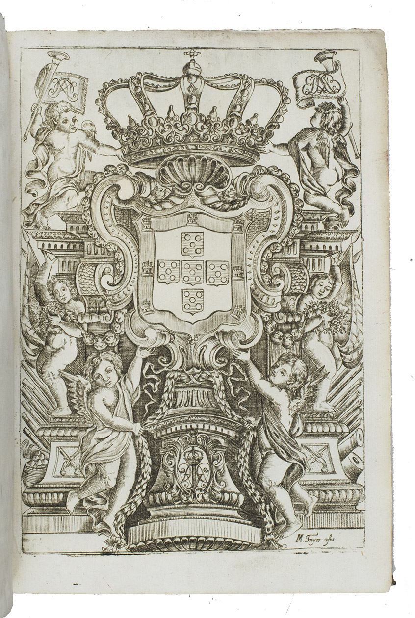 Lisbon, António Pedroso Galrão, 1718. 4to. With full-page frontispiece showing the crowned Portuguese coat of arms, title-page with engraved decorative cartouche, 12 engraved plates (including 4 folding) by Manuel Freire and 1 engraved illustration in the text. Contemporary limp sheepskin parchment. [31], [1 blank], 183, [1 blank] pp.