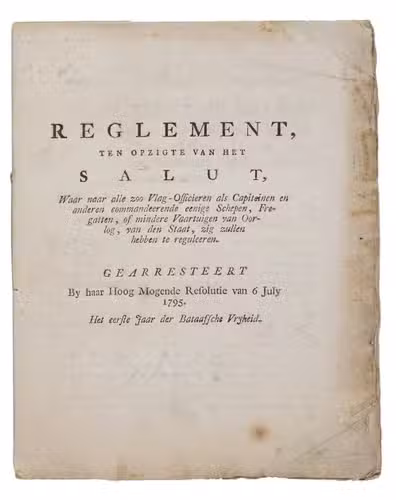 Reglement, ten opzigte van het saluut, waar naar alle zoo vlag-officieren als capiteinen en anderen commandeerende eenige schepen, fregatten, of mindere vaartuigen van oorlog, van den staat, zig zullen hebben te reguleeren. Gearresteert by haar Hoog Mogende resolutie van 6 July 1795. Het eerste jaar der Bataafsche vryheid.