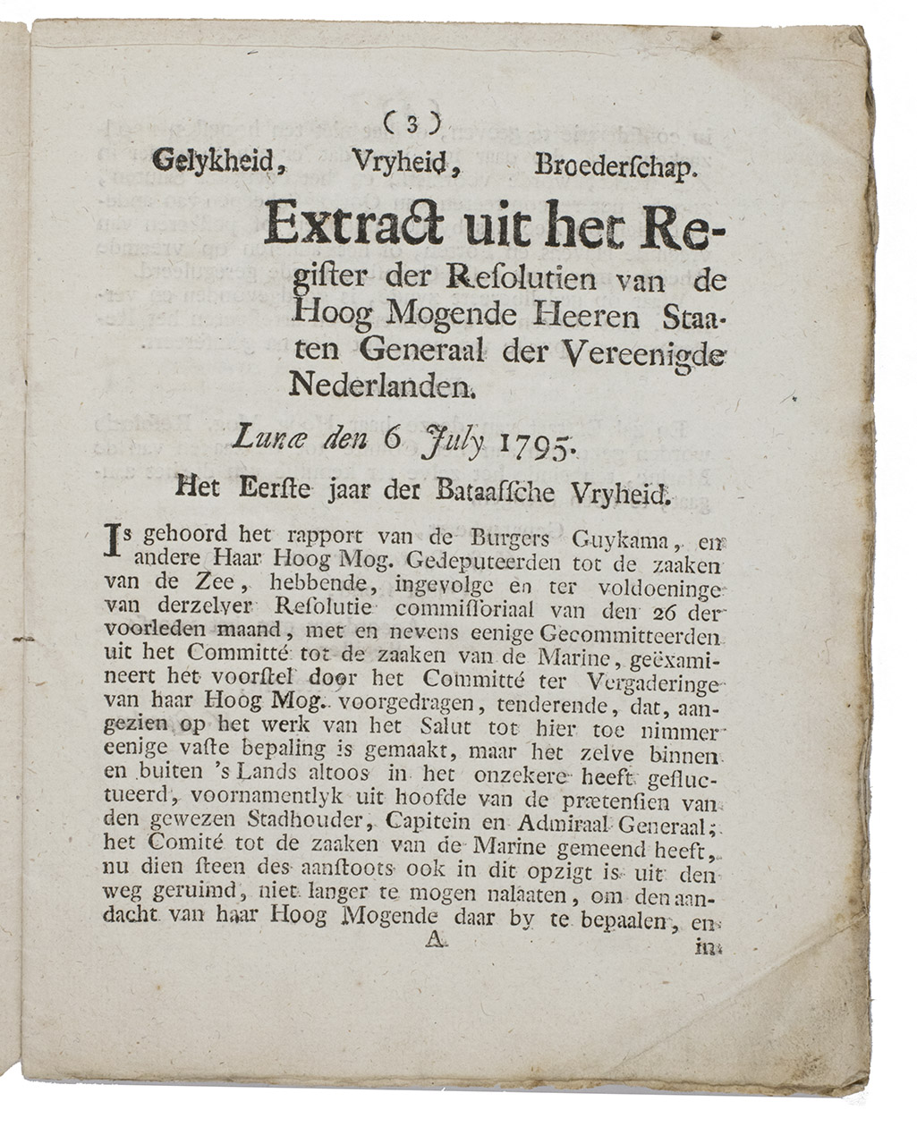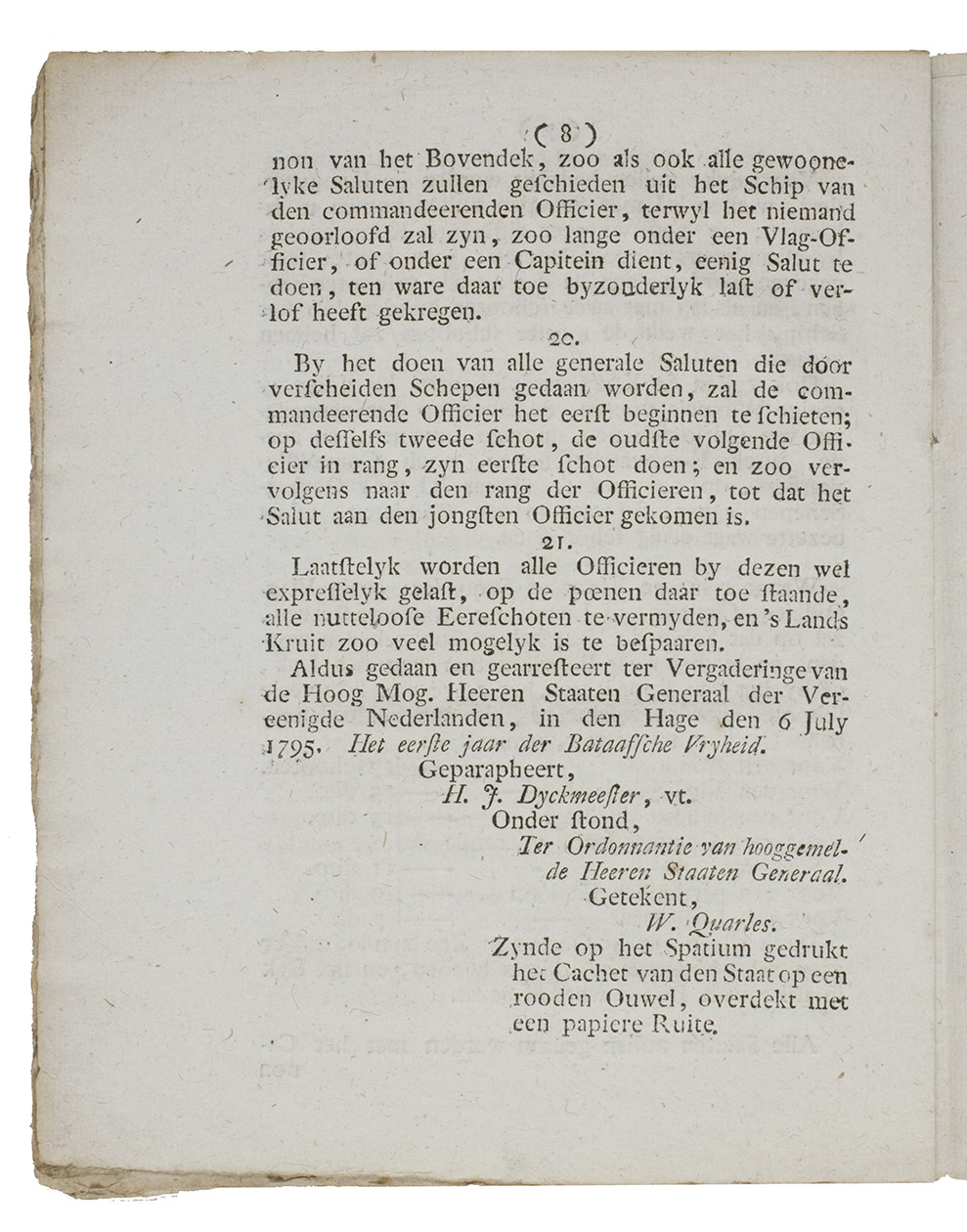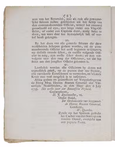 Very rare pamphlet on the regulations concerning signalling, intended for flag officers, captains and other high-ranking officials commanding ships, fregats or lesser vessels under command of the State and indicating whom they should salute and signal and how. These rules were issued in the first year of the new Batavian Republic (established in the Netherlands under the influence of the French Revolutionary army, 1795-1806) by the Committee of naval affairs (Comité tot de zaken van de Marine) to regulate salutations at sea by means of firing shots, including the exact number of shots proper to various occasions, such as the number of canon shots when a high ranking official comes on board. An admiral, for example, gets seventeen salute shots while a commandor gets only eleven. The rules were necessary because of the many misunderstandings and difficulties that occurred when (war)ships met other vessels in the open sea, harbours or roadsteads. Such confrontations had often led to often unintentional hostilities. The resolution is dated 26 June 1795 and the confirmation by the States General 6 July 1795.