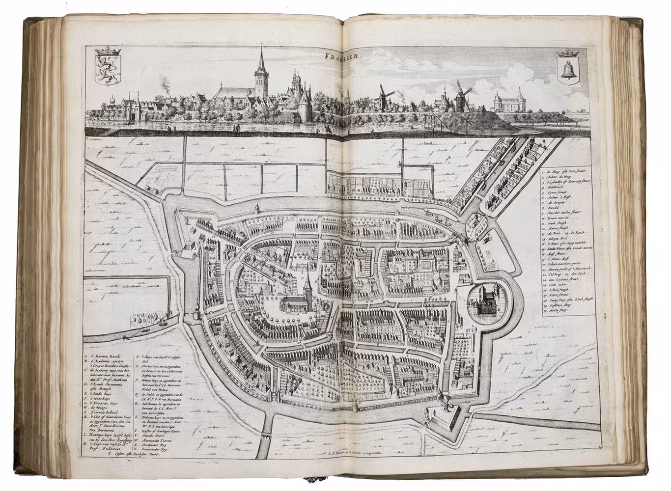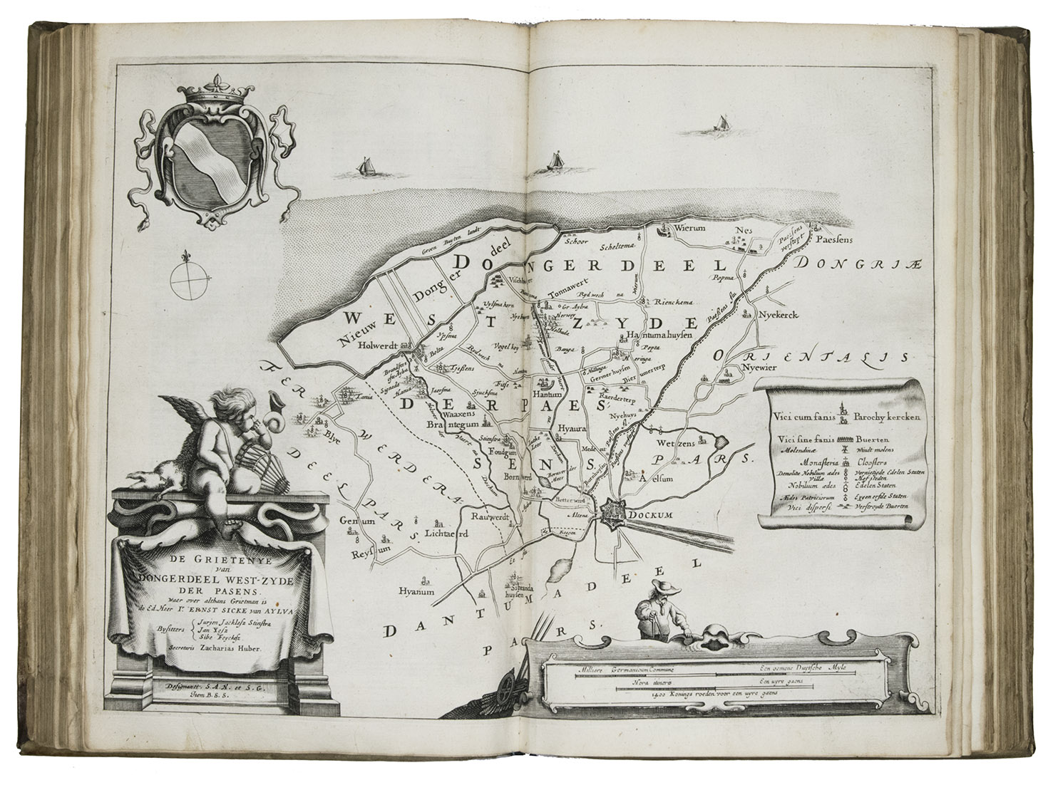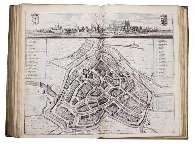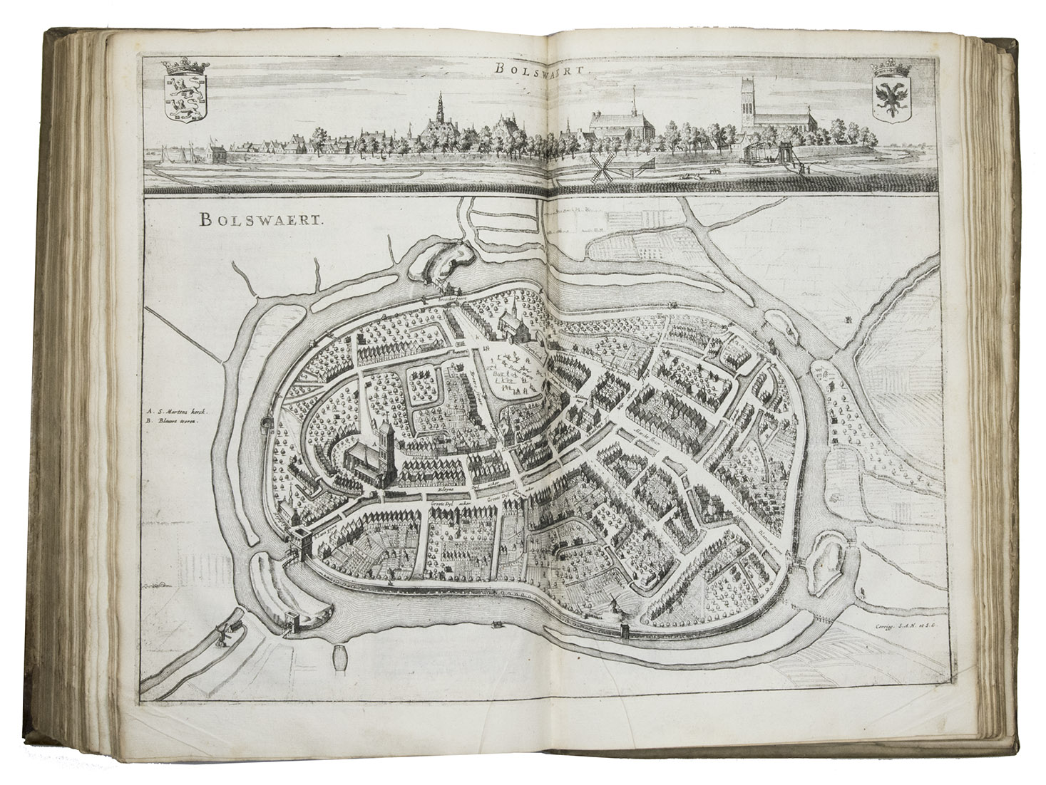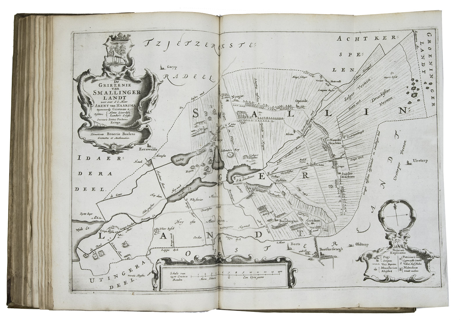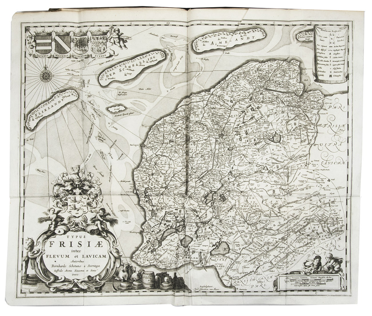 [Franeker], Johannes Wellens, [1664]. Folio. With engraved title-page, full-page engraved coat of arms of the province of Friesland, and 46 engraved maps and plans (4 large folding maps, 31 double-page maps and 11 double-page city plans) by Jacob van Meurs after Bernardus Schotanus à Sterringa. Contemporary blind-tooled vellum. [8], 280, [1], [1 blank] pp.