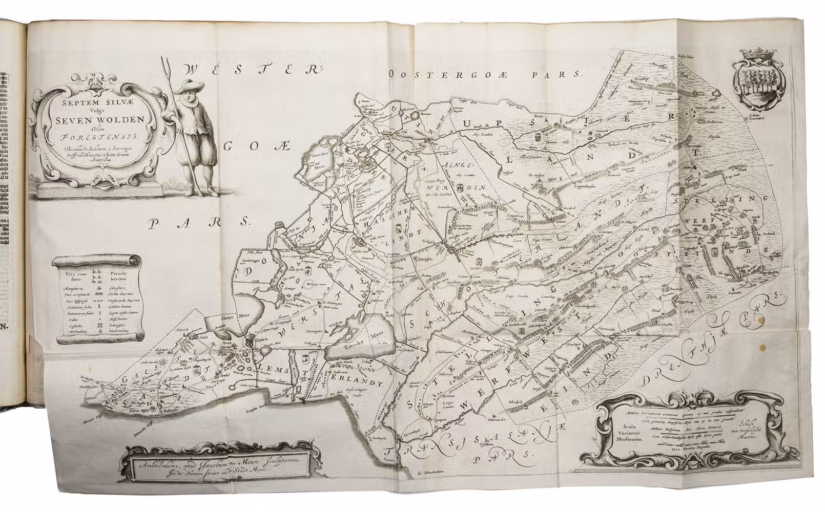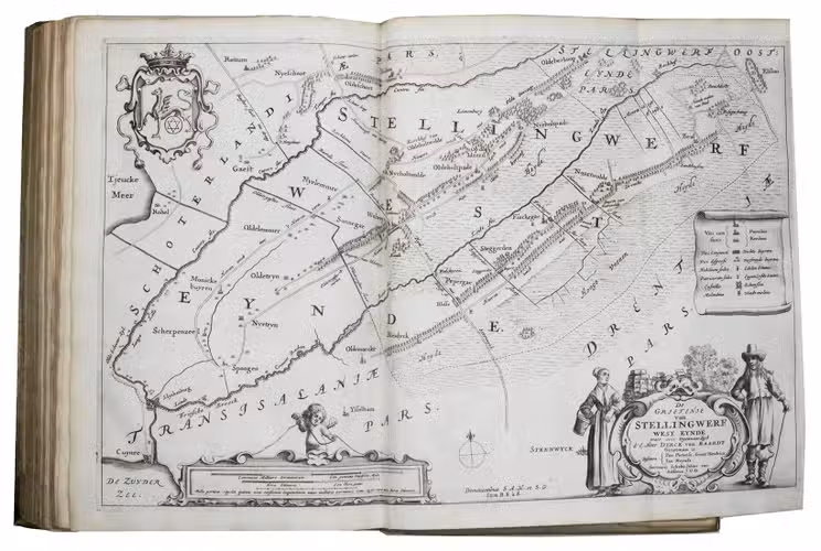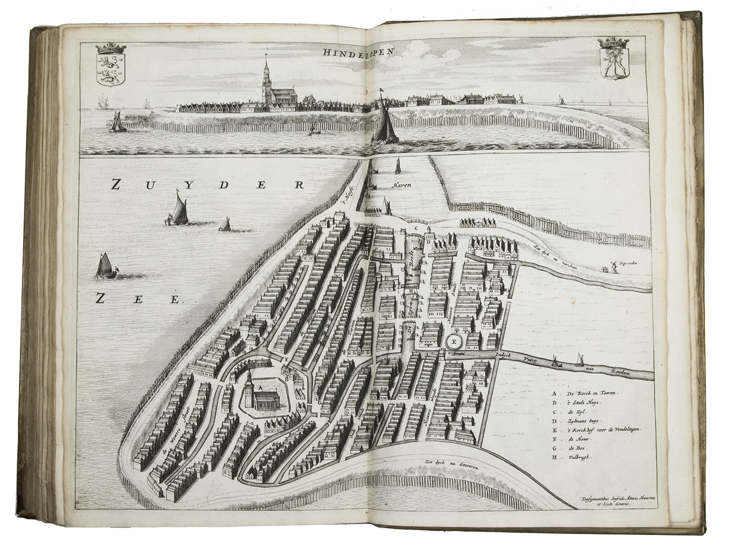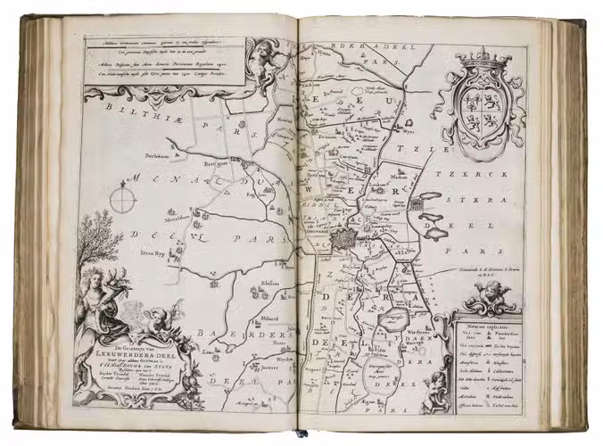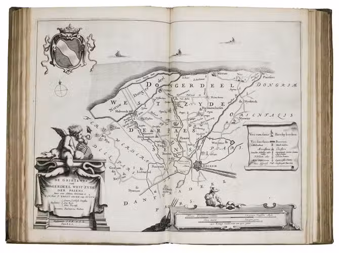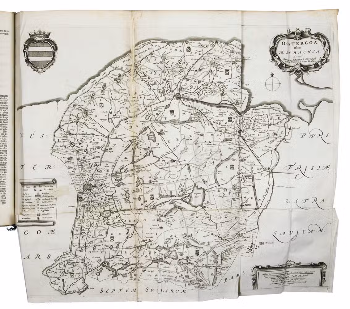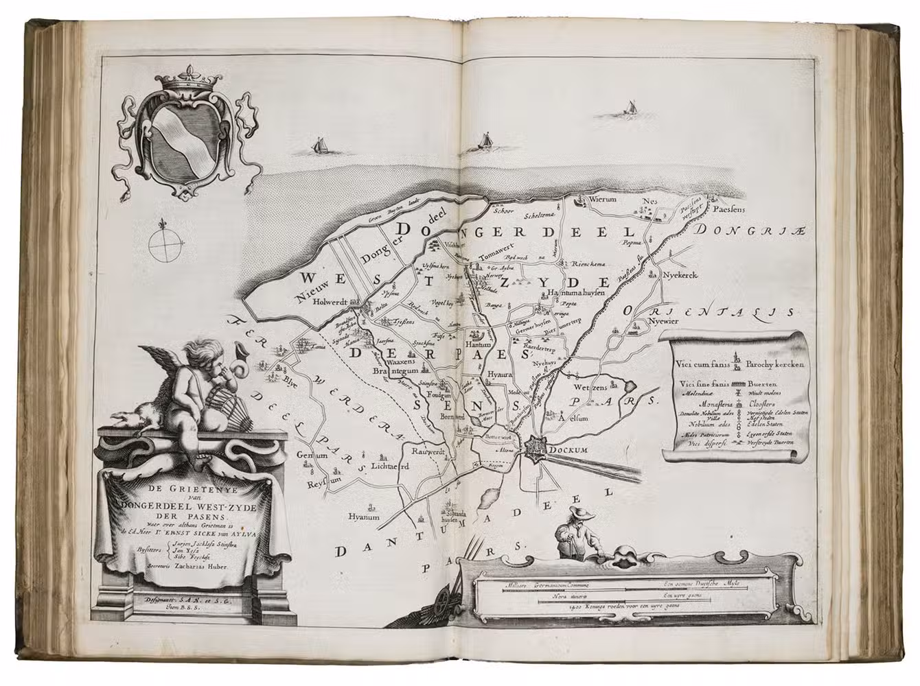 [Franeker], Johannes Wellens, [1664]. Folio. With engraved title-page, full-page engraved coat of arms of the province of Friesland, and 46 engraved maps and plans (4 large folding maps, 31 double-page maps and 11 double-page city plans) by Jacob van Meurs after Bernardus Schotanus à Sterringa. Contemporary blind-tooled vellum. [8], 280, [1], [1 blank] pp.