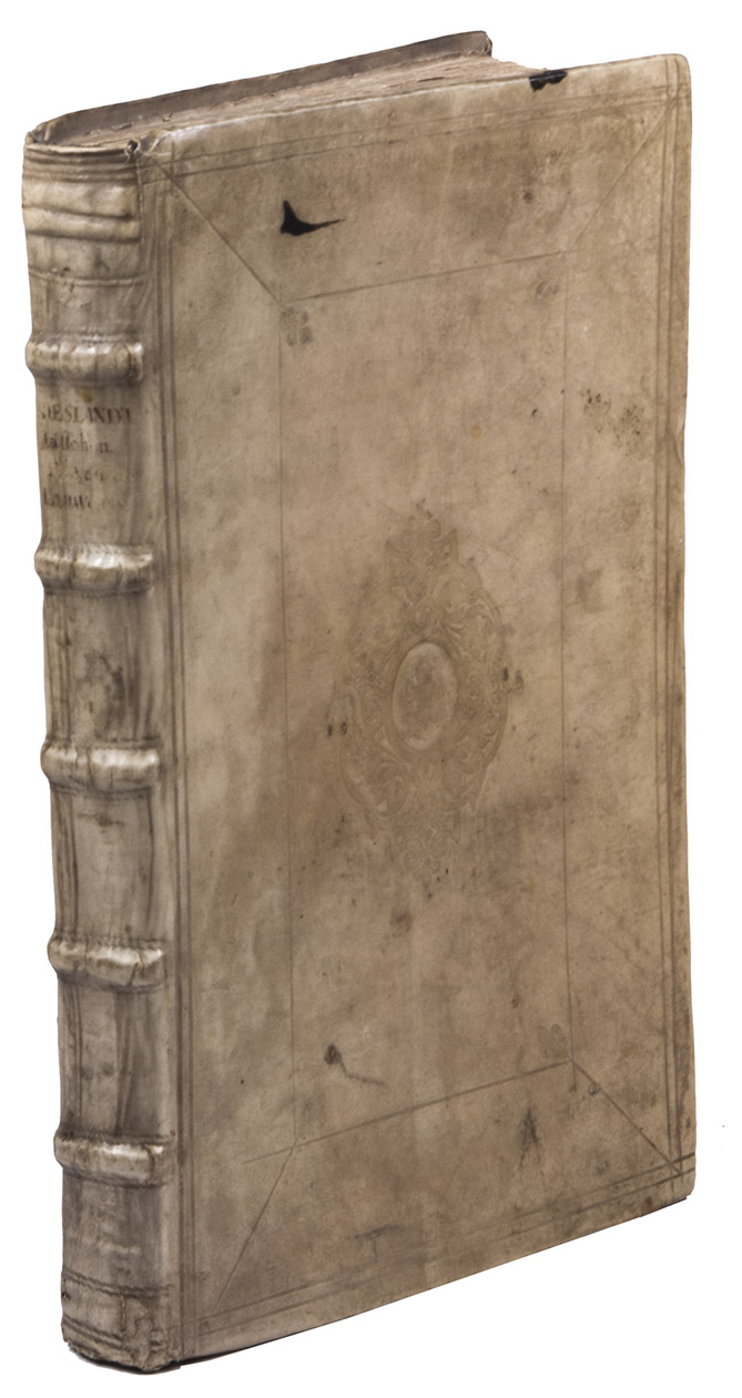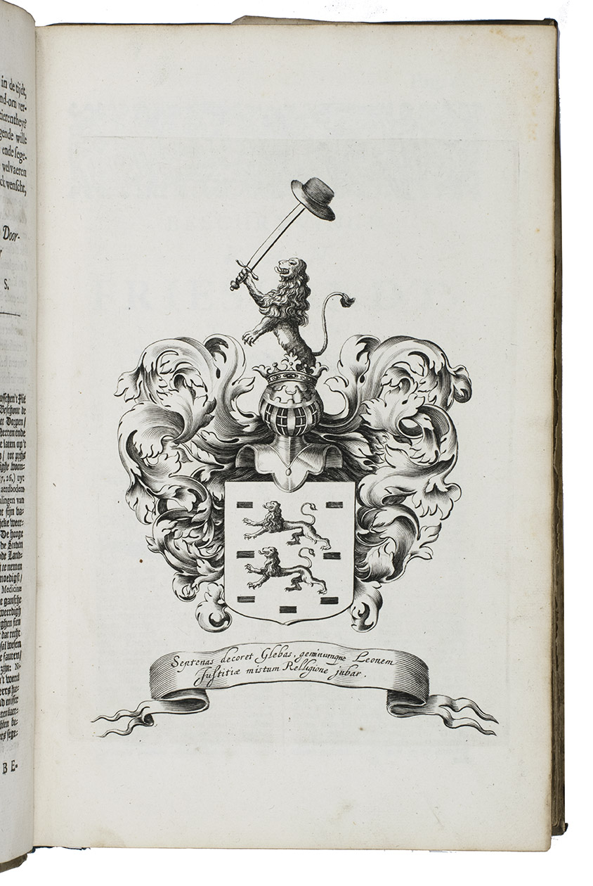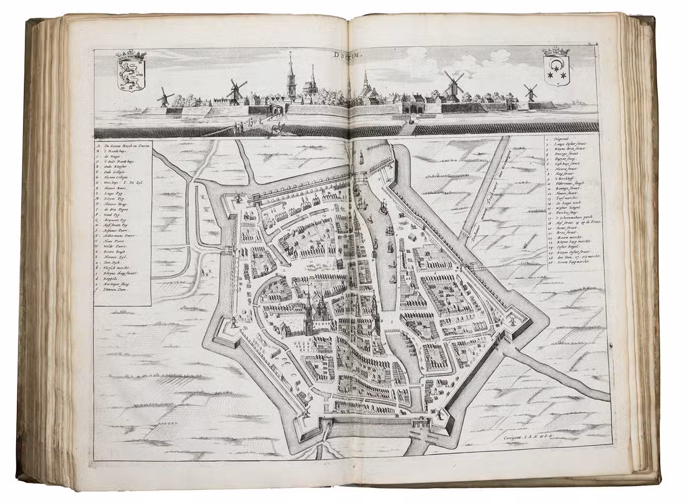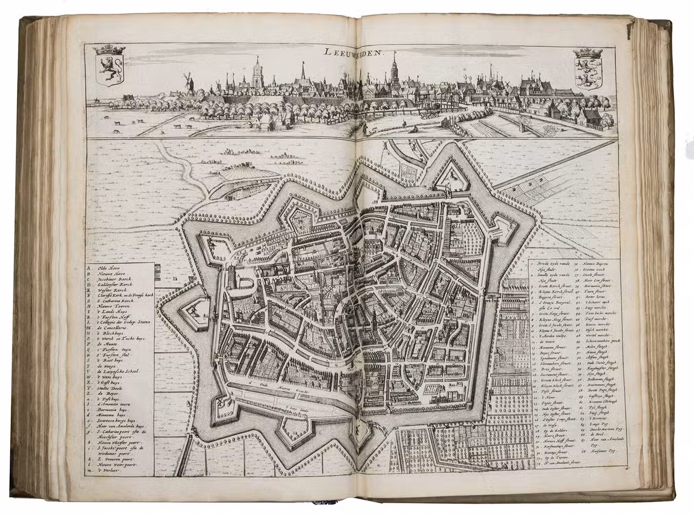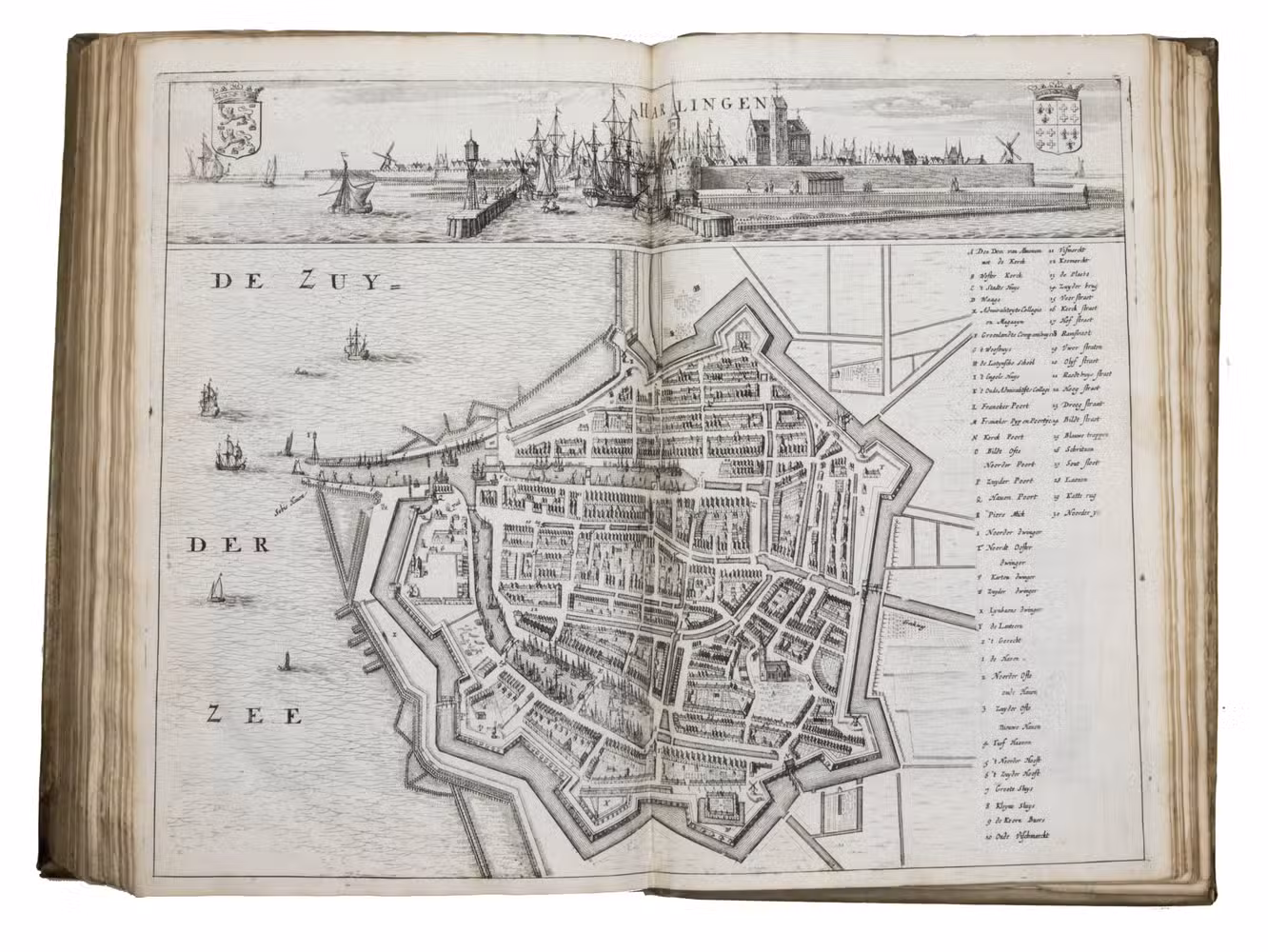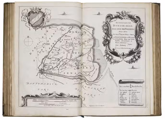 [Franeker], Johannes Wellens, [1664]. Folio. With engraved title-page, full-page engraved coat of arms of the province of Friesland, and 46 engraved maps and plans (4 large folding maps, 31 double-page maps and 11 double-page city plans) by Jacob van Meurs after Bernardus Schotanus à Sterringa. Contemporary blind-tooled vellum. [8], 280, [1], [1 blank] pp.