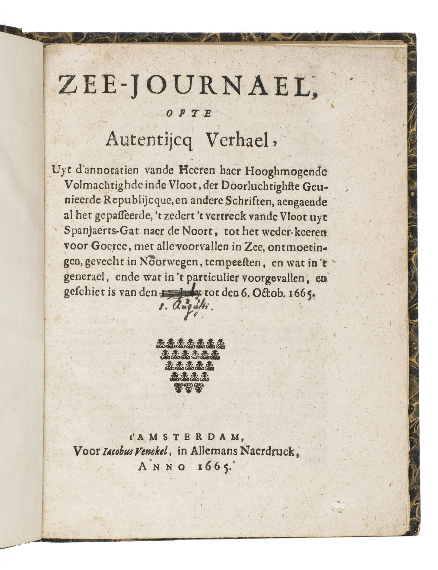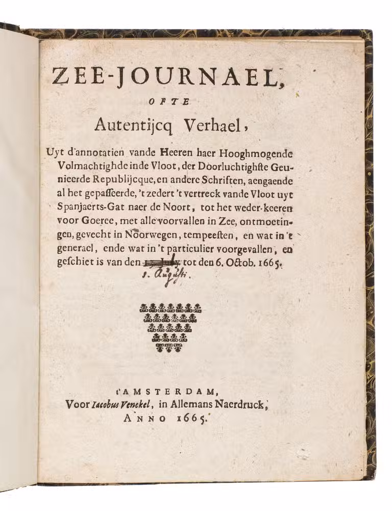 Zee-Journael, ofte autentijcq verhael, uyt d'annotatien vande heeren haer hooghmogende volmachtighde inde vloot, der doorluchtighste Geunieerde Republijcque, en andere schriften, aengaende al het gepasseerde, 't zedert 't vertreck vande vloot uyt Spanjaerts-Gat naer de Noort, tot het weder-keeren voor Goeree, met alle voorvallen in zee, ontmoetingen, gevecht in Noorwegen, tempeesten, en wat in 't generael, ende wat in 't particulier voorgevallen, en geschiet is van den 13. Juni tot den 6. Octob. 1665.