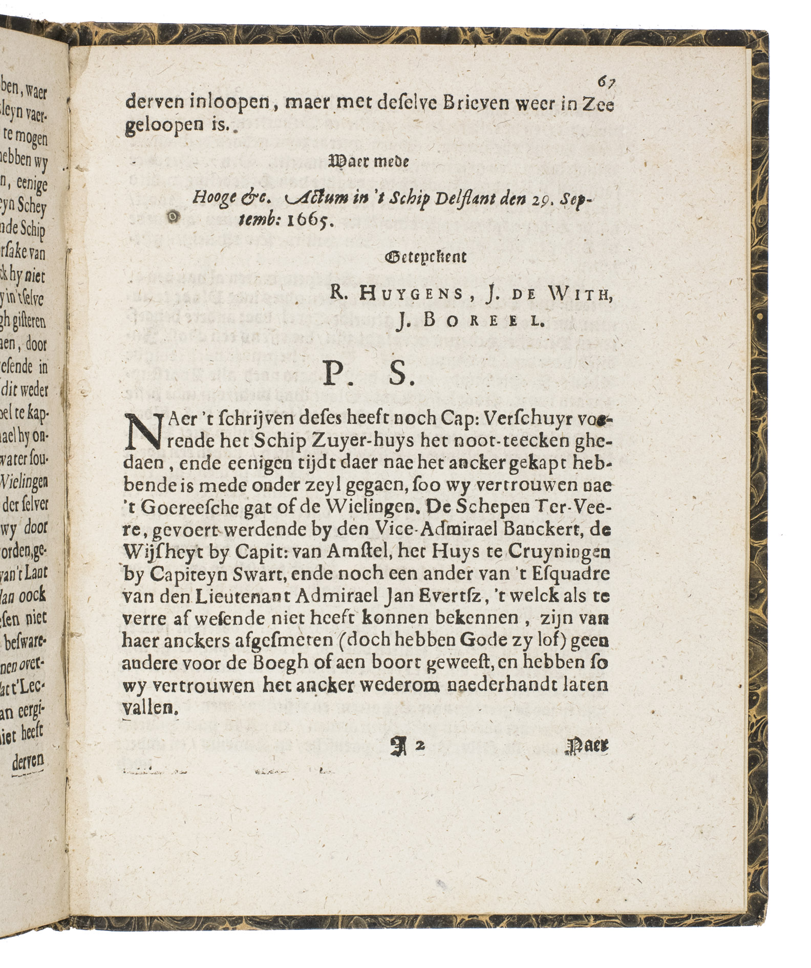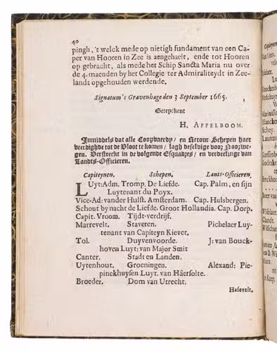The present pamphlet gives an account of the events before and after the Battle of Vågen, and also in broad lines of the battle itself, including all kinds of correspondence and notes from high-ranking figures. The dating in the title is incorrect, as the story took place from August 1 to August 20, which is why the title has been corrected by hand in the present copy. The present edition is one of two, both printed in 1665, but with a different imprint (the present one with the publisher and place of publication, and the other with only the year), and the alignment of the text. However, they were both likely printed by the same printer. The present edition is very rare. We've not been able to find other copies in sales records, and only a few in institutions. A highly interesting pamphlet on one of the most important and fascinating 17th-century sea battles in Dutch naval history and in the history of the Dutch VOC.
