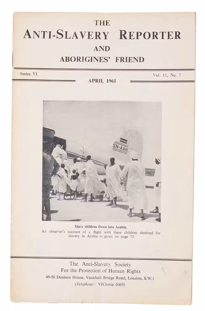 Vol. 2, no. 7 (April 1961). Pamphlet journal which includes obituaries, articles, reports, news and reviews. Cover photo shows Nigerian children boarding a plane for Saudi Arabia, where a story on page 73 states that they are to be sold as slaves to cover the costs of pilgrimage.