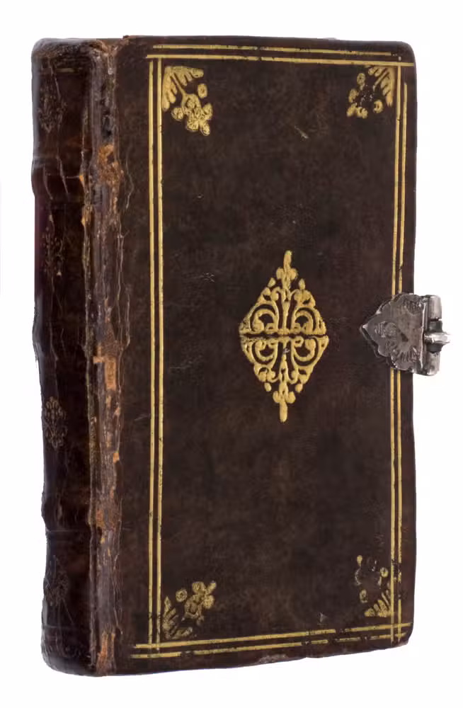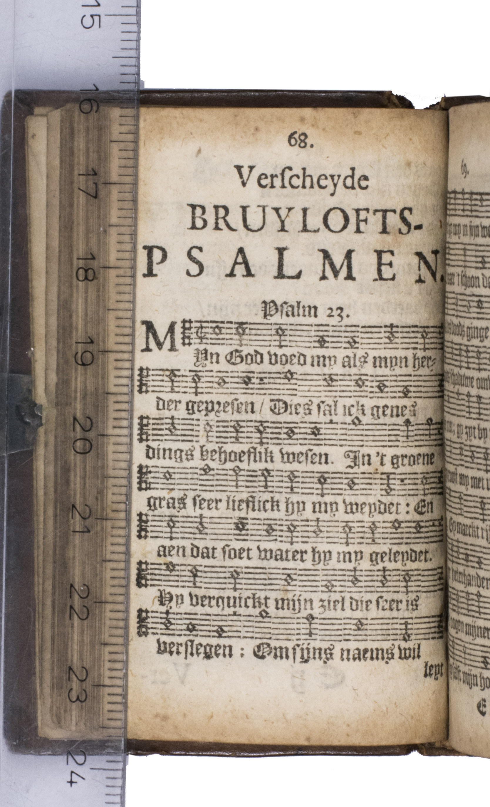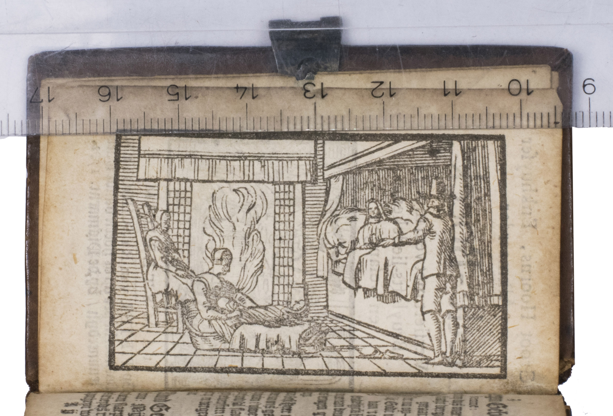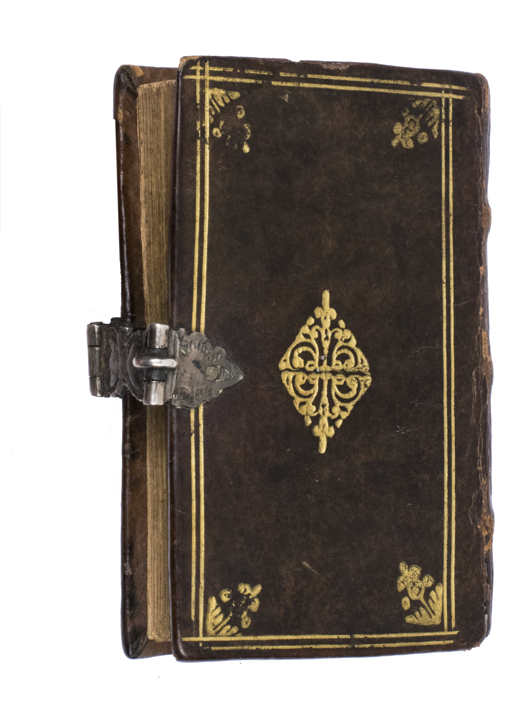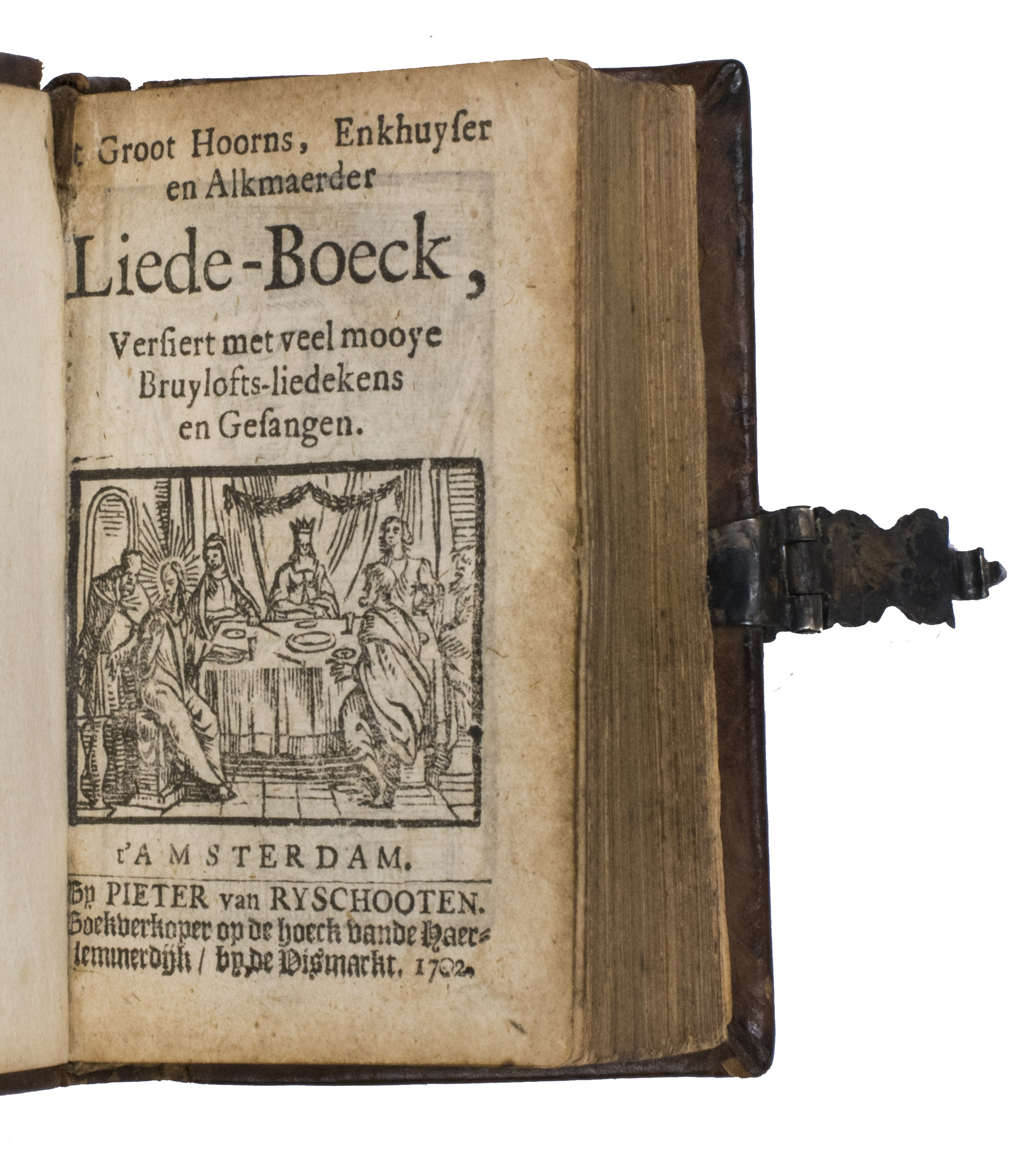 Amsterdam, Pieter van Ryschooten, 1702. 32mo. With a woodcut illustration on the title page, a full-page woodcut illustration on the verso of the title page, and musical annotation. Contemporary gold-tooled calf with a clasp. 310, [10] pp.