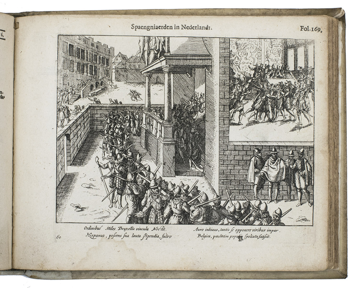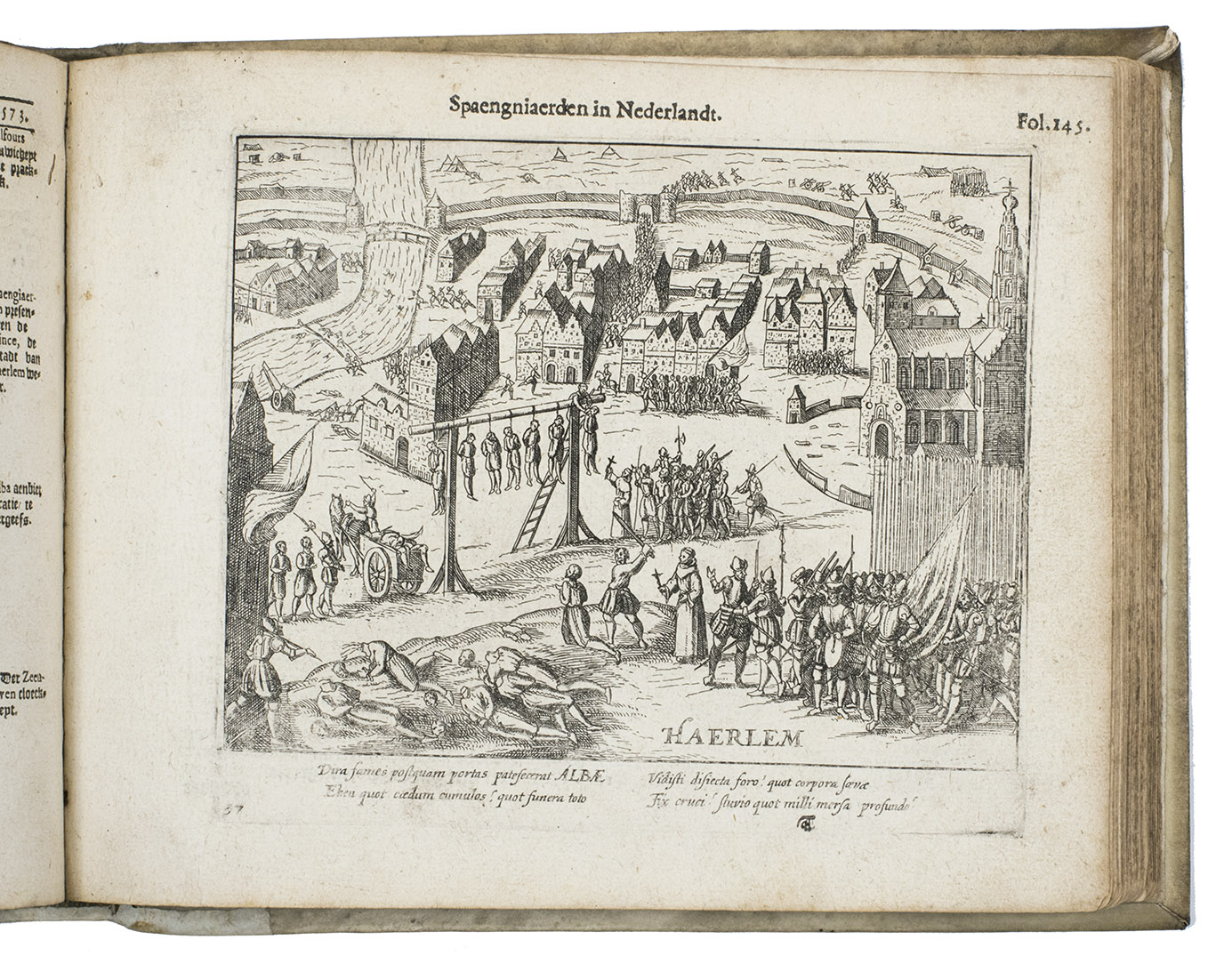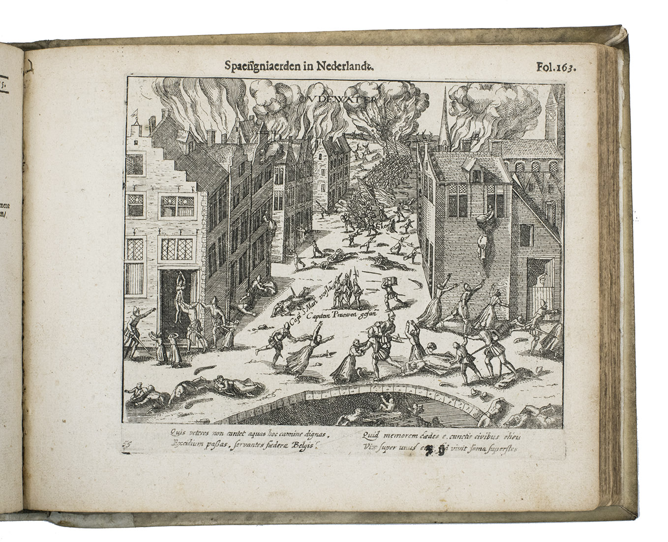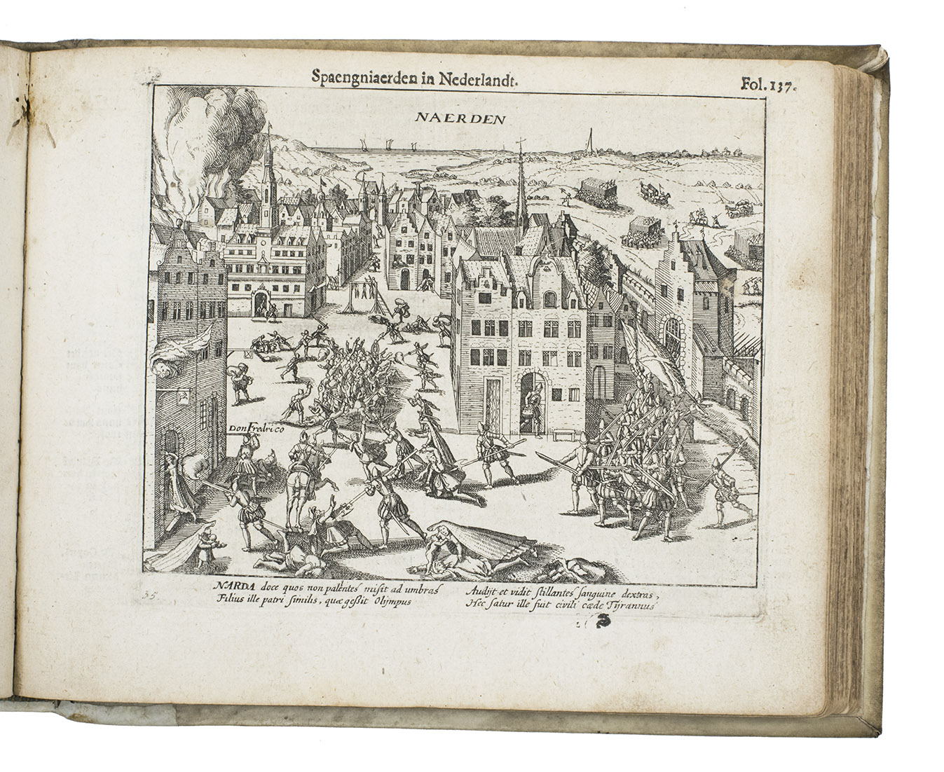 [Northern Netherlands (Amsterdam?)], [printed by Barent Otsz.?], 1621. Oblong 4to (18 x 22 cm). With an integral engraved frontispiece (15.5 x 20 cm, with 1 large and 3 small views of Spanish atrocities), letterpress title-page with a small bear as ornament (a mounted casting made from a woodcut), 36 full-page engraved city views on integral leaves showing Spanish atrocities (plate size about 13.5 x 16.5 cm, irregularly numbered 3 to 236 and not quite in numerical order), each with a 4-line Latin caption engraved in 2 columns, and 3 engraved portraits on integral leaves (plate size 14 x 12.5 cm). Early 18th-century vellum, sewn on 3 vellum tapes laced through the joints. [8], 278 pp.