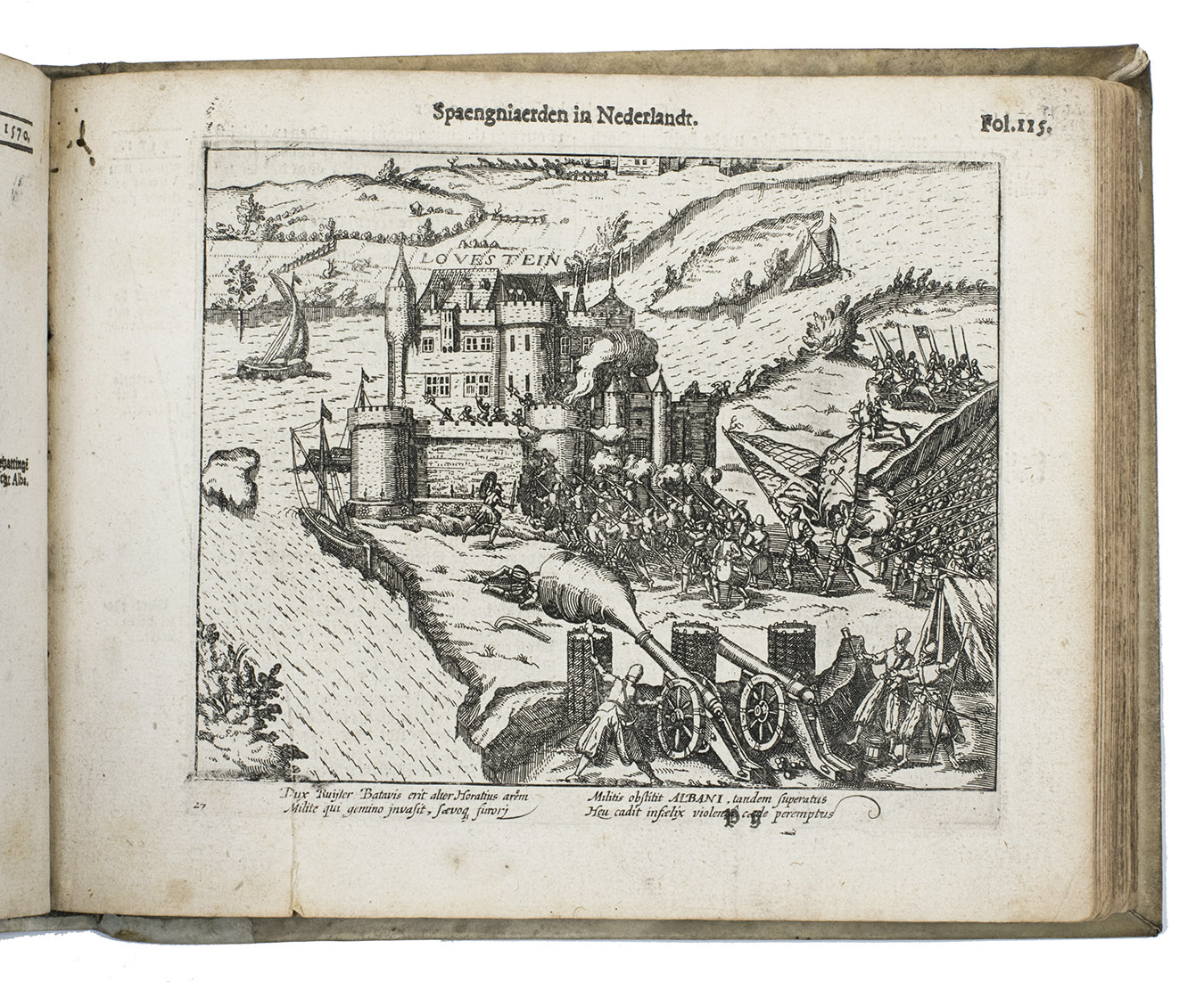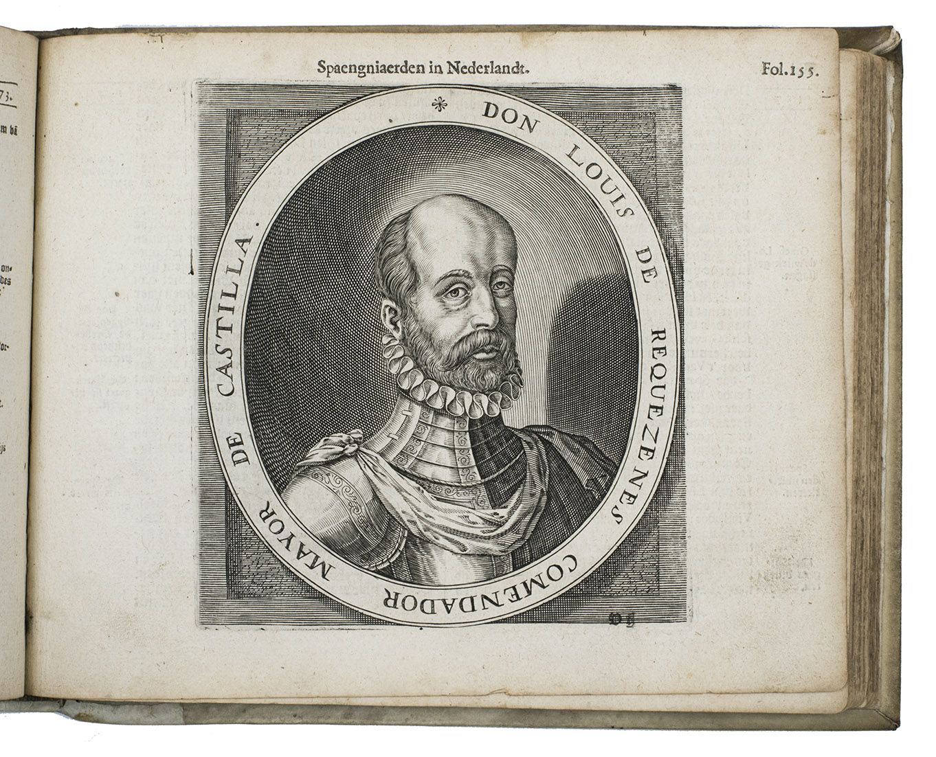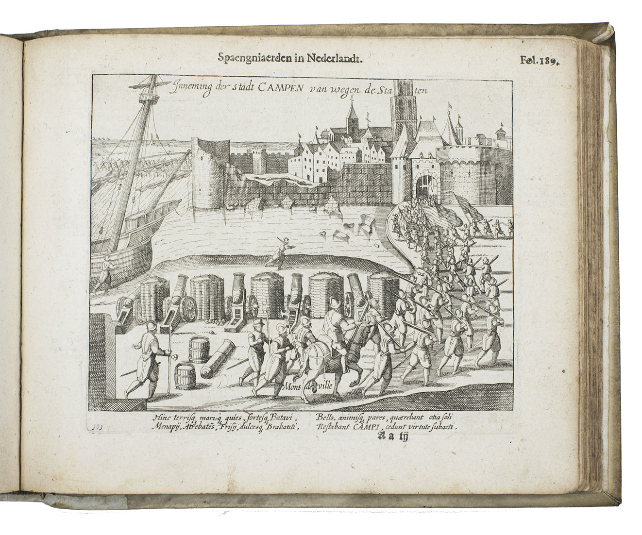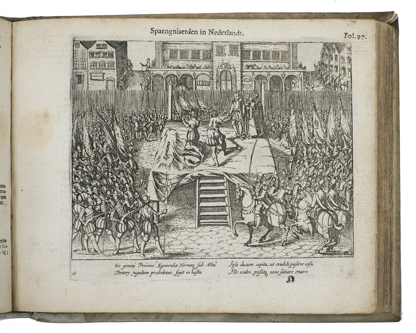 [Northern Netherlands (Amsterdam?)], [printed by Barent Otsz.?], 1621. Oblong 4to (18 x 22 cm). With an integral engraved frontispiece (15.5 x 20 cm, with 1 large and 3 small views of Spanish atrocities), letterpress title-page with a small bear as ornament (a mounted casting made from a woodcut), 36 full-page engraved city views on integral leaves showing Spanish atrocities (plate size about 13.5 x 16.5 cm, irregularly numbered 3 to 236 and not quite in numerical order), each with a 4-line Latin caption engraved in 2 columns, and 3 engraved portraits on integral leaves (plate size 14 x 12.5 cm). Early 18th-century vellum, sewn on 3 vellum tapes laced through the joints. [8], 278 pp.
