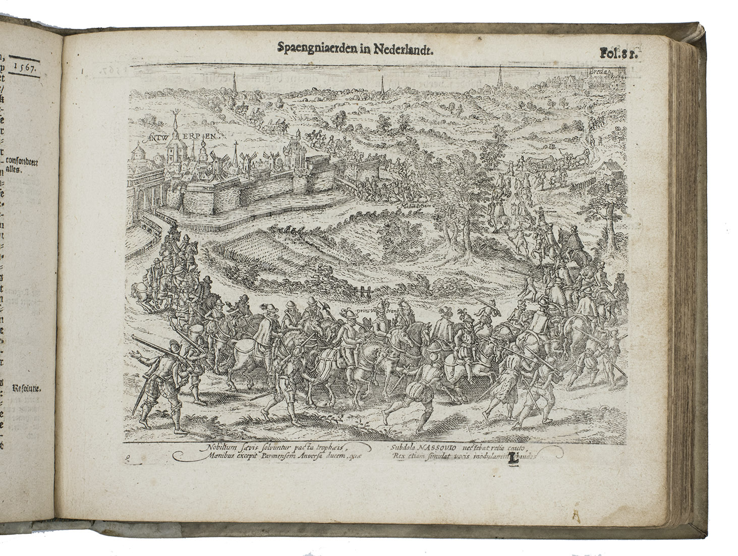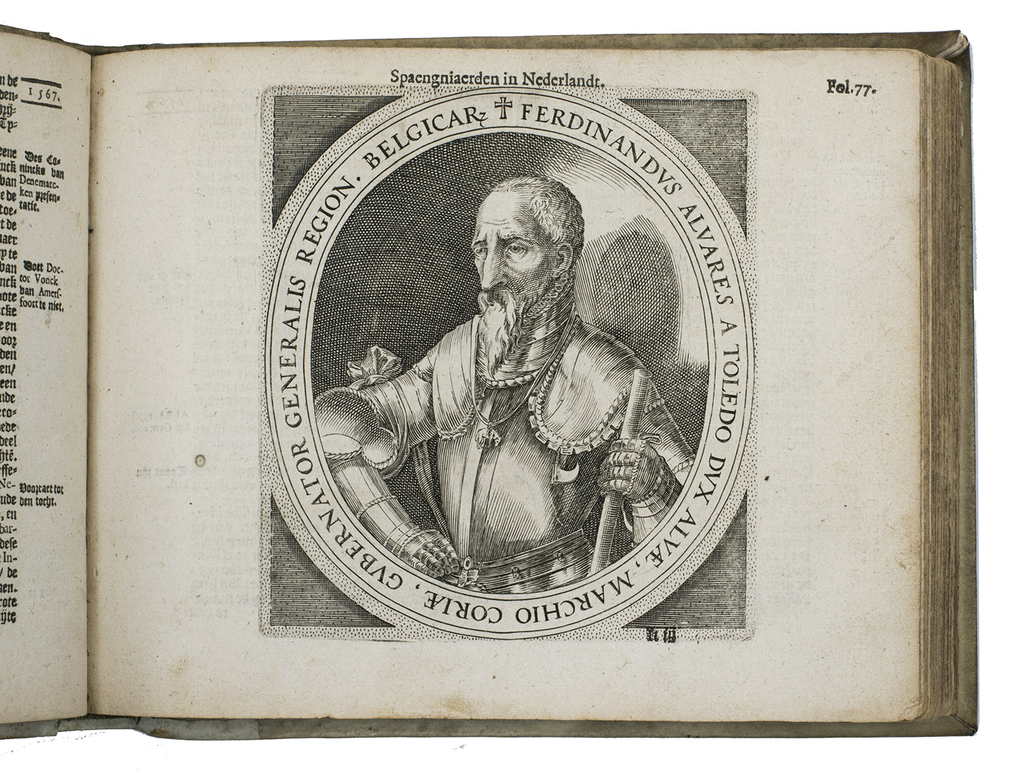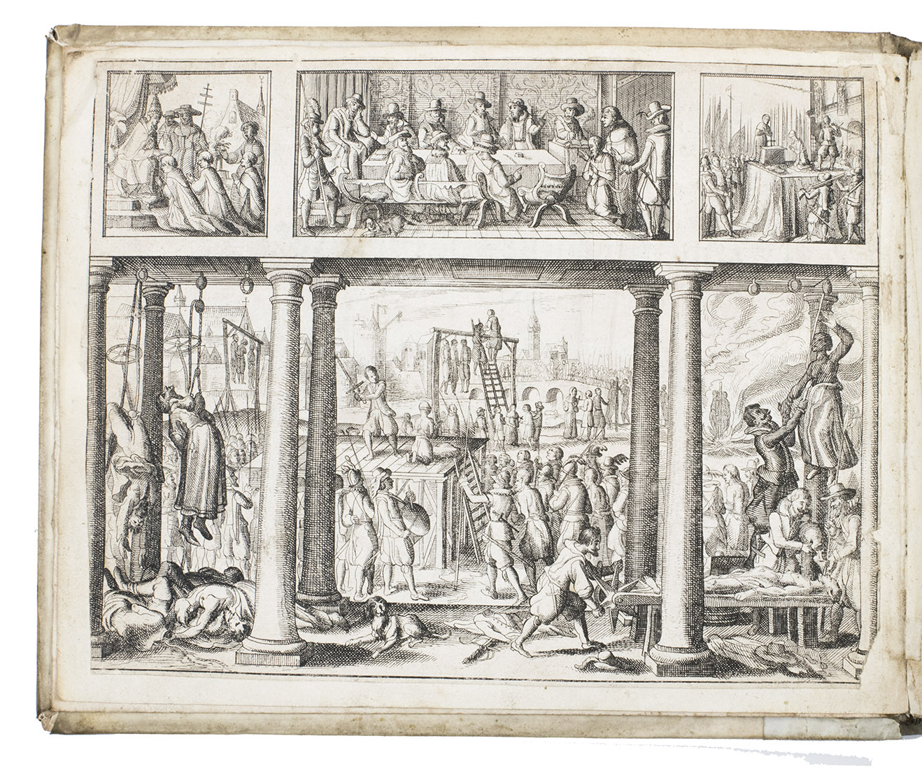 Rare complete copy of the first and only edition of a passionate and thoroughly illustrated chronicle of the atrocities committed by Spain in the Low Countries. Although it includes an account under the date 1396 and reports various events from 1518 to 1555 (the title-page indicates that it begins with the reign of the Holy Roman Emperor Charles V, which would be 1519), it quickly moves forward to the accession of King Philip II of Spain in 1556 and his draconian oppression of Protestants and of those who opposed Spanish rule in the Low Countries. It continues up to 1609, when Spain and the Netherlands agreed to a twelve-years' truce in the Eighty Years' War. The occasion for the publication was the expiration of that truce in 1621 and the resumption of the war. As a political polemic, it aimed to remind people of Spain's offenses, stoke fear and incite anti-Spanish feelings to gain support for the war. The Spanish atrocities (bad enough from any point of view) are therefore depicted as brutally and offensively as possible, both in words and in images. It includes many images of Spanish soldiers in armour torturing, mutilating (sometimes sexually) and slaughtering often naked men, women and children, and attacking and presumably raping women. It also depicts numerous sieges and battles from the first half of the Eighty Years' War and a few diplomatic events. The three portraits show the notorious governor of the Spanish Netherlands, Fernando, Grand Duke of Alba (1507-1582), his more moderate successor Luis de Requesens (1528-1576), and the murdered father of free Dutch Republic Willem de Zwijger (William the Silent), Prince of Orange (1533-1584). The lower two-thirds of the frontispiece shows a view through a colonade, with people being hanged, beheaded, burned at the stake, stretched on a rack (while one man tightens the rack, another forces water or worse down the victim's throat), one man hangs upside down from his knees, a woman hangs by her breasts, another (dark-skinned?) woman is held aloft, perhaps about to be impaled and bodies lie piled on the ground. Three smaller scenes above show an audience with the pope, a diplomatic(?) meeting around a table and an execution by beheading. The book offers an unambiguous picture of what the people of the Low Countries can expect if they again fall under Spanish rule.