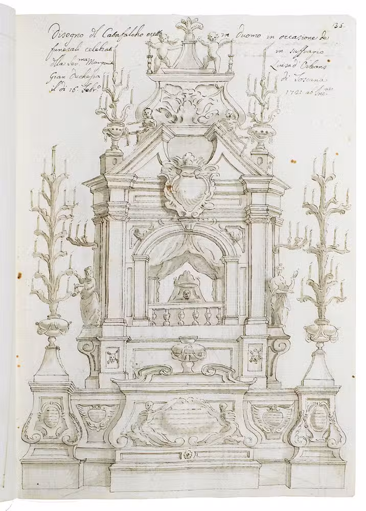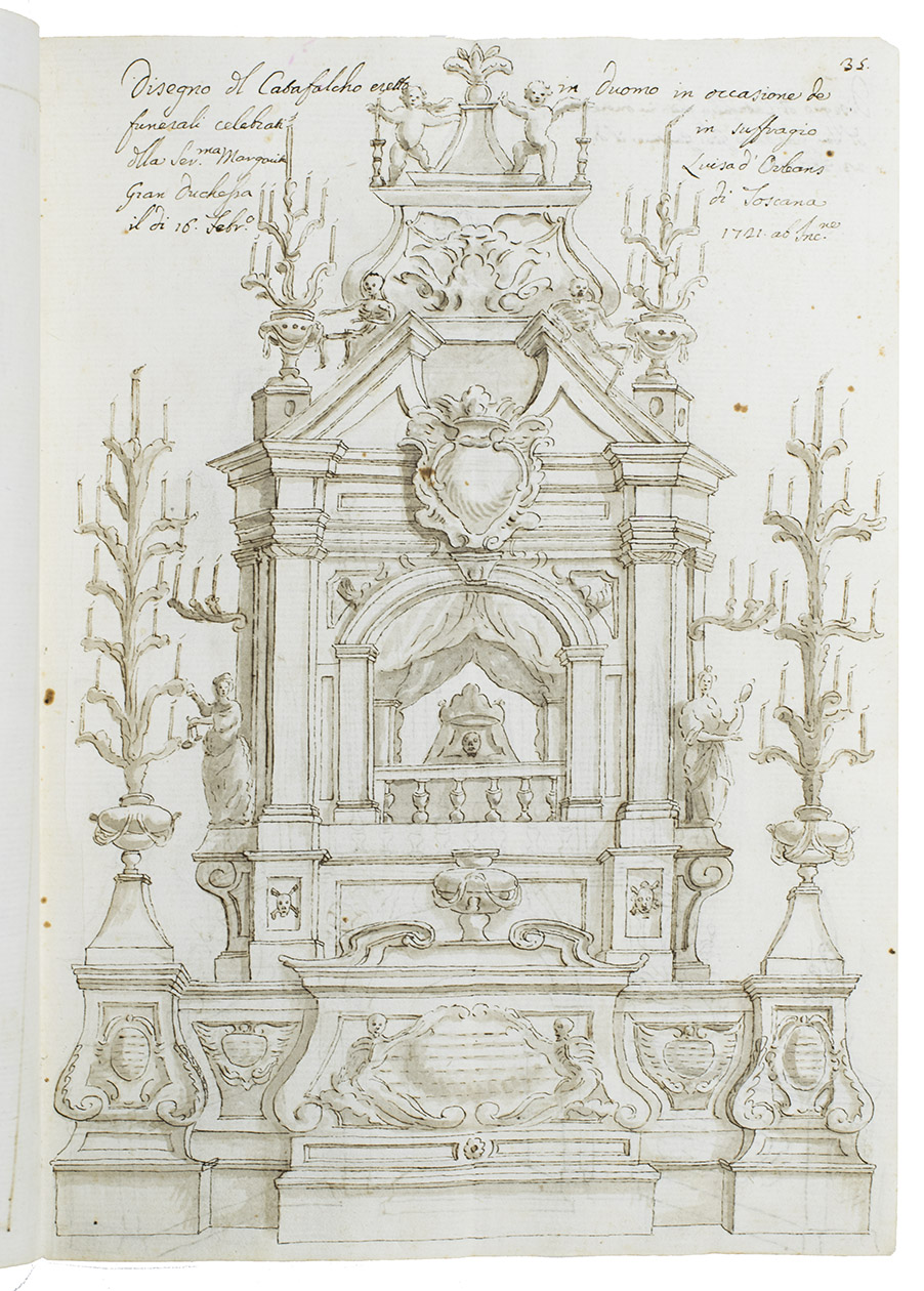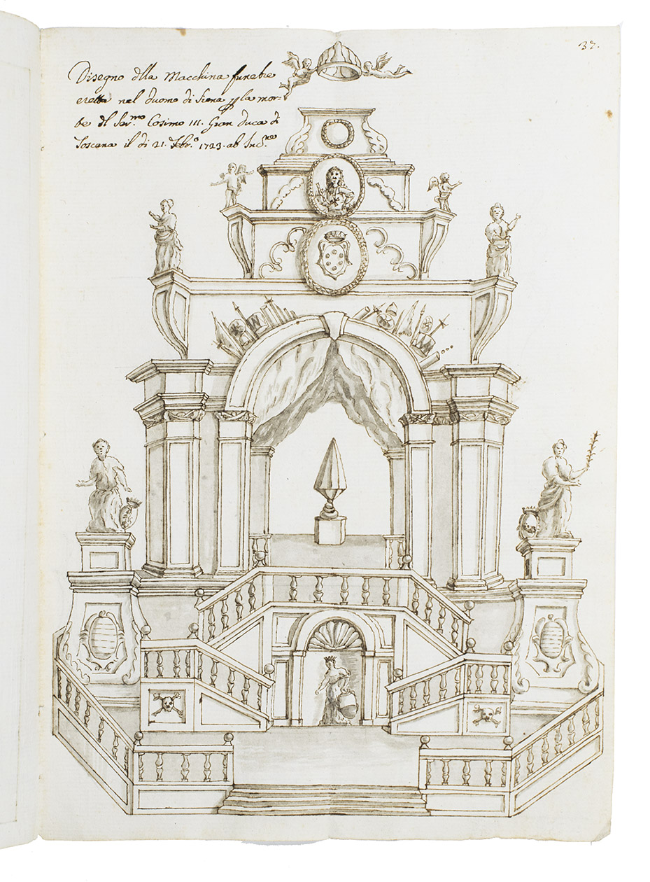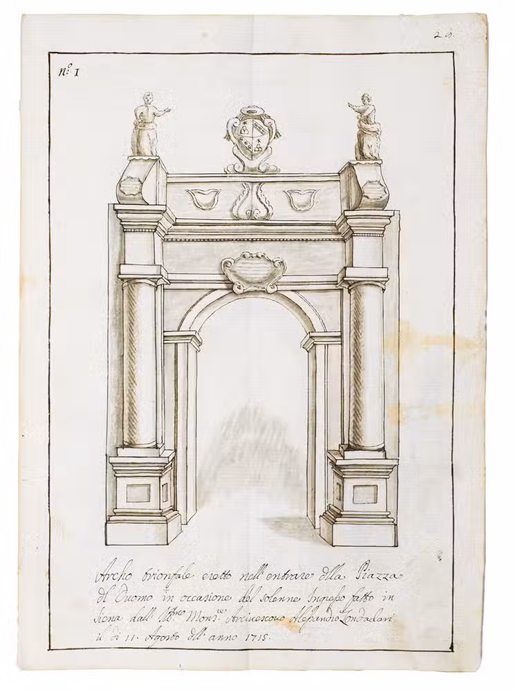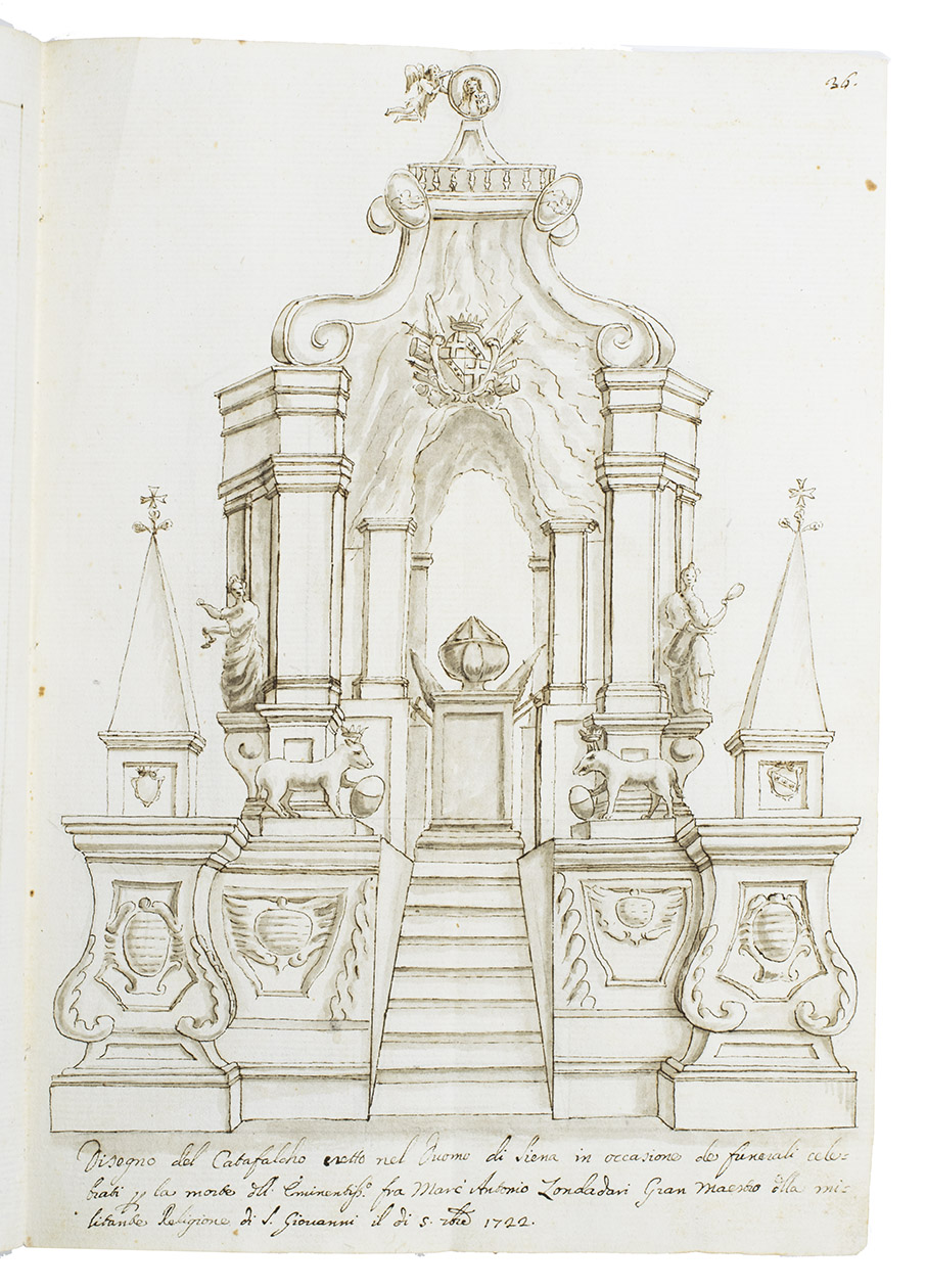 Original ink and ink-wash drawings of 5 triumphal arches and 3 catafalques (elaborate funeral biers), plus an additional line drawing of a 4th catafalque on the back of one leaf, all erected at various locations in the city of Siena in Tuscany: in the cathedral, in the piazza before the cathedral, in Palazzo Piccolomini and at the Porta Santuccio. The drawings are richly decorated with sculptures, bas-reliefs, columns, cartouches, vases, candelabras and decorations, including Christian and classical figures and putti. The five triumphal arches were all erected for the occasion of the entry of Alessandro Zondadari (1670-1745), the new archbishop of Sienna on 11 August 1715. He was the fourth and last son of Ansano Zondadari and Agnese di Mario Chigi. She was a niece of Pope Alexander VII and heir of her brother Cardinal Flavio Chigi, one of the most influential and powerful men in Siena. One catafalque was erected for the funeral of Alessandro Zondadari's older brother Marc' Antonio Zondadari (1658-1722), Grand Master of the Sovereign Military and Hospitaller Order of Knights of St. John of Jerusalem and Malta.