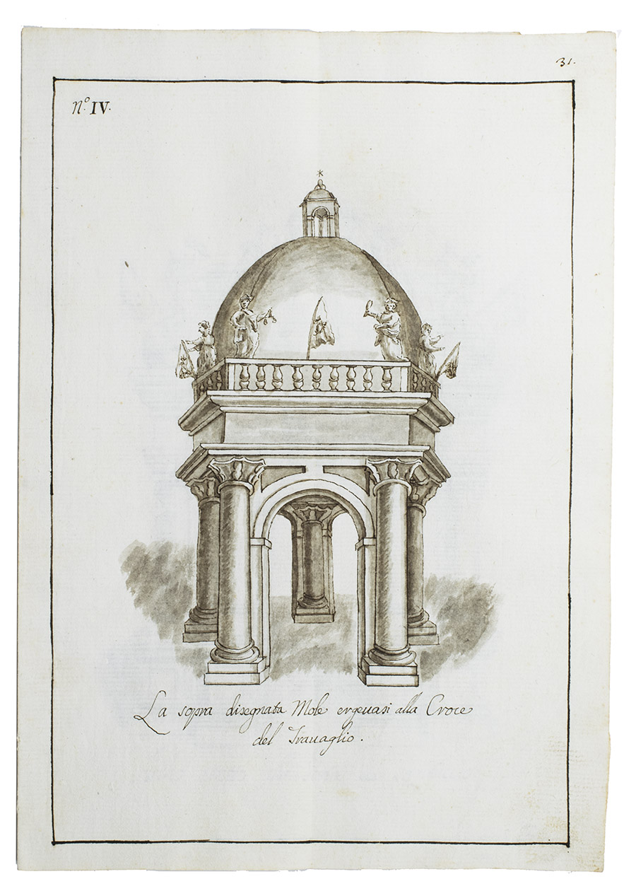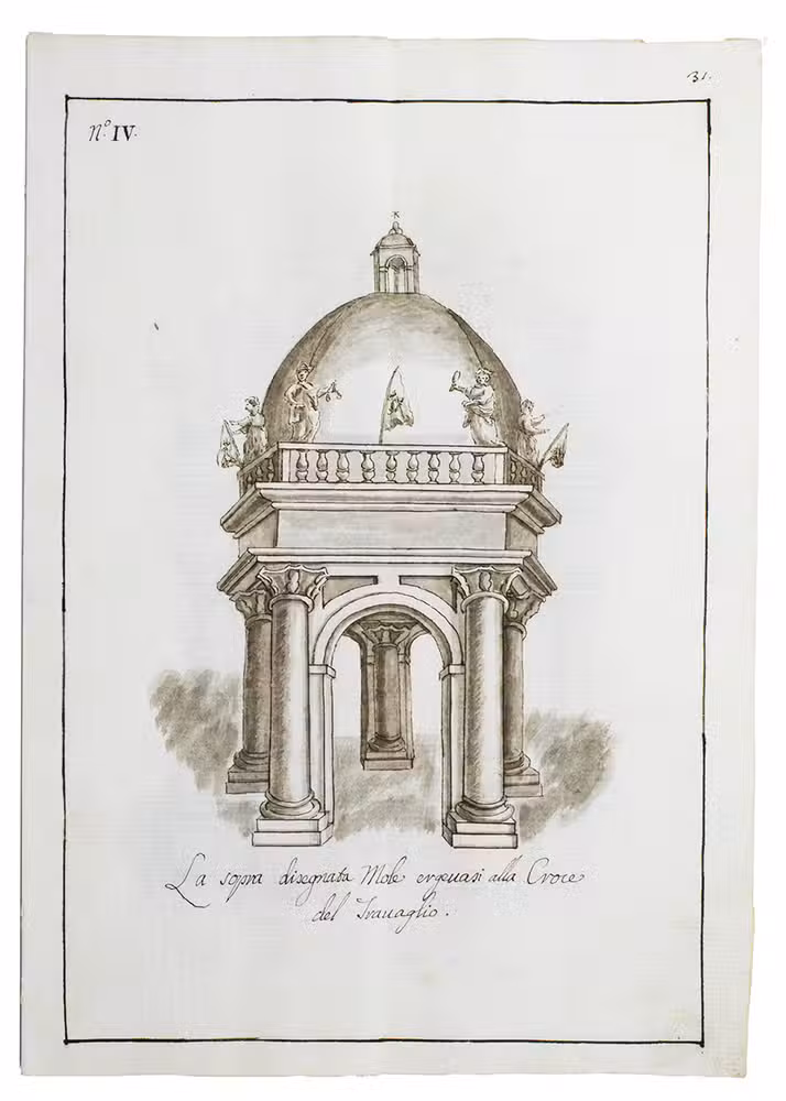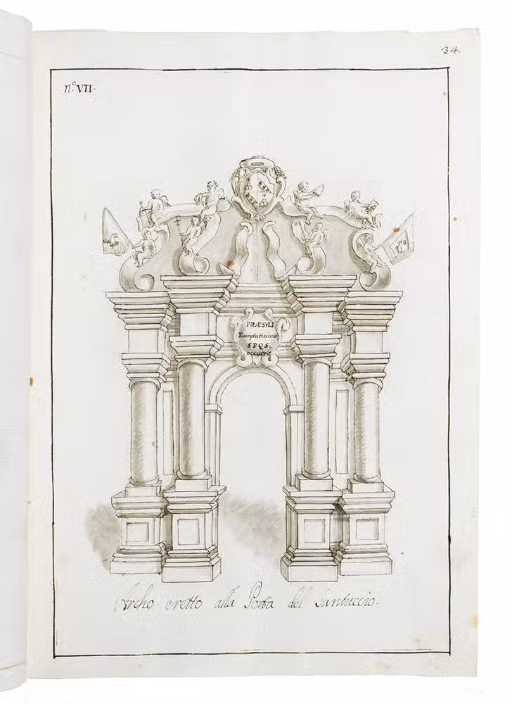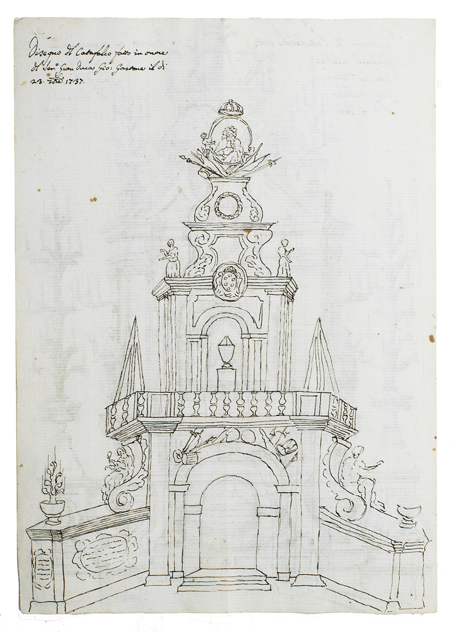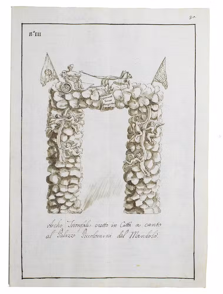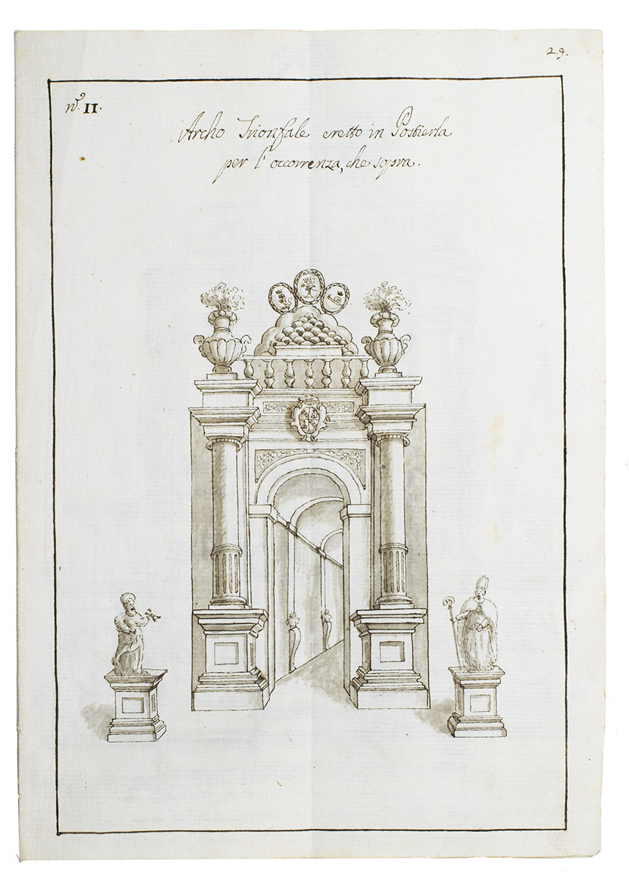 Original ink and ink-wash drawings of 5 triumphal arches and 3 catafalques (elaborate funeral biers), plus an additional line drawing of a 4th catafalque on the back of one leaf, all erected at various locations in the city of Siena in Tuscany: in the cathedral, in the piazza before the cathedral, in Palazzo Piccolomini and at the Porta Santuccio. The drawings are richly decorated with sculptures, bas-reliefs, columns, cartouches, vases, candelabras and decorations, including Christian and classical figures and putti. The five triumphal arches were all erected for the occasion of the entry of Alessandro Zondadari (1670-1745), the new archbishop of Sienna on 11 August 1715. He was the fourth and last son of Ansano Zondadari and Agnese di Mario Chigi. She was a niece of Pope Alexander VII and heir of her brother Cardinal Flavio Chigi, one of the most influential and powerful men in Siena. One catafalque was erected for the funeral of Alessandro Zondadari's older brother Marc' Antonio Zondadari (1658-1722), Grand Master of the Sovereign Military and Hospitaller Order of Knights of St. John of Jerusalem and Malta.