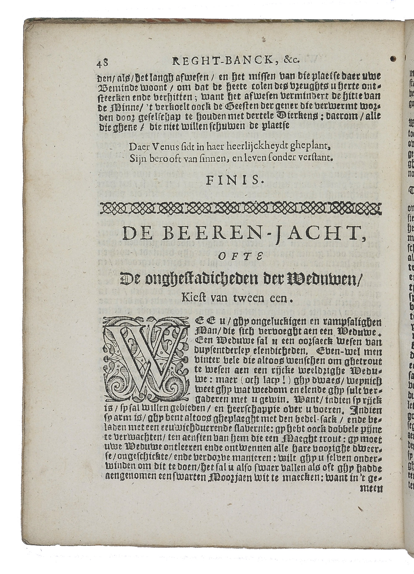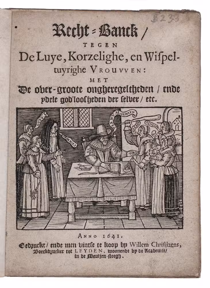 Leiden, Willem Christiaens van der Boxe, 1641. Small 4to (18.5 x 14 cm). With a woodcut on the title-page showing several women assaulting and name-calling a writer. Decorated paper over boards (ca. 1900). [3], [1 blank], [14], 53, [1 blank] pp.