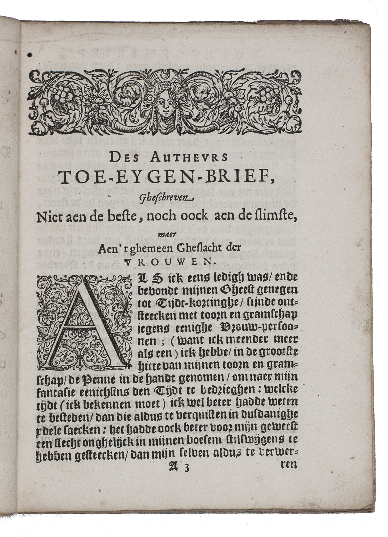 Very rare first edition in Dutch of The araignment of lewde, idle, forward, and unconstant women, a popular misogynistic pamphlet originally published in English in 1615. "Attacks on women (and defences of them) had been an established pamphlet genre for decades ... and the Araignment owes its predecessors an immense (if unacknowledged) debt, for ideas and for whole sentences. What does distinguish the Araignment is the comprehensiveness of its attack on women, combined with an unprecedented level of vituperation ... While others may adopt a tone of ironic sophistication, or jocular rib-nudging, this author lacks sufficient control over his own style to indicate when and if he is assuming a pose" (Butler). Although the book contains numerous arguments drawn from the Bible and classical antiquity, Swetnam (d. 1621), a fencing master, was no scholar and stated in the introduction that he wrote for "the ordinary sort of giddy headed young men". As his intended reader was either a bachelor or a newly-wed young man, most of Swetman's arguments are of an economic nature (mostly the spend-thrift wife) but he also discusses sexual promiscuity and nagging. Possibly due to its unscholarly nature, the pamphlet proved extremely popular and sparked numerous counter-pamphlets, some of them written by women. Swetnam's pamphlet even formed the inspiration for the comic play Swetnam the woman-hater arraigned by women (1620).