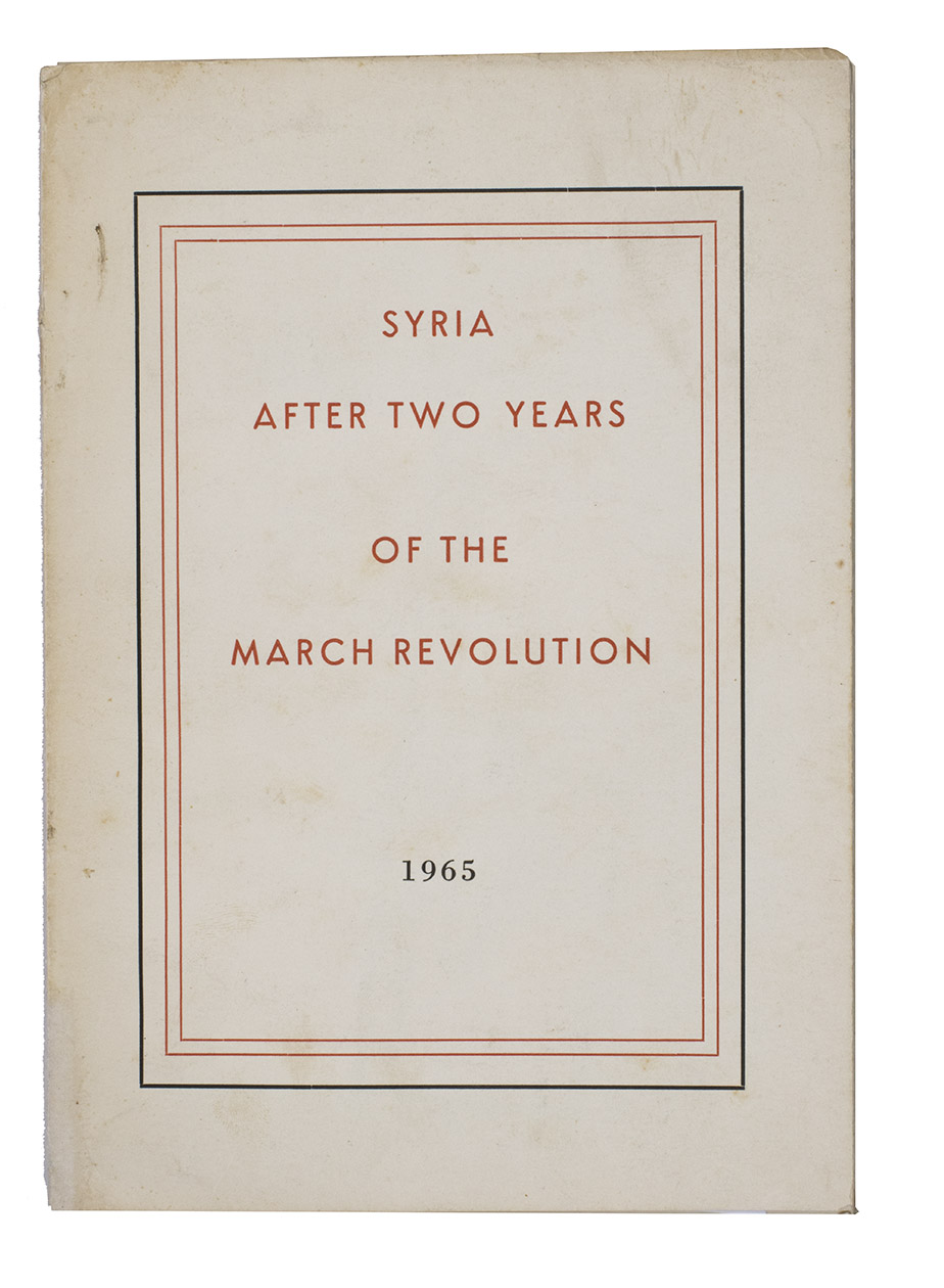 Propaganda from the Arab Socialist Ba'ath Party in Syria, presenting the successes of the new socialist government two years after the 8 March Revolution (or 1963 Syrian coup d'état). The propagandistic nature of the text already takes shape in the introduction. For example in the part of the text informing the reader of the contents of the present work: "The following chapters ignore plots and intrigues and limit themselves to the task of giving an accout [! (=account)] of the Revolution's achievements in the fields of socialism, democracy, industrialisation, agriculture and agrarian reform, trade unionism and other organisation of the people's activity, social, cultural and health welfare and related fields of public service".