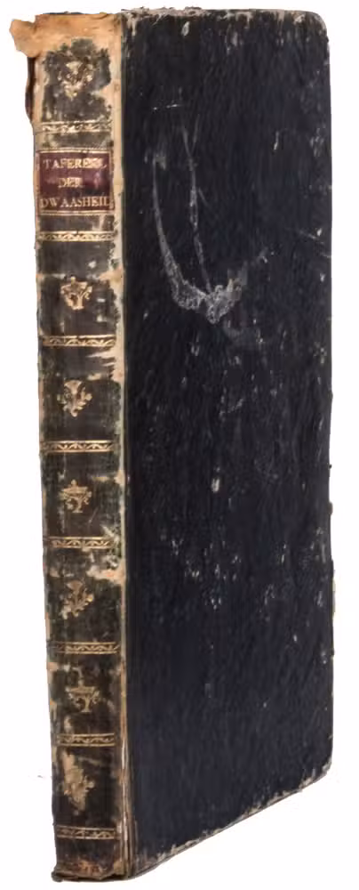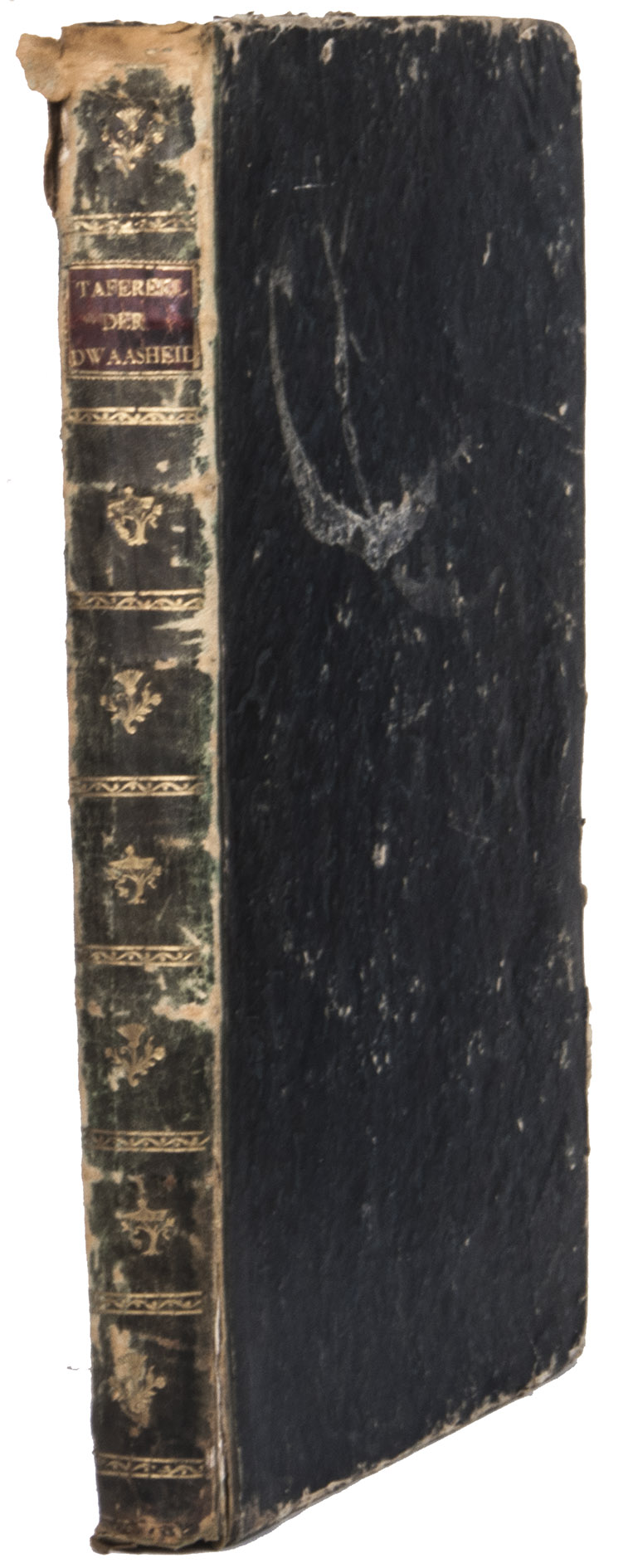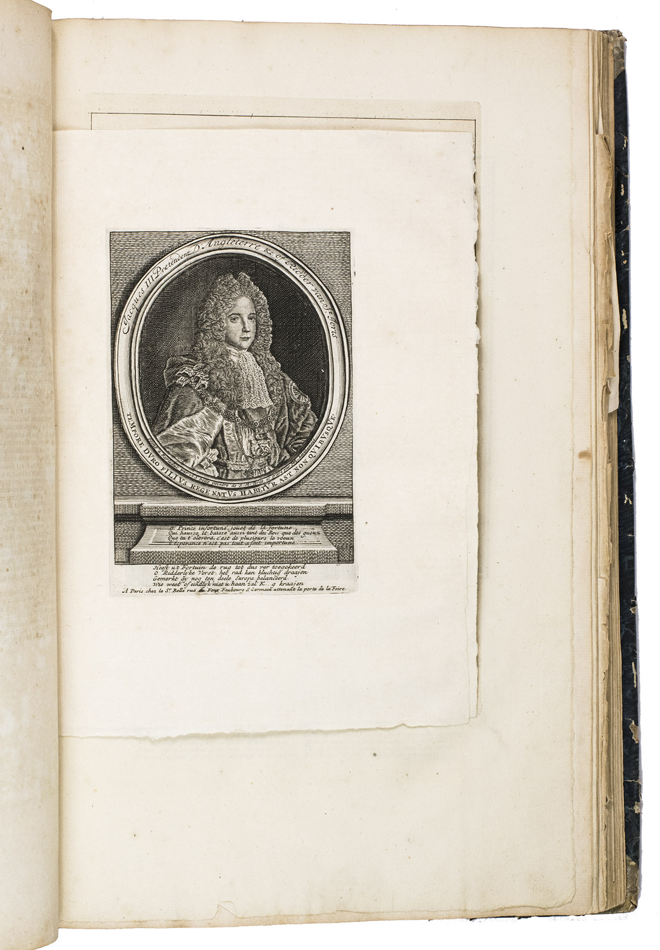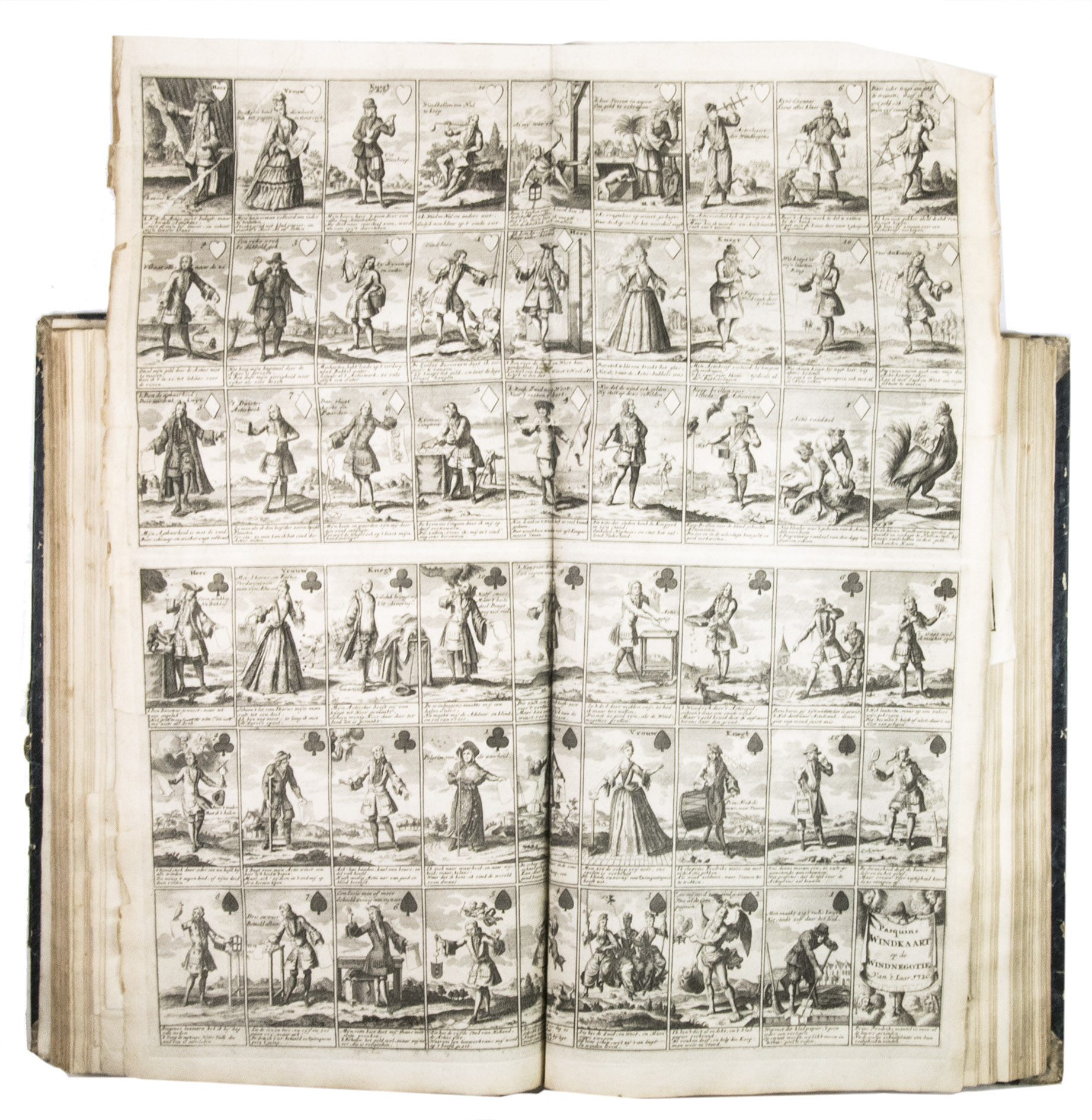 With the bookplate of B. Eveleigh Winthrop mounted on the front pastedown. The binding is worn. The text is partly browned, the plate with the playing cards has a large horizontal tear and the upper left corner has been torn off, but is still present. Otherwise a good copy. Cole, The great mirror of folly, nrs. 1-4, 6-8, 10-71, 73; Muller, Historieplaten 3535 ff.; Van Rijn, Atlas van Stolk, 3452 ff.; STCN 254984576; cf. (slightly differing collation or fingerprint) STCN 254984185, 293084076, 228136539.