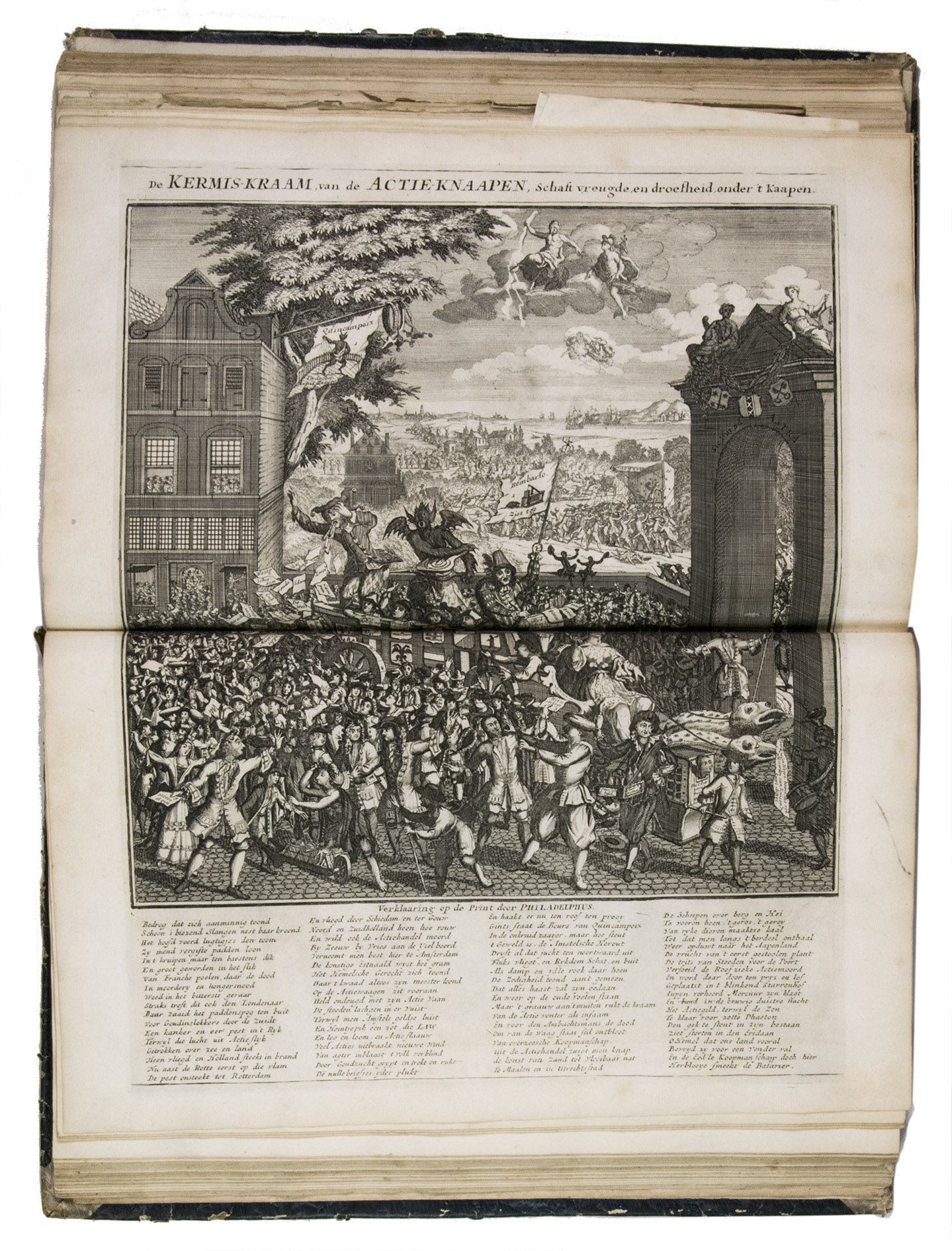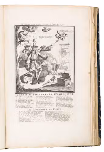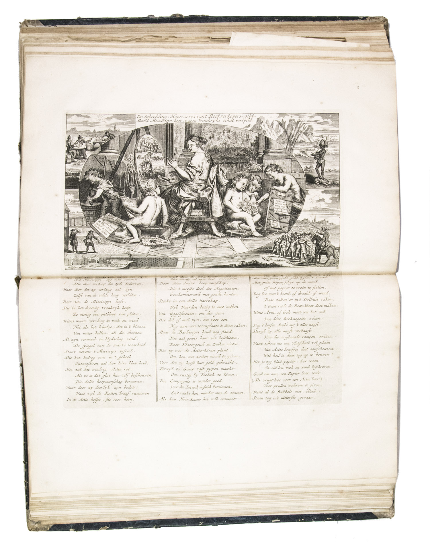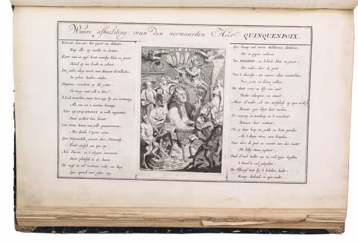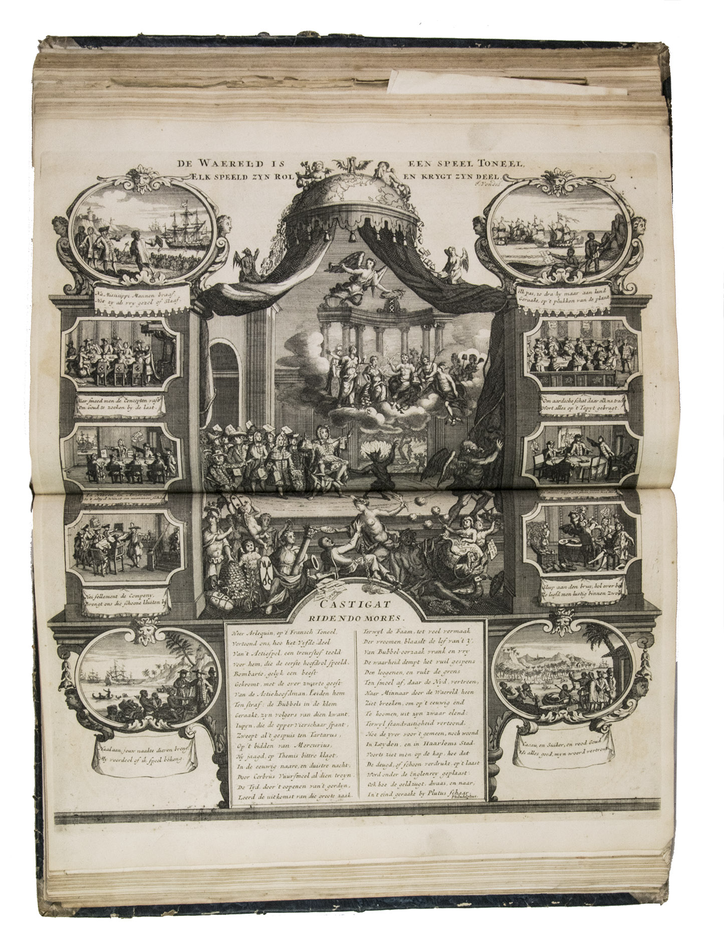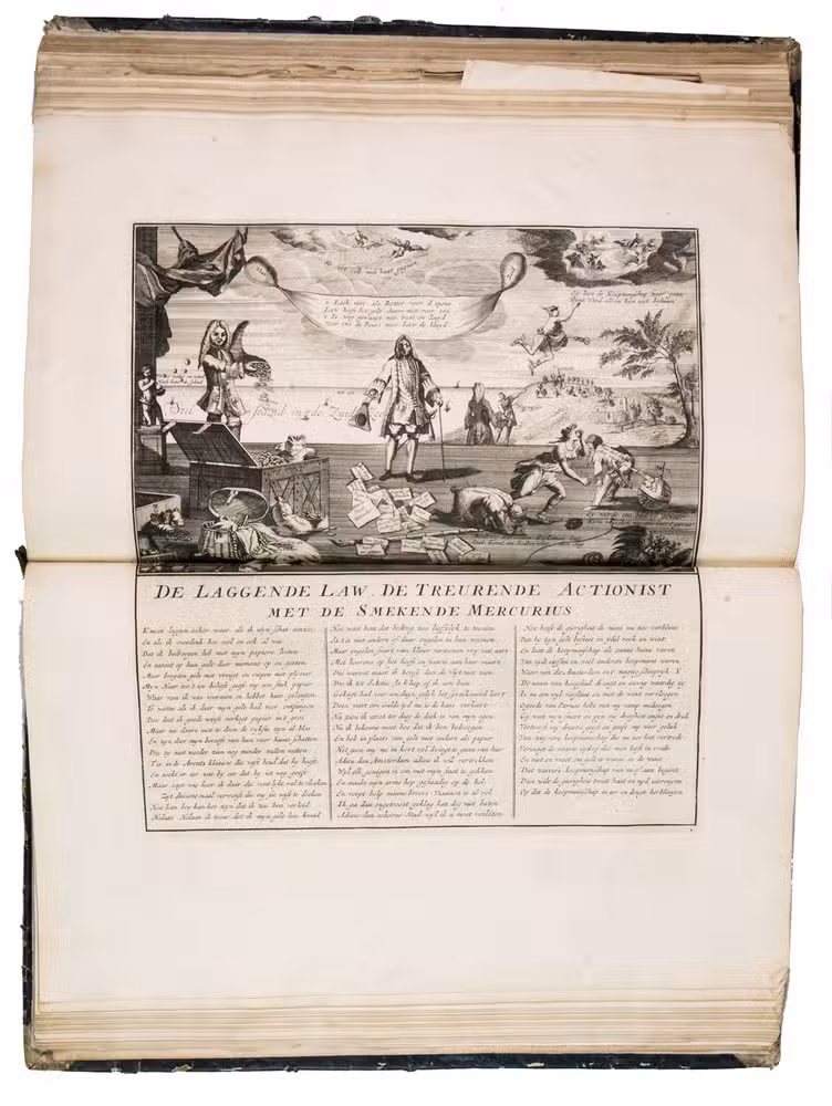 A famous collection of texts and plates satirising the Englishman John Law, his Mississippi Company, and the international land and trading speculation in worthless shares of the South Sea Bubble of 1719-1720, which resulted in an international scandal. The speculation began in Paris, London and Hamburg, spreading to the Netherlands in the summer of 1720. While plays satirizing the speculation already opened in September 1720, the bubble really burst in October. Pieter Langendijk and Gysbert Tysens have been identified as authors of some of the plays. The book also provides the texts of official documents relating to the Dutch trading companies involved.