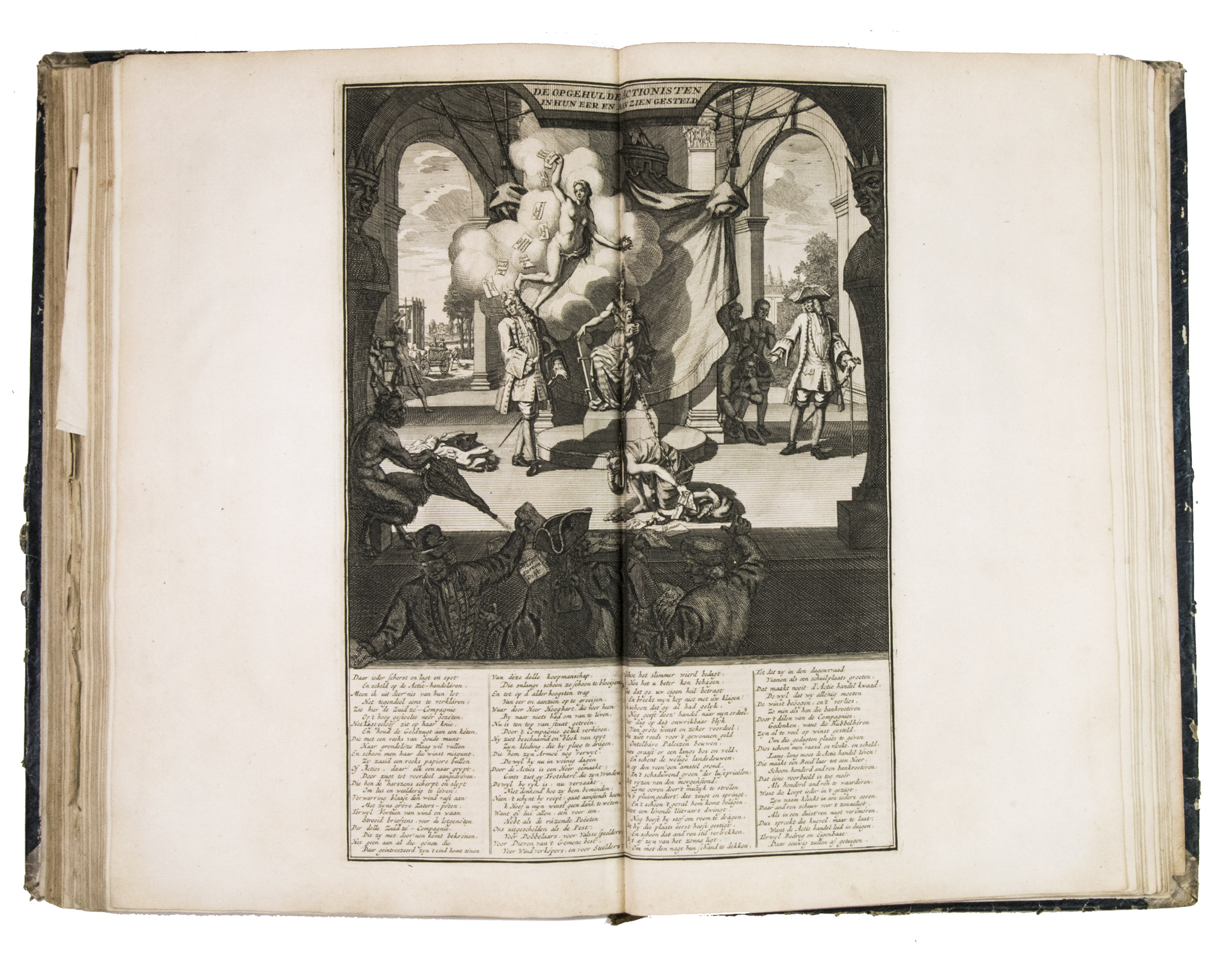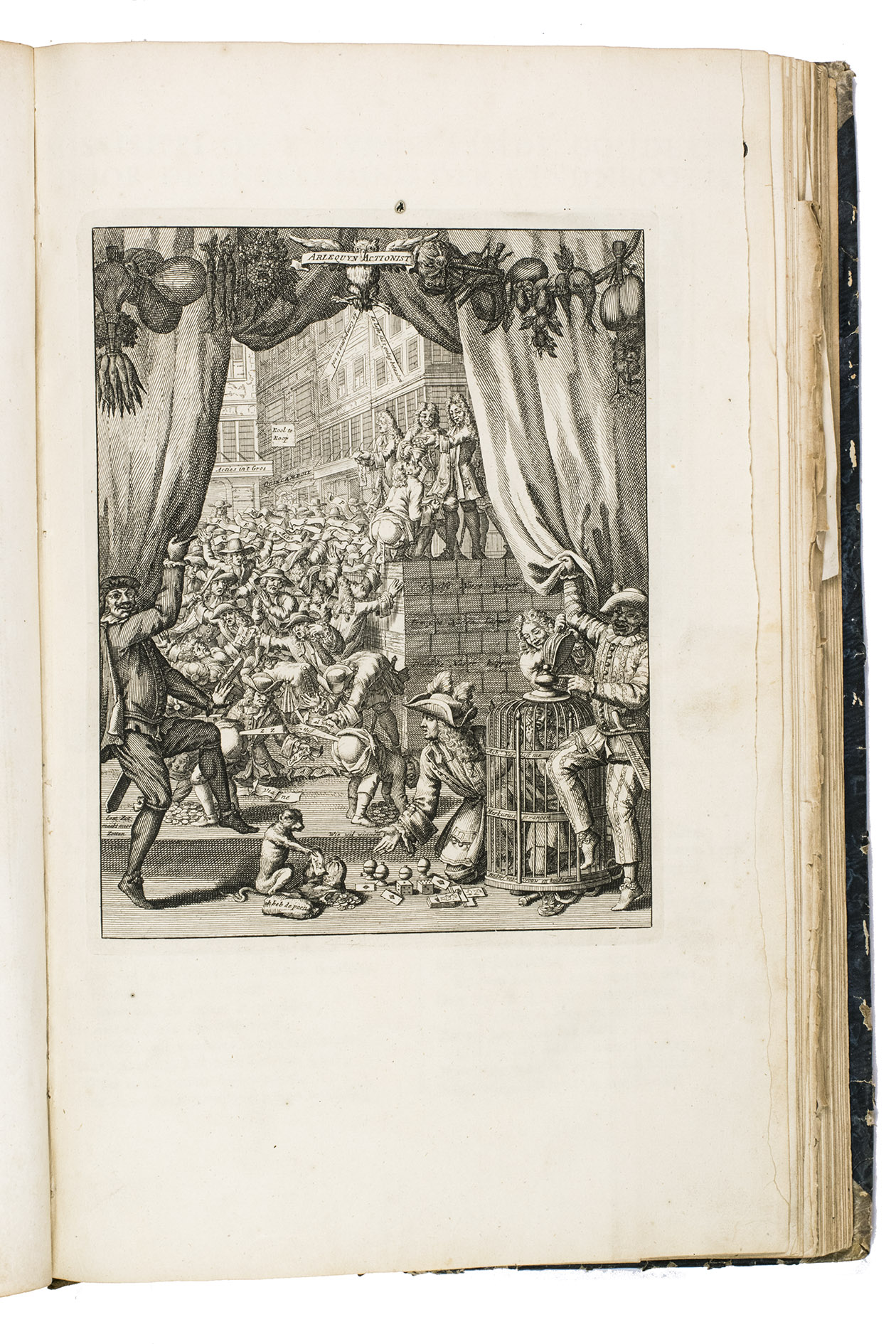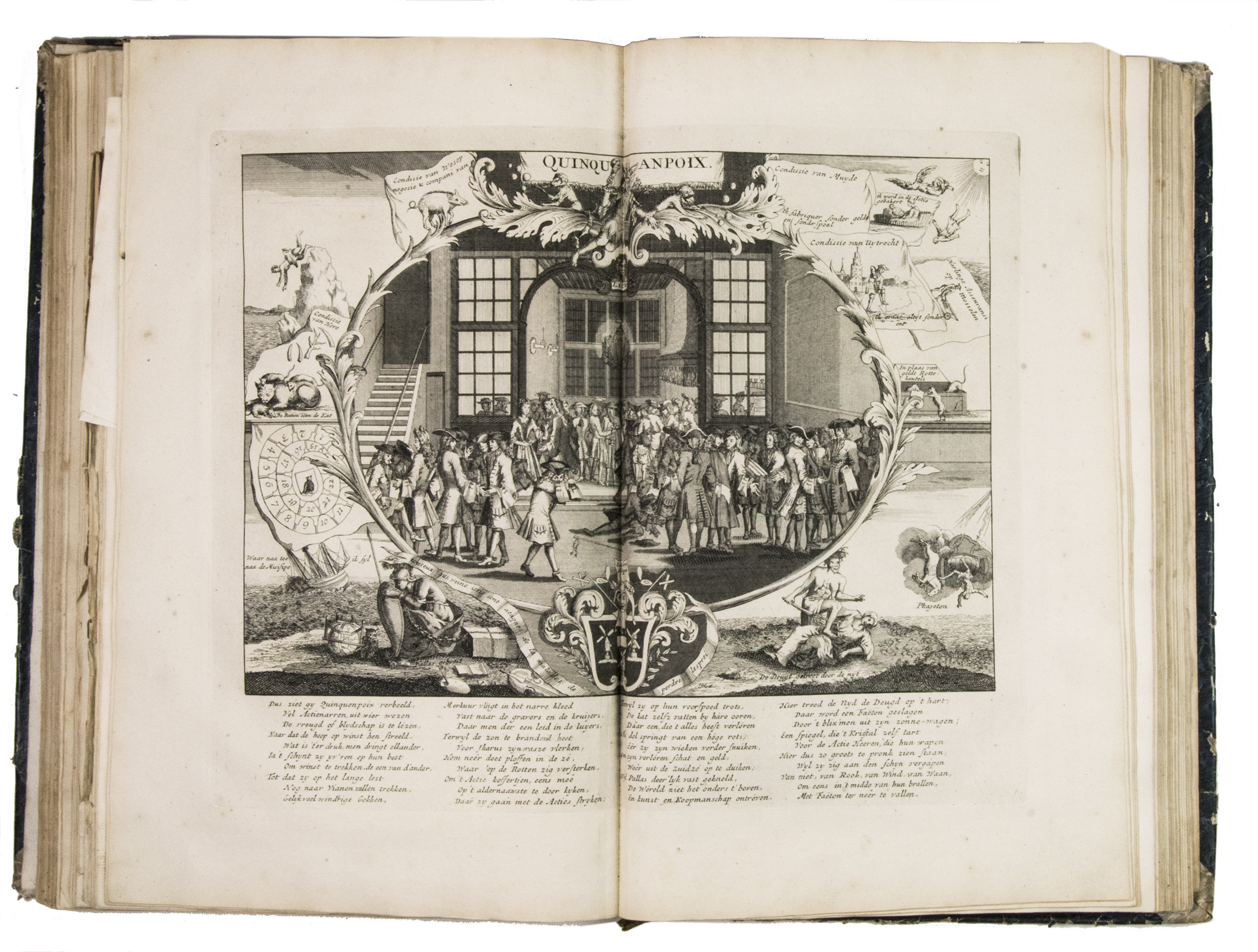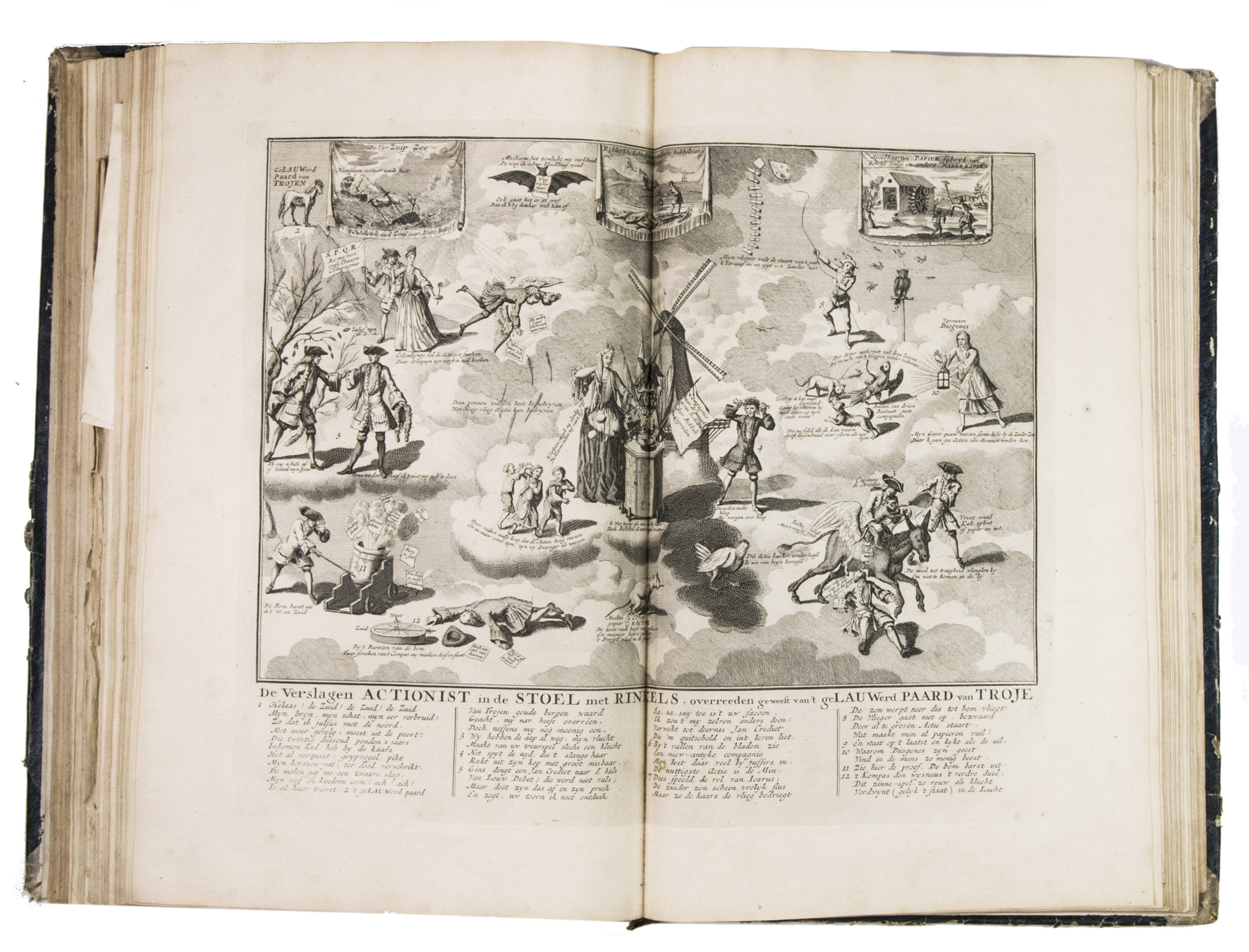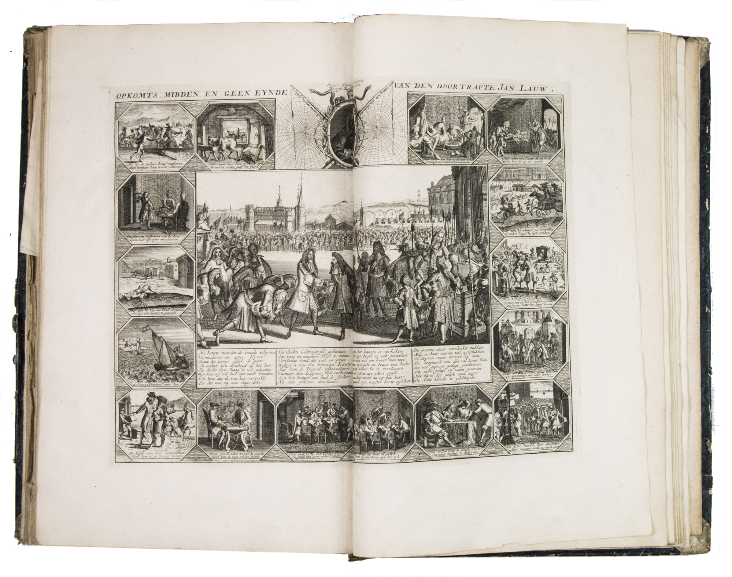 A famous collection of texts and plates satirising the Englishman John Law, his Mississippi Company, and the international land and trading speculation in worthless shares of the South Sea Bubble of 1719-1720, which resulted in an international scandal. The speculation began in Paris, London and Hamburg, spreading to the Netherlands in the summer of 1720. While plays satirizing the speculation already opened in September 1720, the bubble really burst in October. Pieter Langendijk and Gysbert Tysens have been identified as authors of some of the plays. The book also provides the texts of official documents relating to the Dutch trading companies involved.