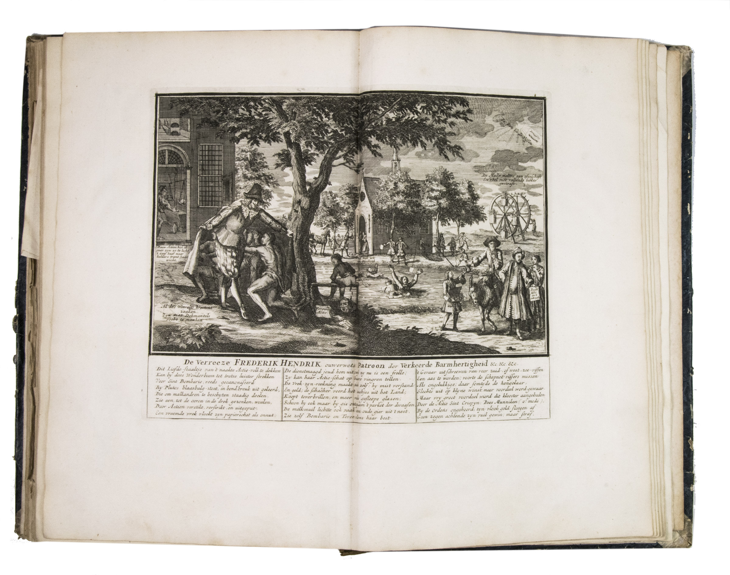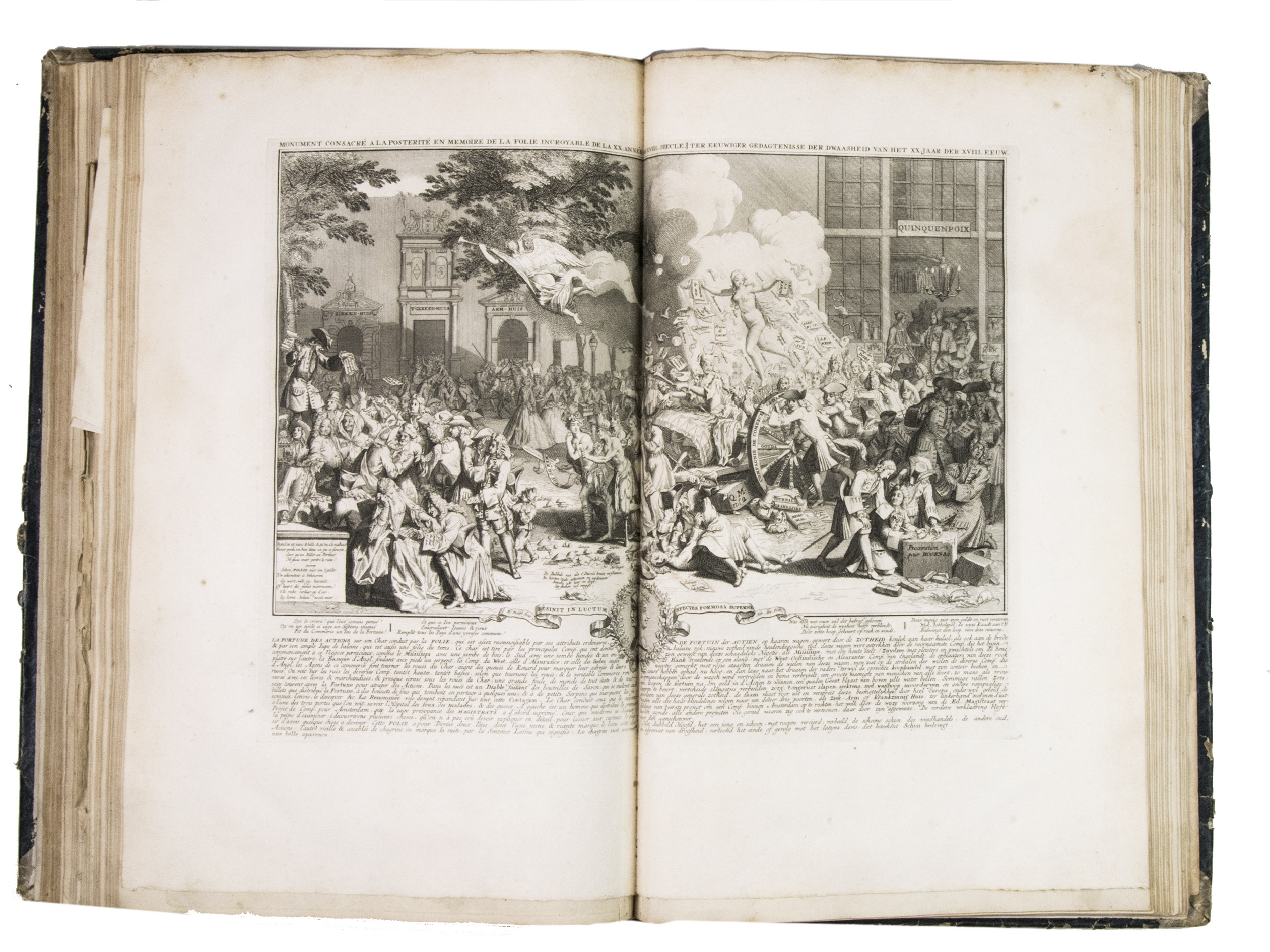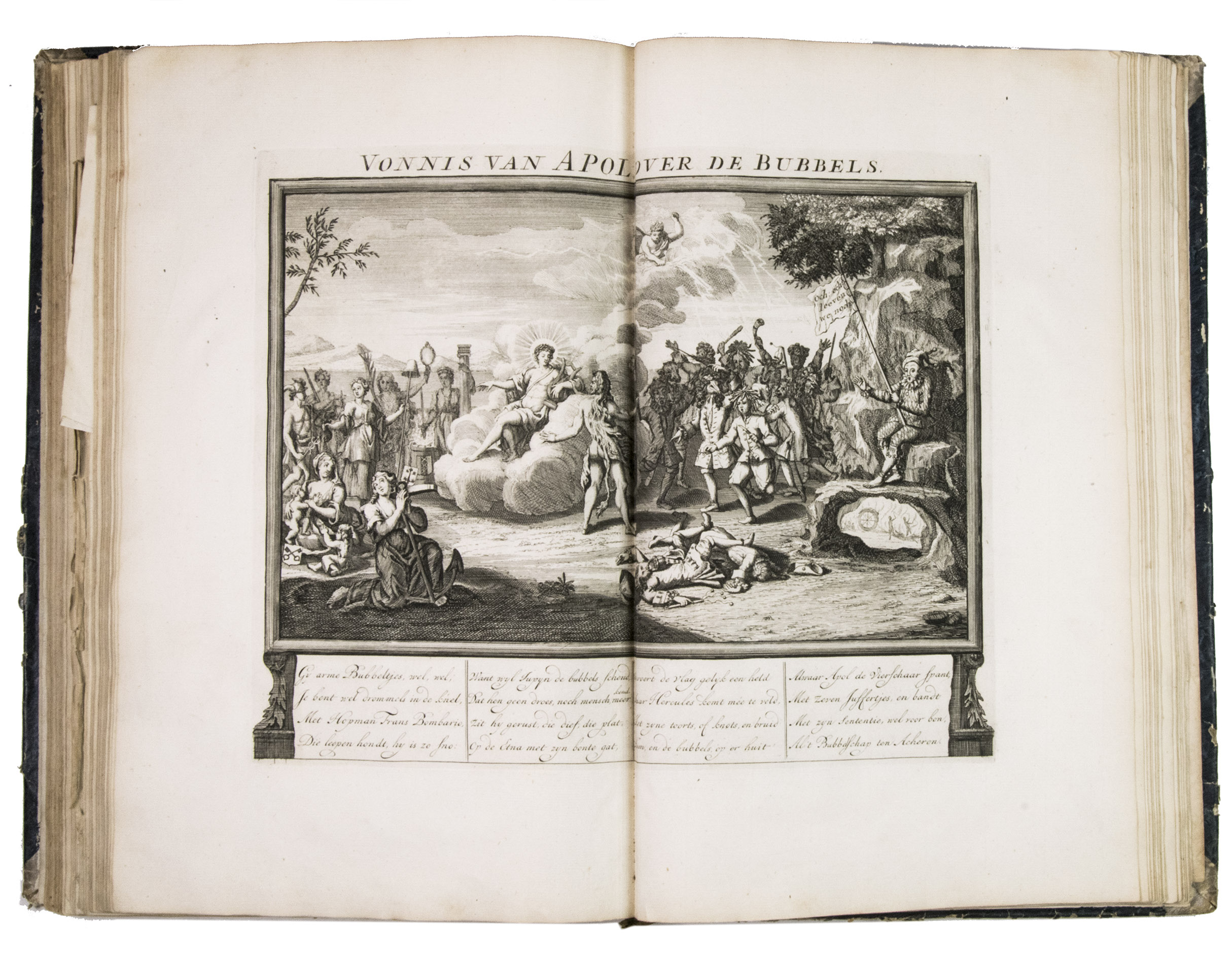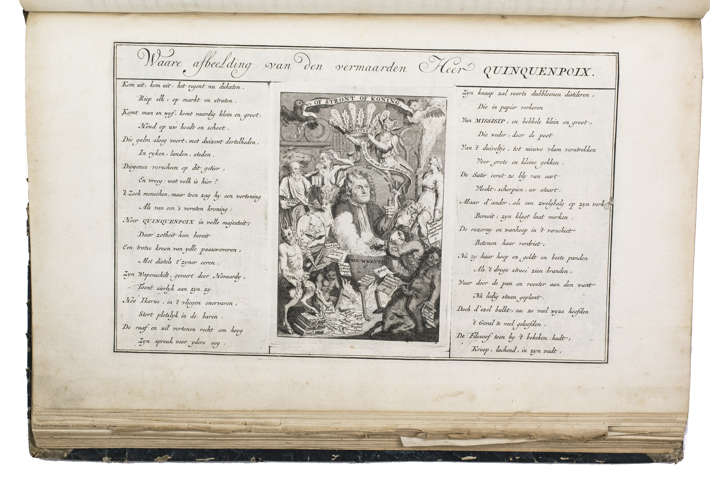A famous collection of texts and plates satirising the Englishman John Law, his Mississippi Company, and the international land and trading speculation in worthless shares of the South Sea Bubble of 1719-1720, which resulted in an international scandal. The speculation began in Paris, London and Hamburg, spreading to the Netherlands in the summer of 1720. While plays satirizing the speculation already opened in September 1720, the bubble really burst in October. Pieter Langendijk and Gysbert Tysens have been identified as authors of some of the plays. The book also provides the texts of official documents relating to the Dutch trading companies involved.