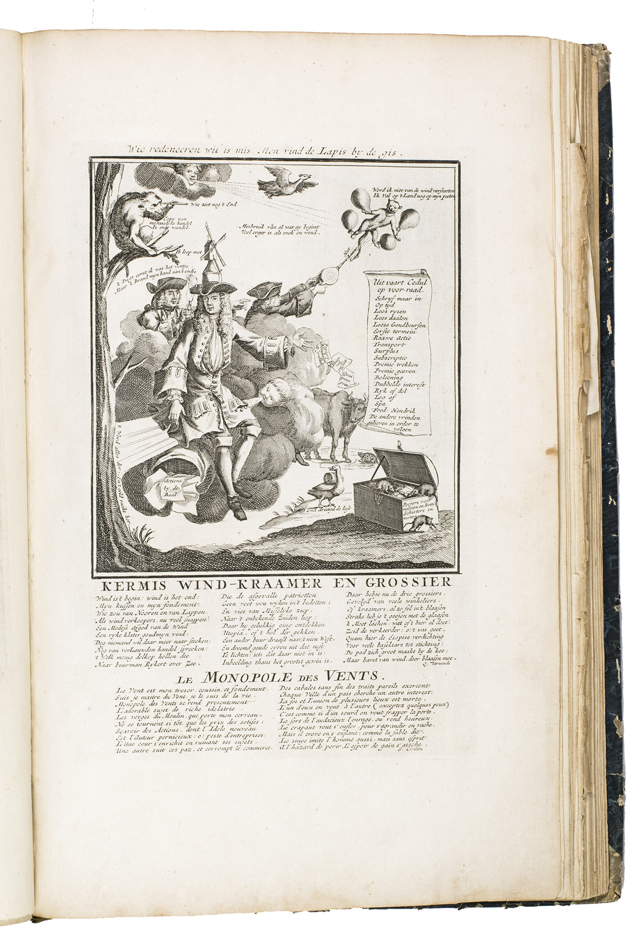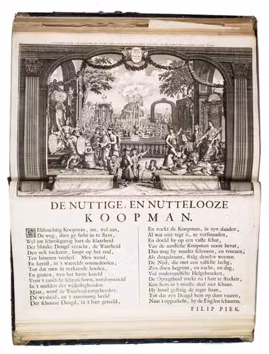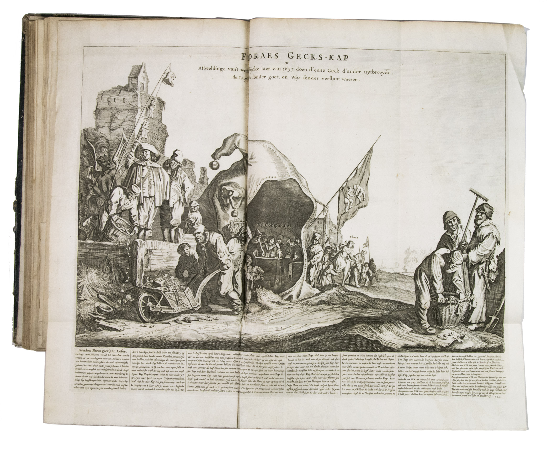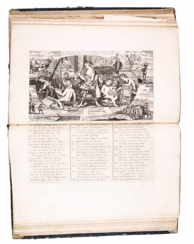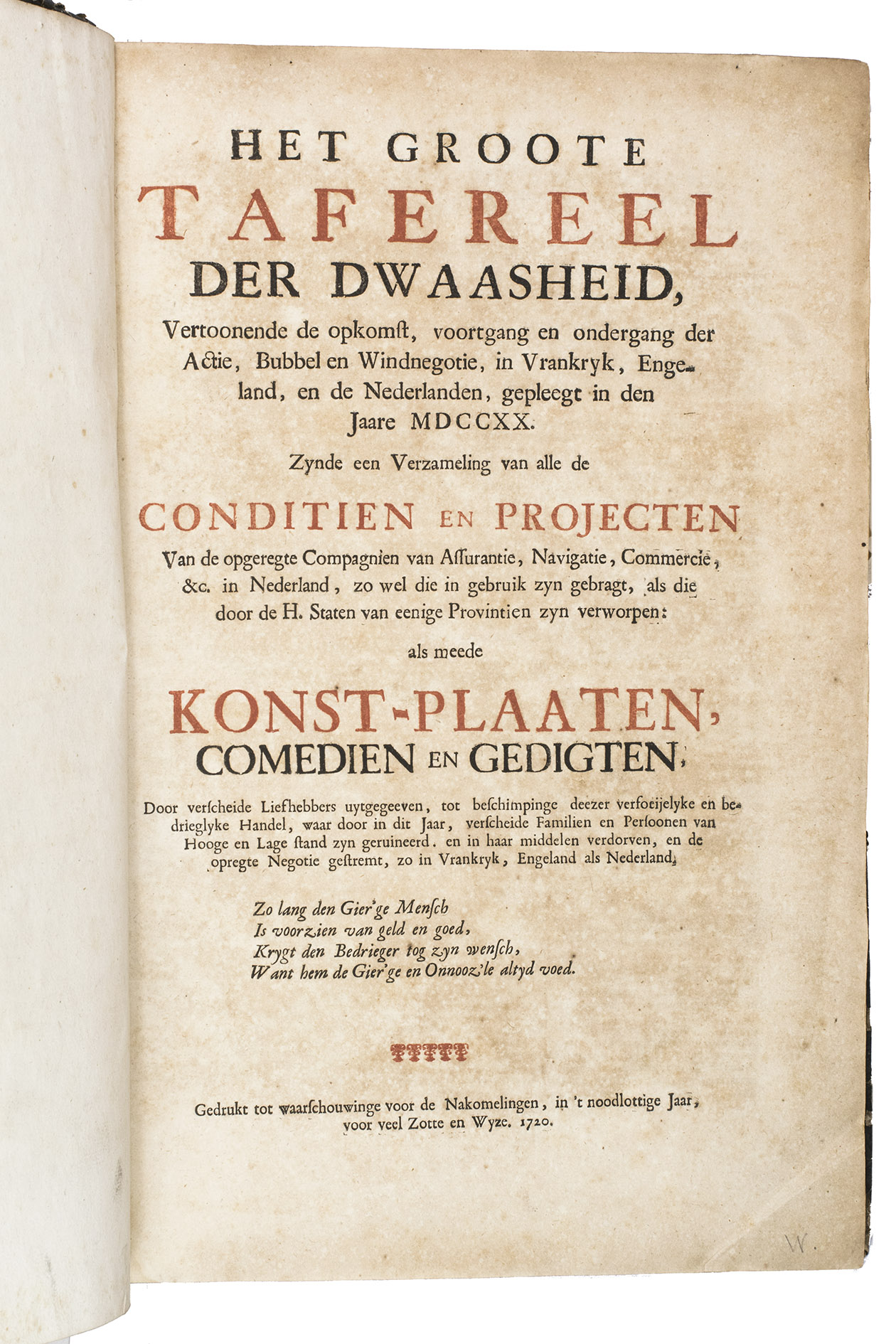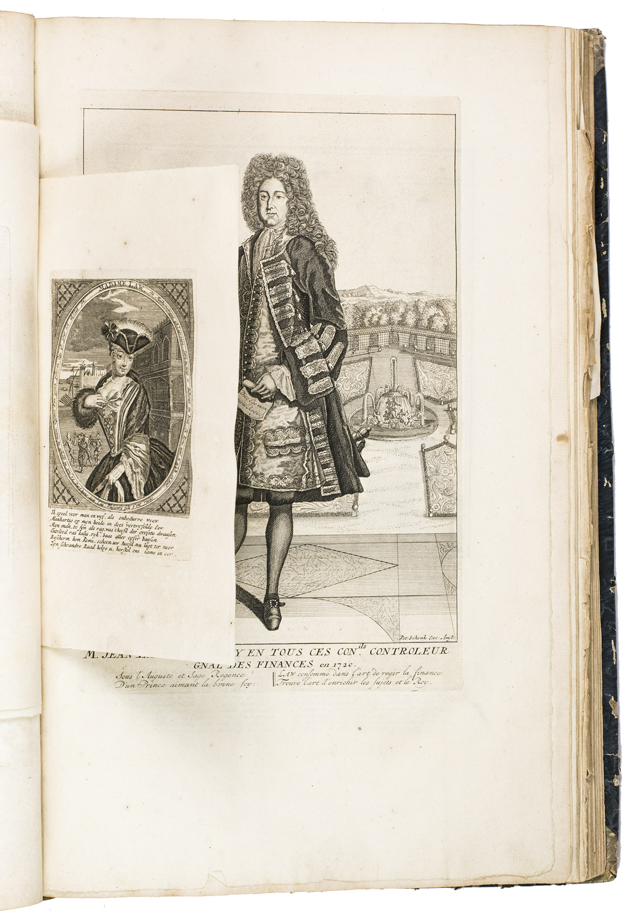 A famous collection of texts and plates satirising the Englishman John Law, his Mississippi Company, and the international land and trading speculation in worthless shares of the South Sea Bubble of 1719-1720, which resulted in an international scandal. The speculation began in Paris, London and Hamburg, spreading to the Netherlands in the summer of 1720. While plays satirizing the speculation already opened in September 1720, the bubble really burst in October. Pieter Langendijk and Gysbert Tysens have been identified as authors of some of the plays. The book also provides the texts of official documents relating to the Dutch trading companies involved.