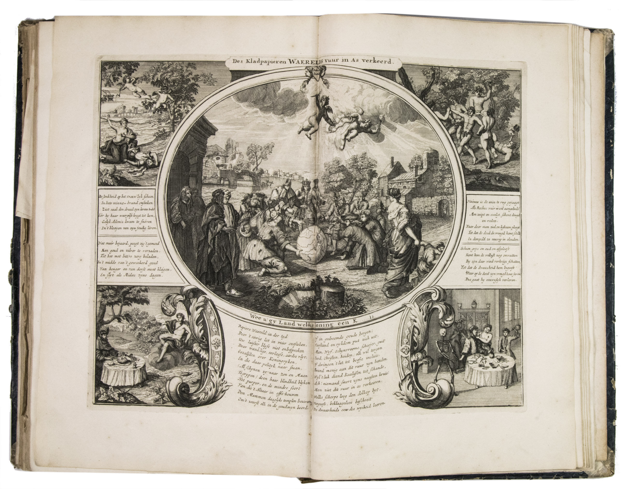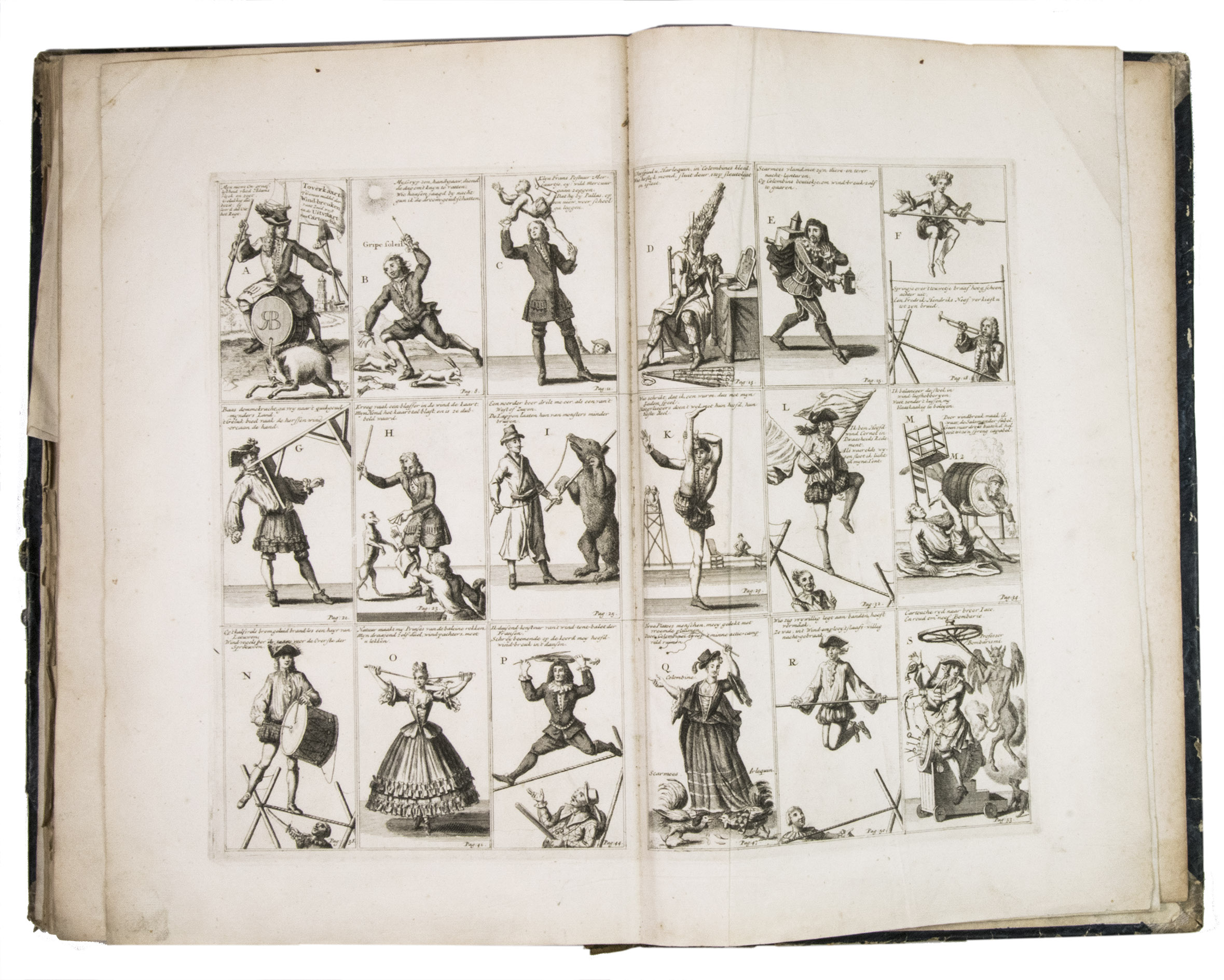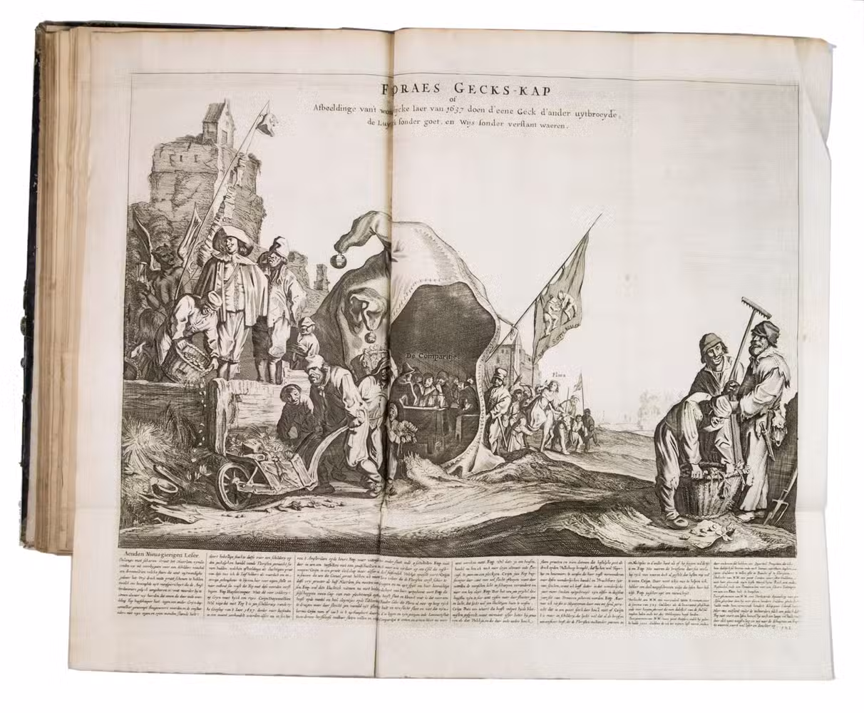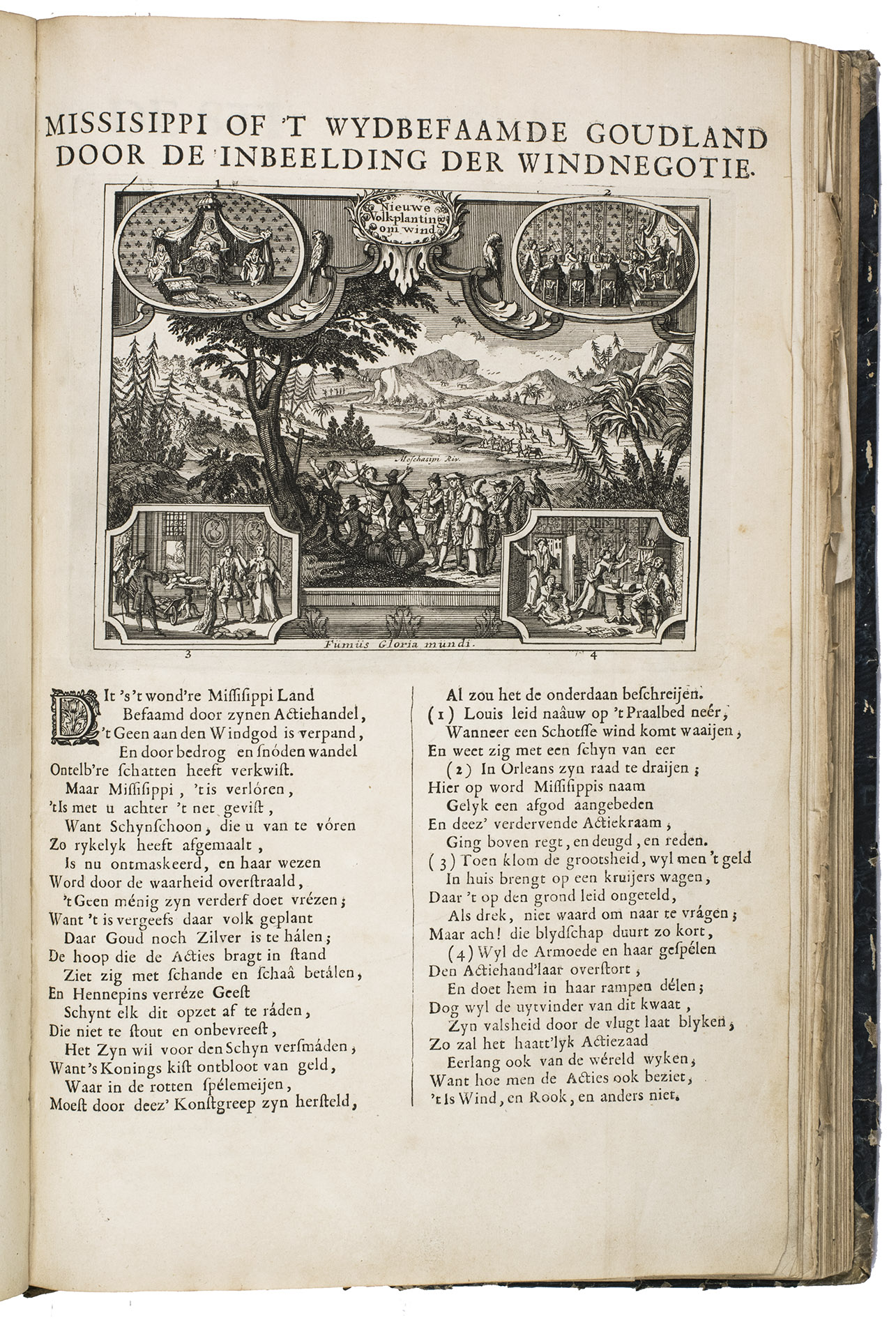 A famous collection of texts and plates satirising the Englishman John Law, his Mississippi Company, and the international land and trading speculation in worthless shares of the South Sea Bubble of 1719-1720, which resulted in an international scandal. The speculation began in Paris, London and Hamburg, spreading to the Netherlands in the summer of 1720. While plays satirizing the speculation already opened in September 1720, the bubble really burst in October. Pieter Langendijk and Gysbert Tysens have been identified as authors of some of the plays. The book also provides the texts of official documents relating to the Dutch trading companies involved.