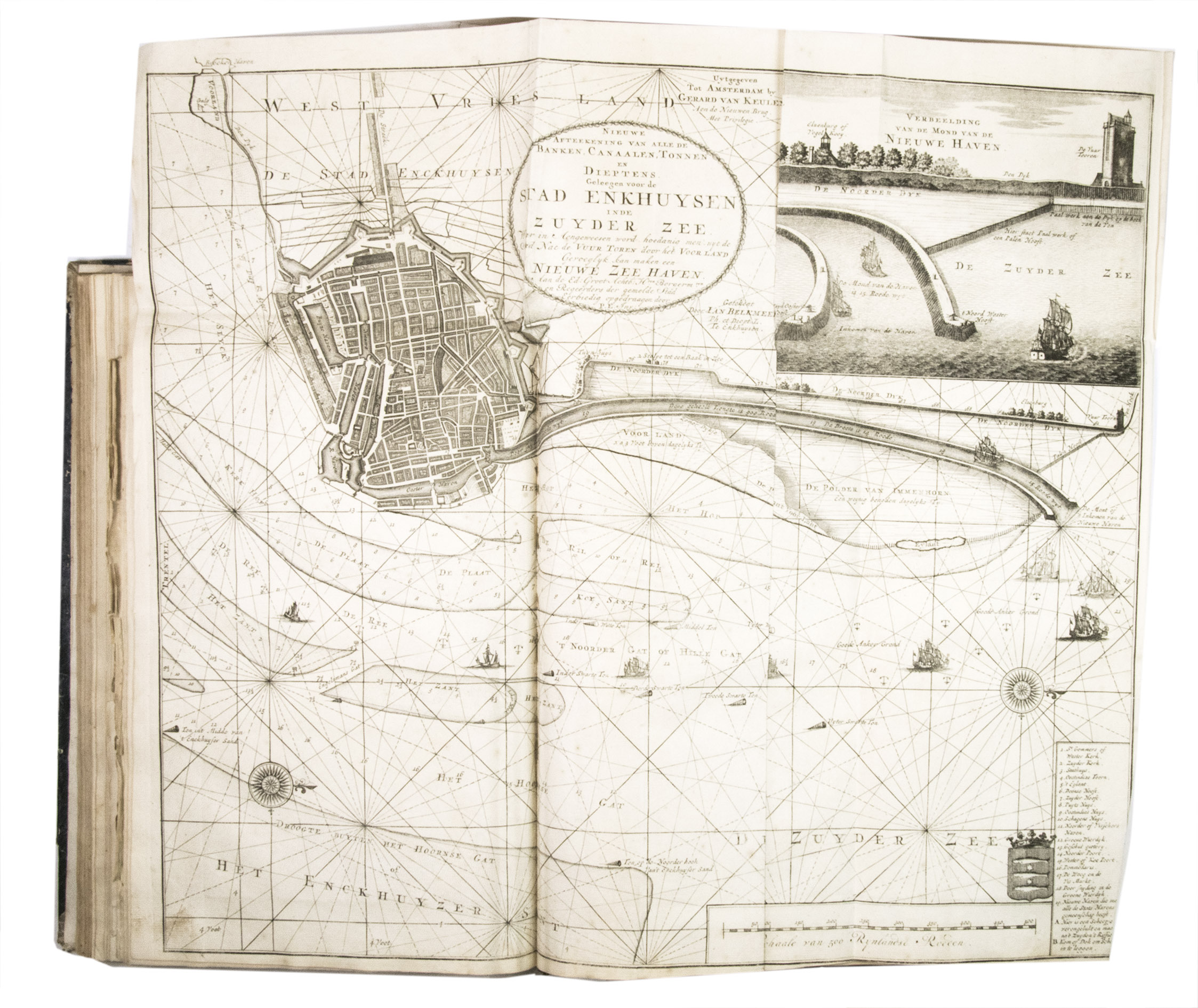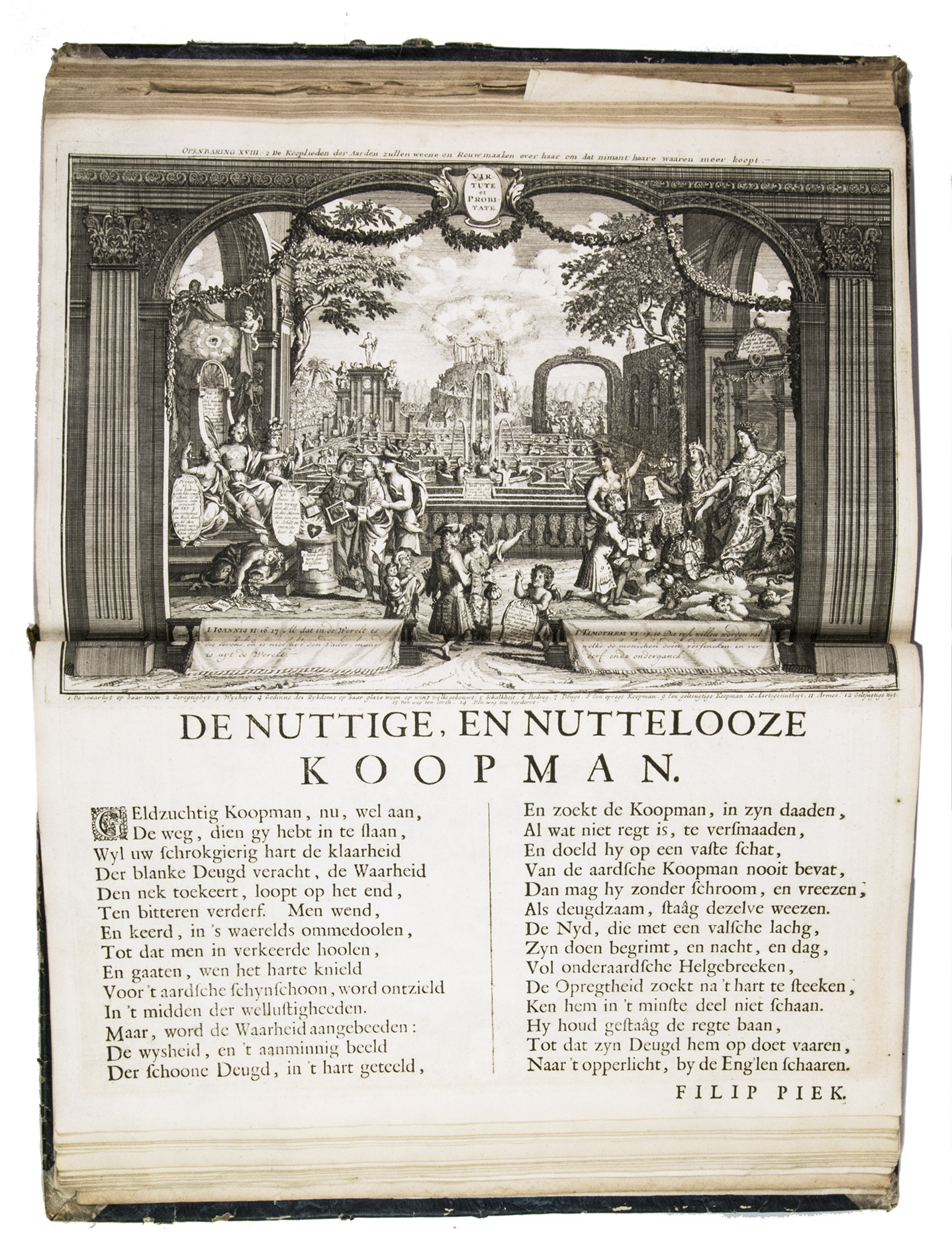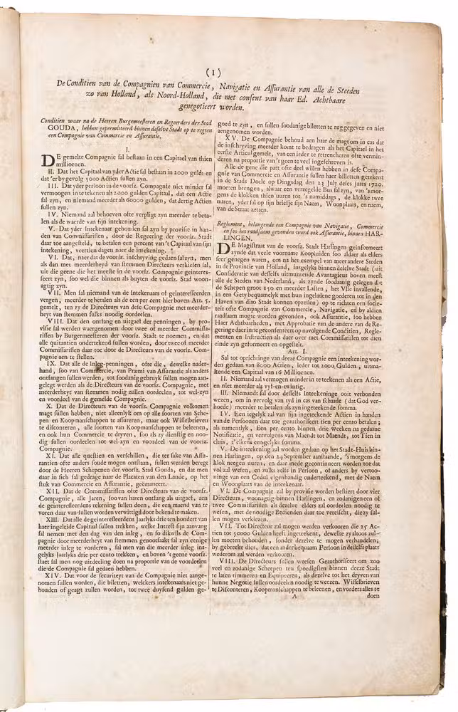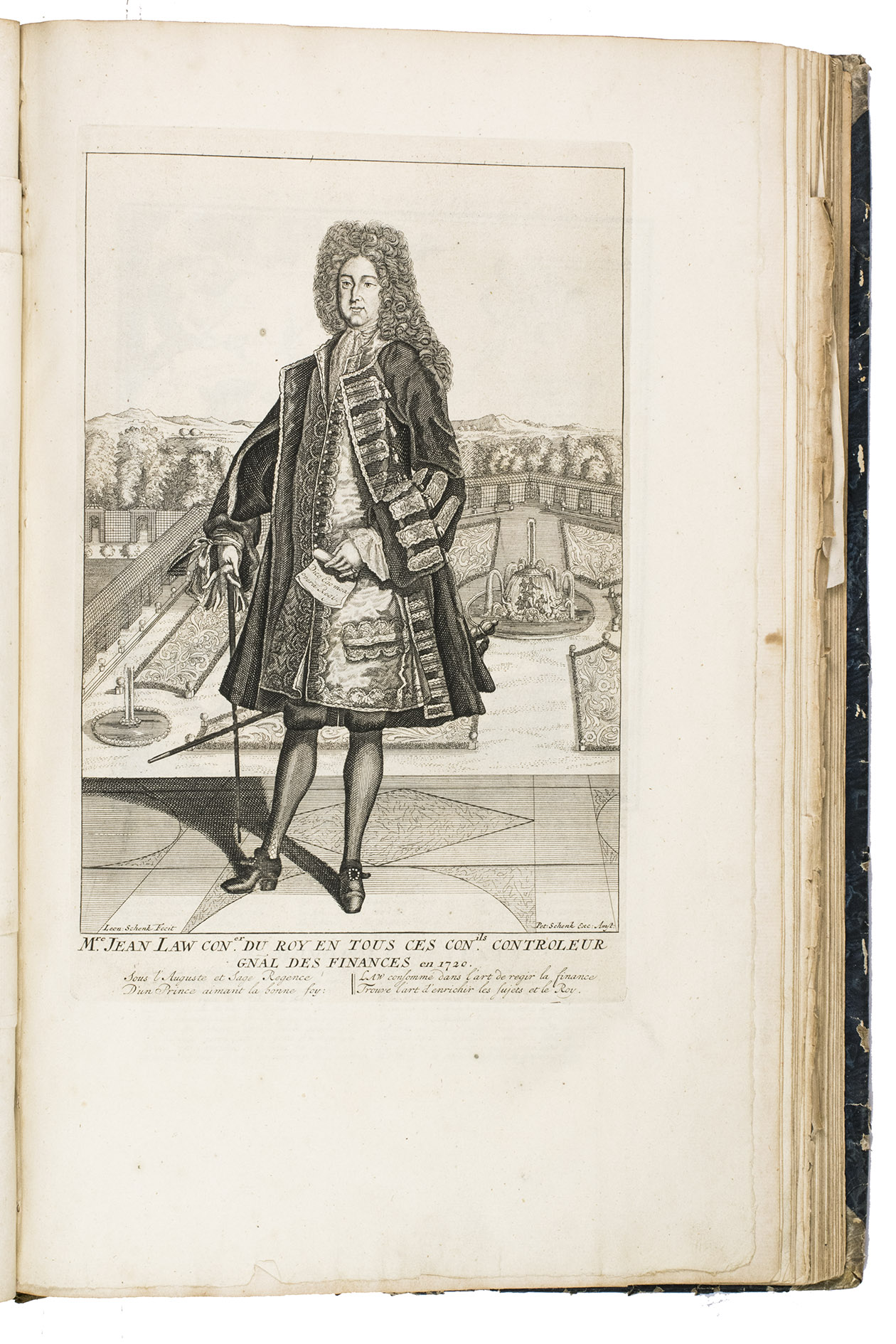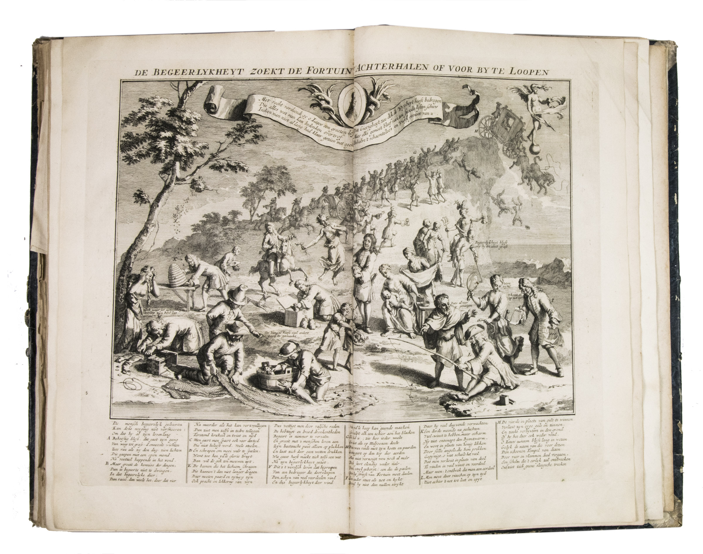 A famous collection of texts and plates satirising the Englishman John Law, his Mississippi Company, and the international land and trading speculation in worthless shares of the South Sea Bubble of 1719-1720, which resulted in an international scandal. The speculation began in Paris, London and Hamburg, spreading to the Netherlands in the summer of 1720. While plays satirizing the speculation already opened in September 1720, the bubble really burst in October. Pieter Langendijk and Gysbert Tysens have been identified as authors of some of the plays. The book also provides the texts of official documents relating to the Dutch trading companies involved.