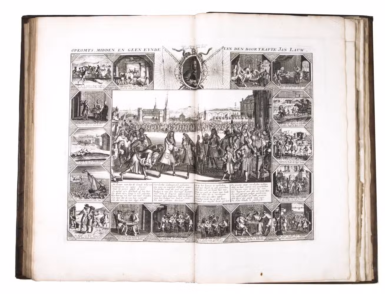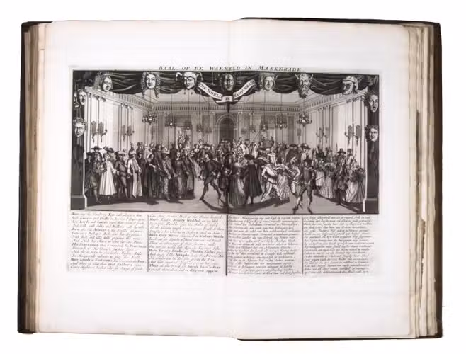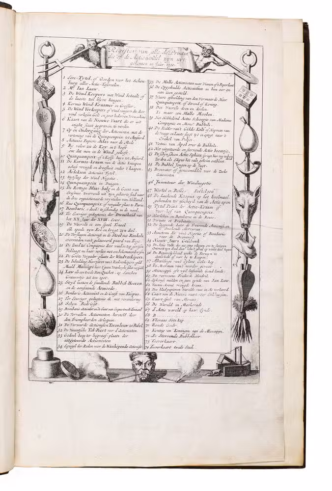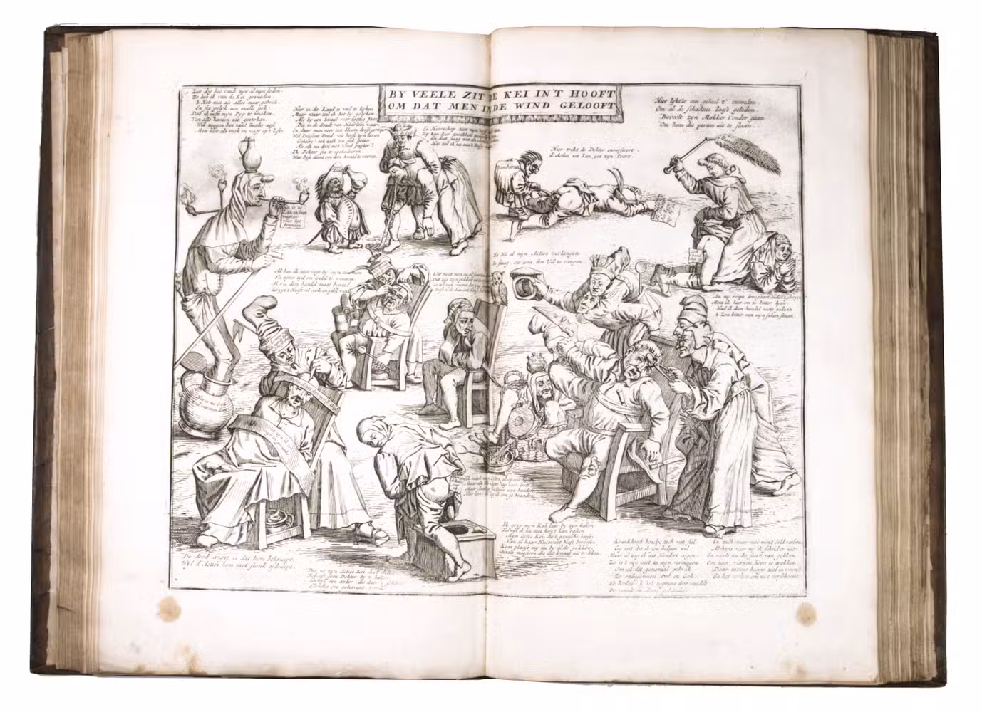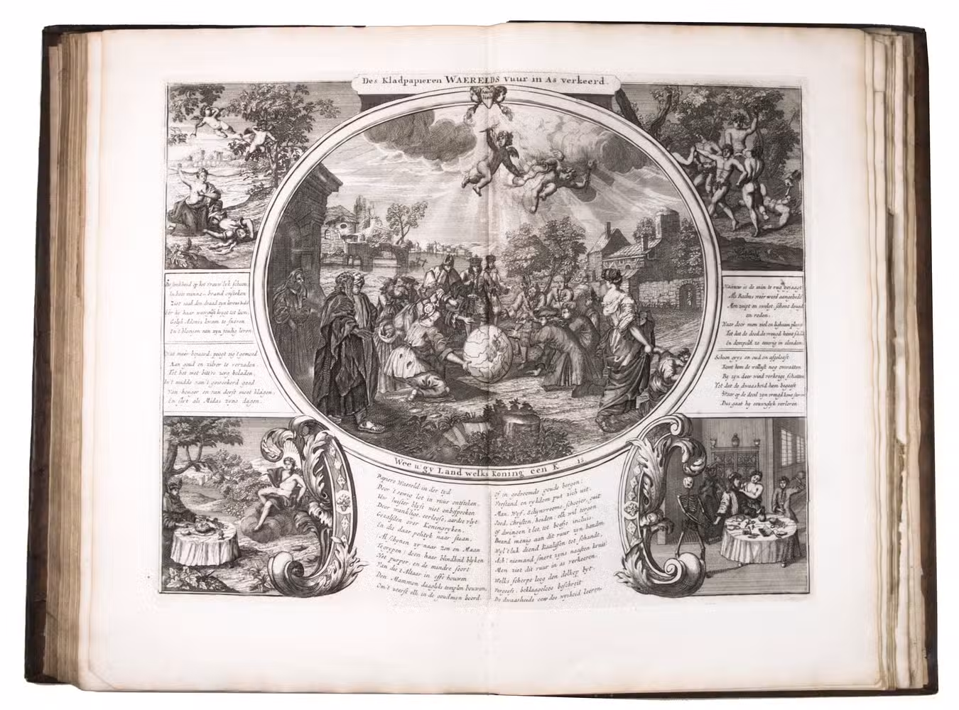 The Dutch, seasoned participants in organised finance, responded not merely with alarm but with satire of unparalleled inventiveness. The Tafereel der dwaasheid gathers together emblematic engravings, caricatures, poems, plays, pamphlets and moralising texts, all exposing the greed, credulity and collective madness of the "wind trade", transactions in nothing more substantial than air.