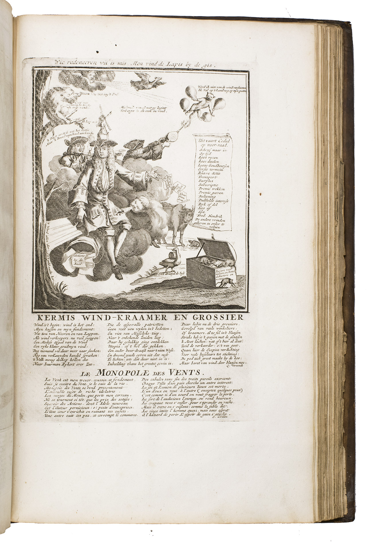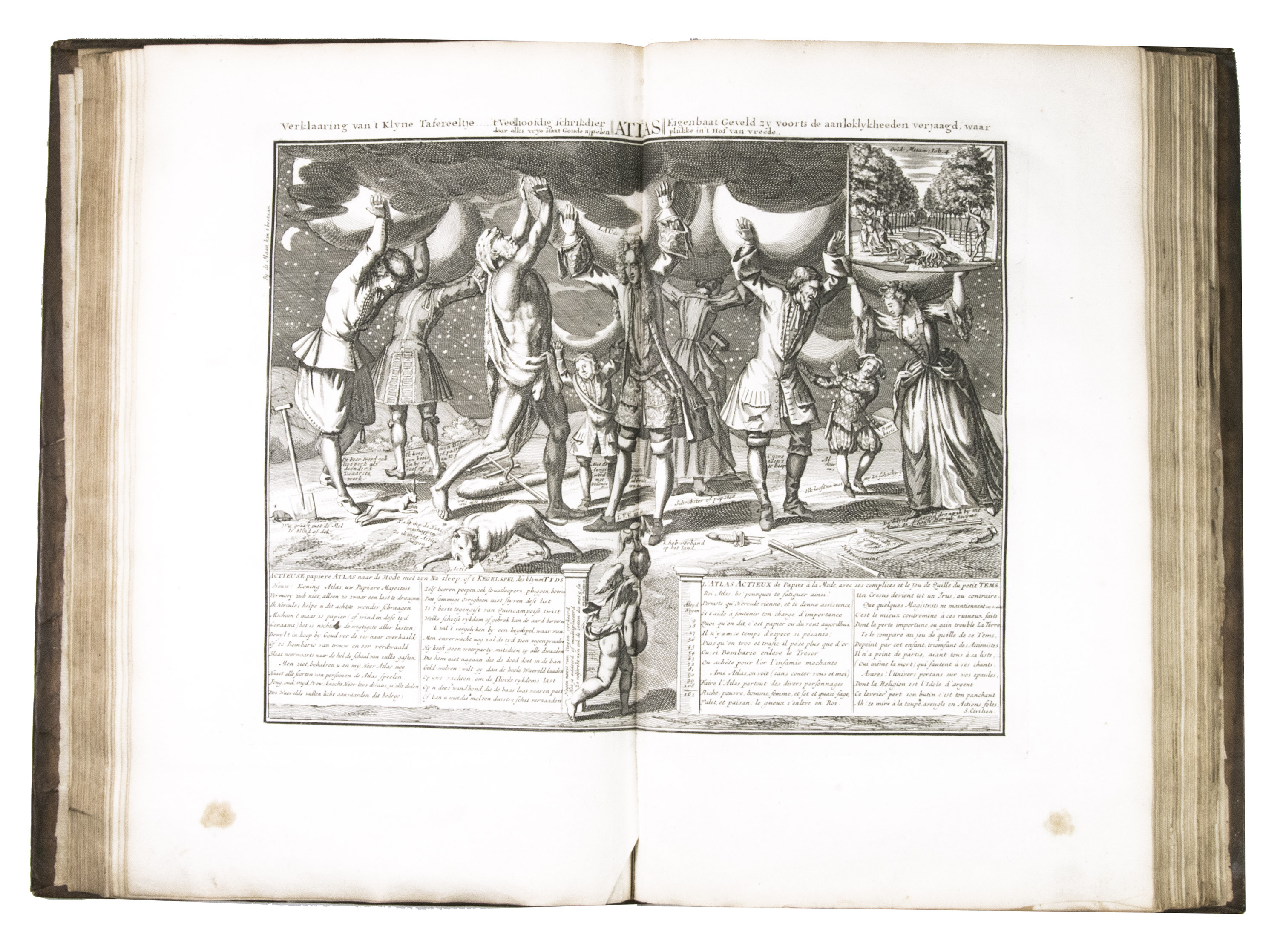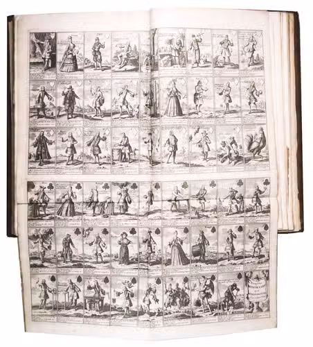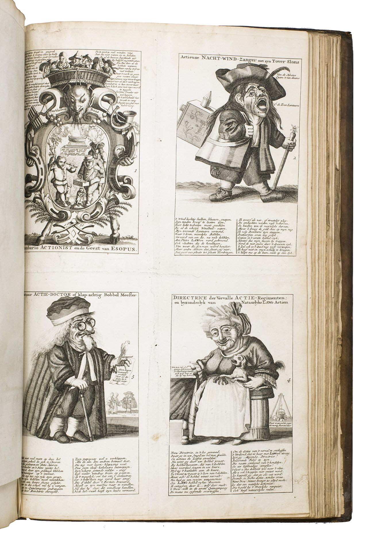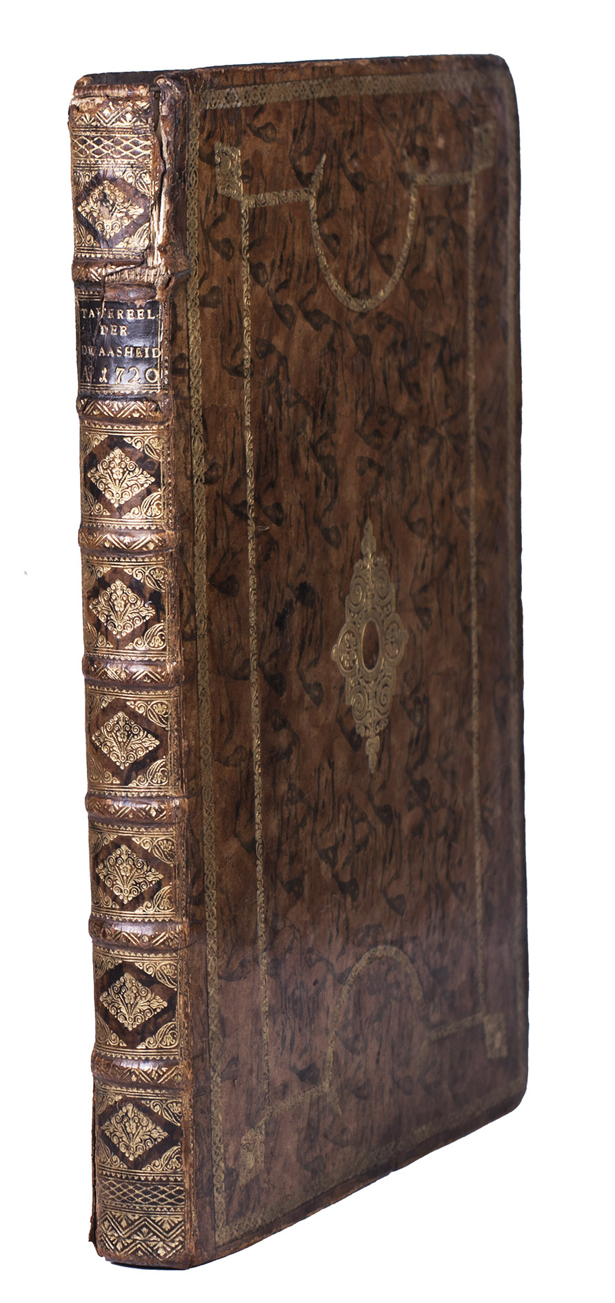 [Amsterdam], 1720. Folio. With the title page printed in red and black and 79 engraved plates (including 1 repeat of plate 54, 3589 Muller), most double-page and several larger folding sheets, including several maps and the plate with the complete set of 52 playing cards (Pasquin variant). The copy contains the register listing 74 items and 4 plates not in Mullers principal list (Muller 3611-3613 and 3615), but unfortunately lacks plate 18 (3553 Muller). (Near-) Contemporary gold-tooled mottled calf, with the title and year lettered in gold on the spine, sewn on 7 supports with the corresponding raised bands on the spine. Bound by the Bird's Head Bindery in Amsterdam (ca. 1728-1765?), see Storm van Leeuwen. [1], [1 blank], 25, [1], 52, 31, [1 blank], 8, 10 pp. and 79 engraved plates (2 before the title page).
