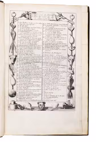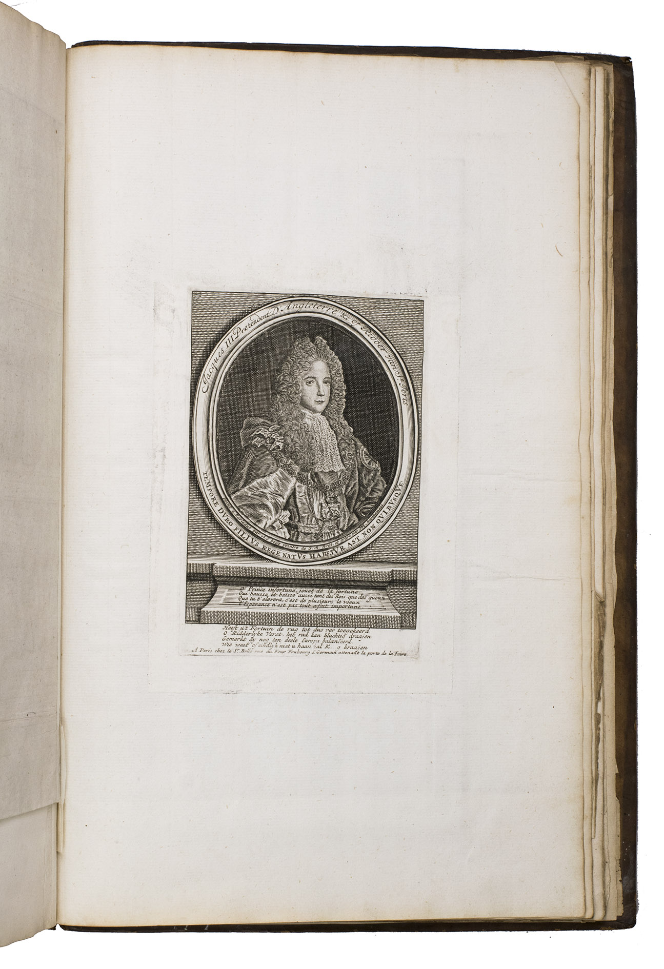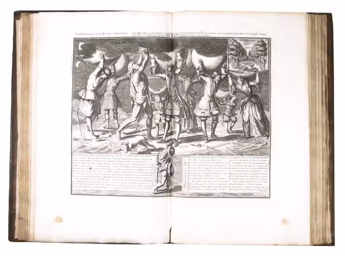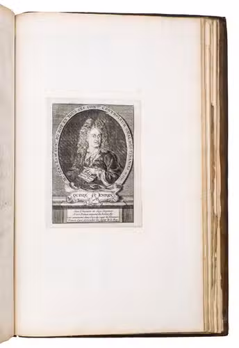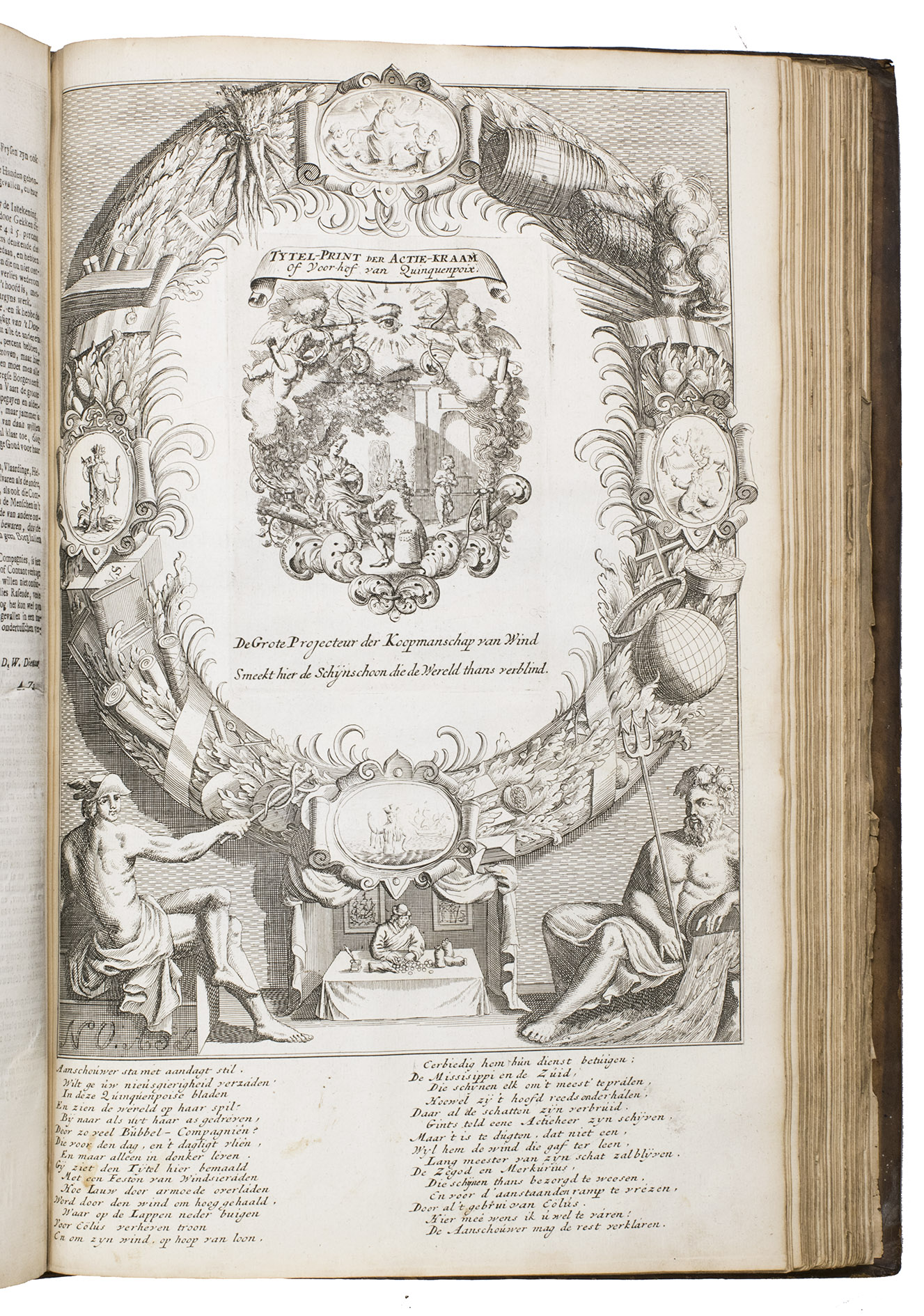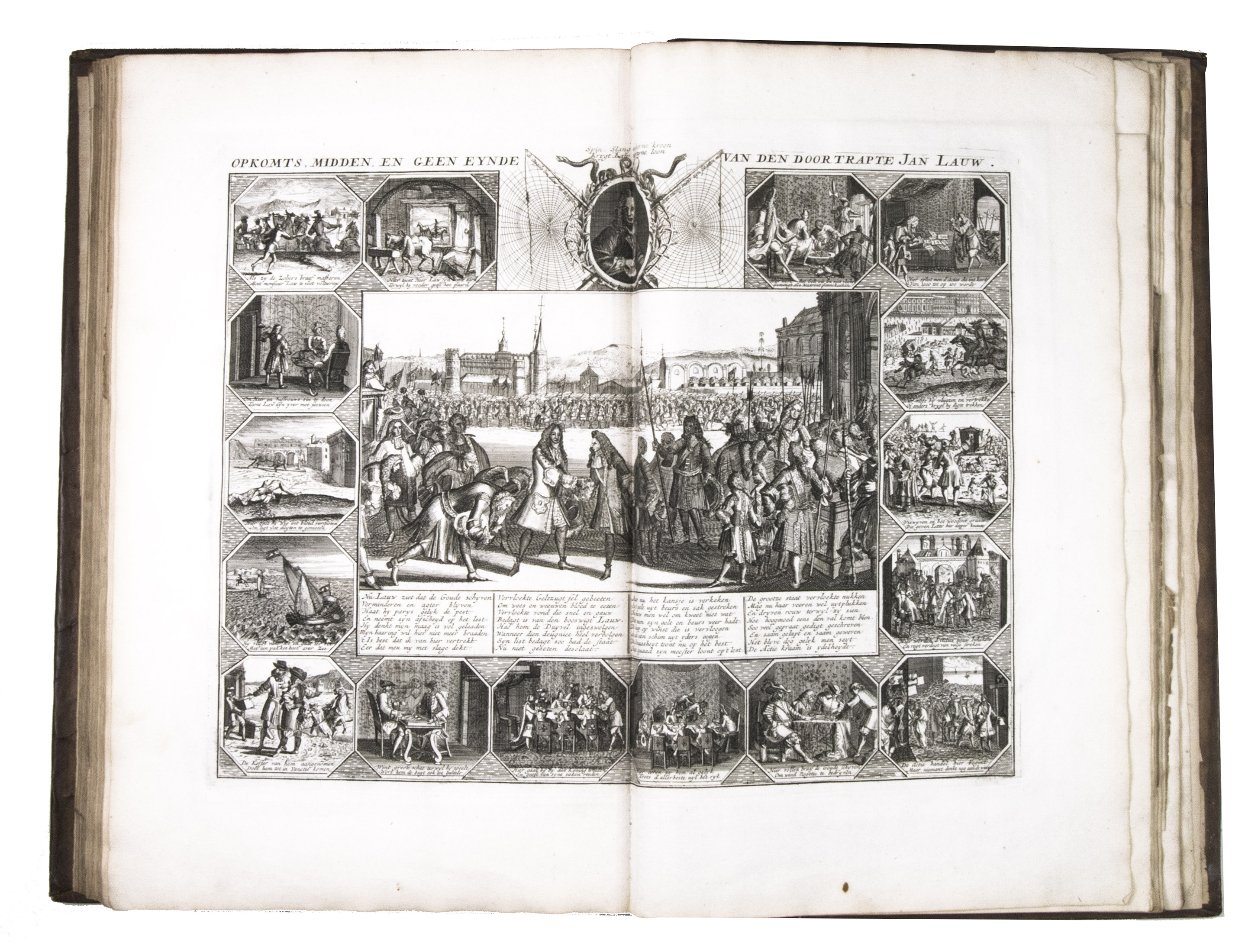 [Amsterdam], 1720. Folio. With the title page printed in red and black and 79 engraved plates (including 1 repeat of plate 54, 3589 Muller), most double-page and several larger folding sheets, including several maps and the plate with the complete set of 52 playing cards (Pasquin variant). The copy contains the register listing 74 items and 4 plates not in Mullers principal list (Muller 3611-3613 and 3615), but unfortunately lacks plate 18 (3553 Muller). (Near-) Contemporary gold-tooled mottled calf, with the title and year lettered in gold on the spine, sewn on 7 supports with the corresponding raised bands on the spine. Bound by the Bird's Head Bindery in Amsterdam (ca. 1728-1765?), see Storm van Leeuwen. [1], [1 blank], 25, [1], 52, 31, [1 blank], 8, 10 pp. and 79 engraved plates (2 before the title page).