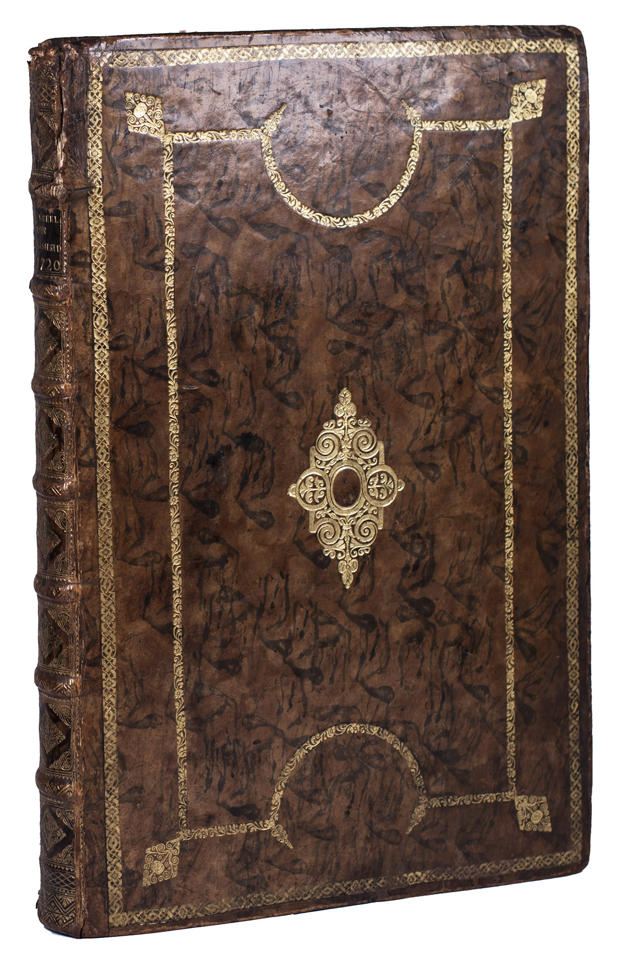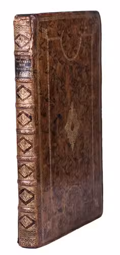 The present work appears here in a striking contemporary gold-tooled binding. This binding is the work of the so-called "Bird's Head Bindery" (active ca. 1728-1765?), according to Jan Storm van Leeuwen. The decorations are made up from several impressions of 5 different stamps and 5 different rolls. Two stamps on the present binding seem to be unrecorded by Storm van Leeuwen for this bindery, namely the lozenge-shaped stamp on the spine and the small cornerpieces on the spine surrounding the lozenge-shaped stamp. These seem to be variants of the bindery's recorded stamps, but several stamps also do bear similarities to other major Amsterdam binderies of the early 18th century like the so-called "Double Drawer Handle Bindery".