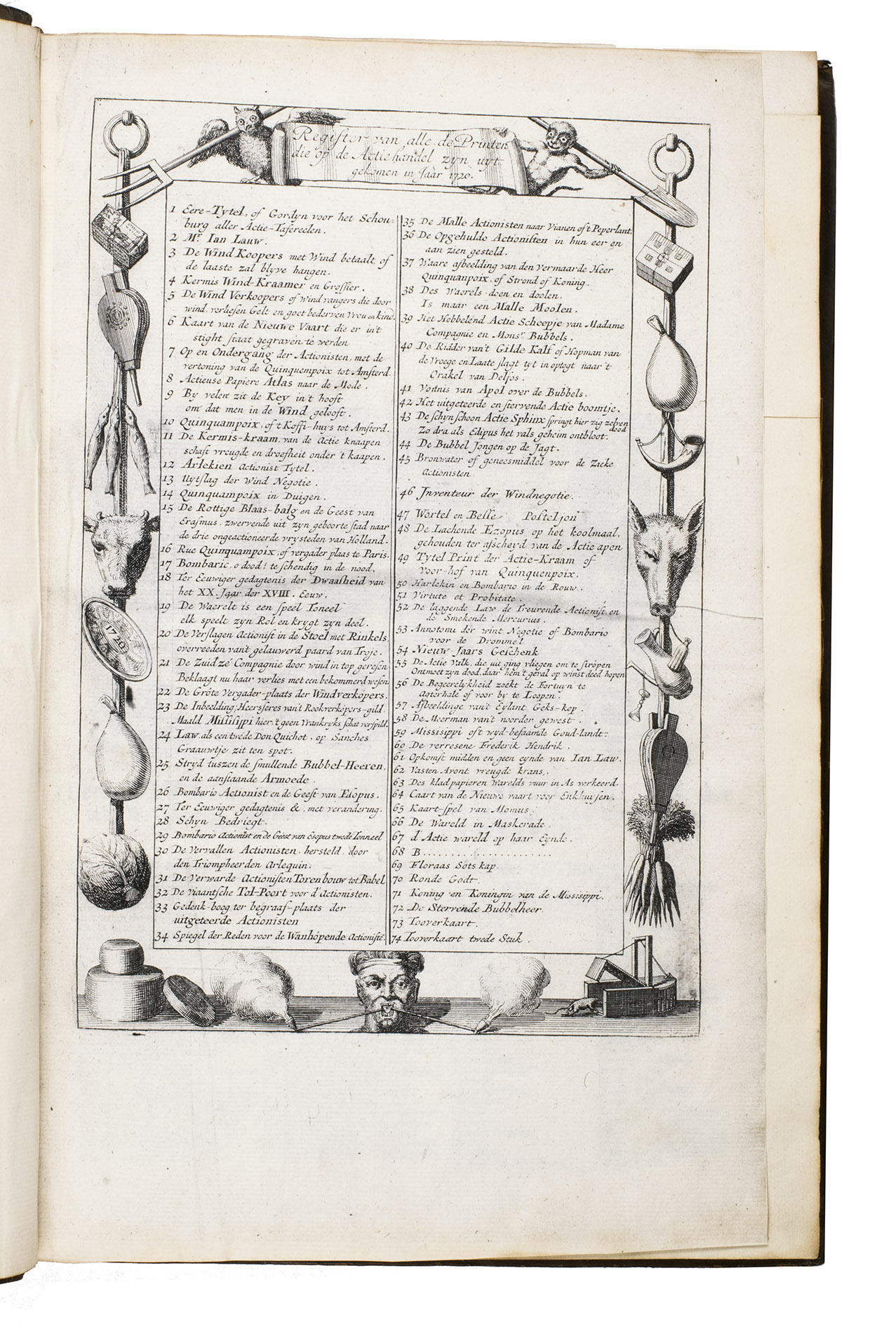 The publication history of the Tafereel der dwaasheid is famously intricate. Four editions of the letterpress are known, the present work corresponds to the third edition as classified by Muller. Within each edition the number and arrangement of plates varies considerably from copy to copy. Muller recorded 74 plates in the most extensive contemporary published list, yet barely any copy of any edition contains them all (some serving as alternatives), and several plates frequently encountered are absent from that list. The present work includes 73 plates from Muller's list of 74 (omitting no. 18), contains a duplicate of no. 54, and includes the engraved register listing 74 items together with 4 plates not in Mullers principal list (Muller 3611-3613 and 3615), including different portraits and the map of Louisiana on the Mississippi. Together they form one of the most striking and bizarre monuments in all economic literature, a merciless visual anatomy of financial hysteria.