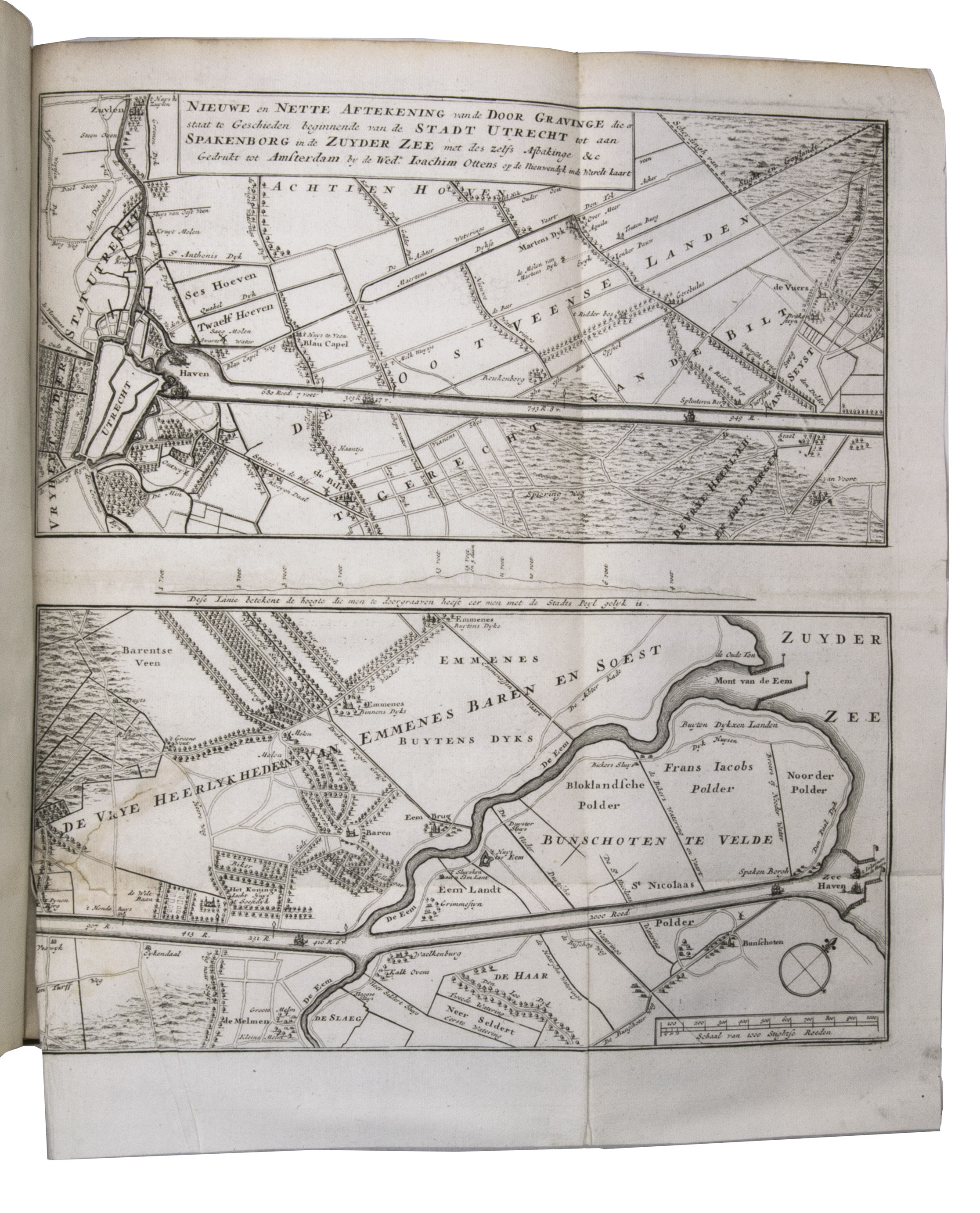 With plate "Lauw-maands herdenking ... Nieuwjaarsgeschenk" (no. 54 - 3589 Muller) included twice as plates 54-55 and lacking plate "Monument consacré - Ter eeuwiger gedagtenisse..." (no. 18 - 3553 Muller). The hinges are weakened, the head of the spine is slightly damaged, the corners and edges of the boards show slight signs of wear, with a 3.5 x 1 cm repair to the leather on the back board (not affecting the gold-tooling). The first flyleaf is partially loose, a large tear in plates 7 and 12 (resp. nos. 6 and 11 Muller) repaired on the verso, some plates with small tears along the folding lines (slightly affecting the illustration of plate 51 (same no. Muller)), and the map of Enkhuisen is torn along the paper stub it is mounted on (not affecting the plate). Some occasional browning, foxing, and staining. Otherwise in very good condition. Cole, The Great Mirror of Folly, nrs. 1-4, 6-8, 10-71, 73; De Bruyn, "Het Groote Tafereel ...," in: Eighteenth-Century Life XXIV (2000), pp. 62-87; Goetzmann, The Great Mirror of Folly (2013), esp. pp. 35-51 (bibliogr. analysis by K. Forrer); Kress 3217; Landwehr 230; Lipperheide Xf 5; Muller, Historieplaten, esp. nos. 3536-3609; pp. 103-131; Sabin 28932; STCN (various issues and made-up copies: the present work resembles 228136539); Van Leeuwen, "Dutch Decorated Bookbinding", I (2006), pp. 228-284.