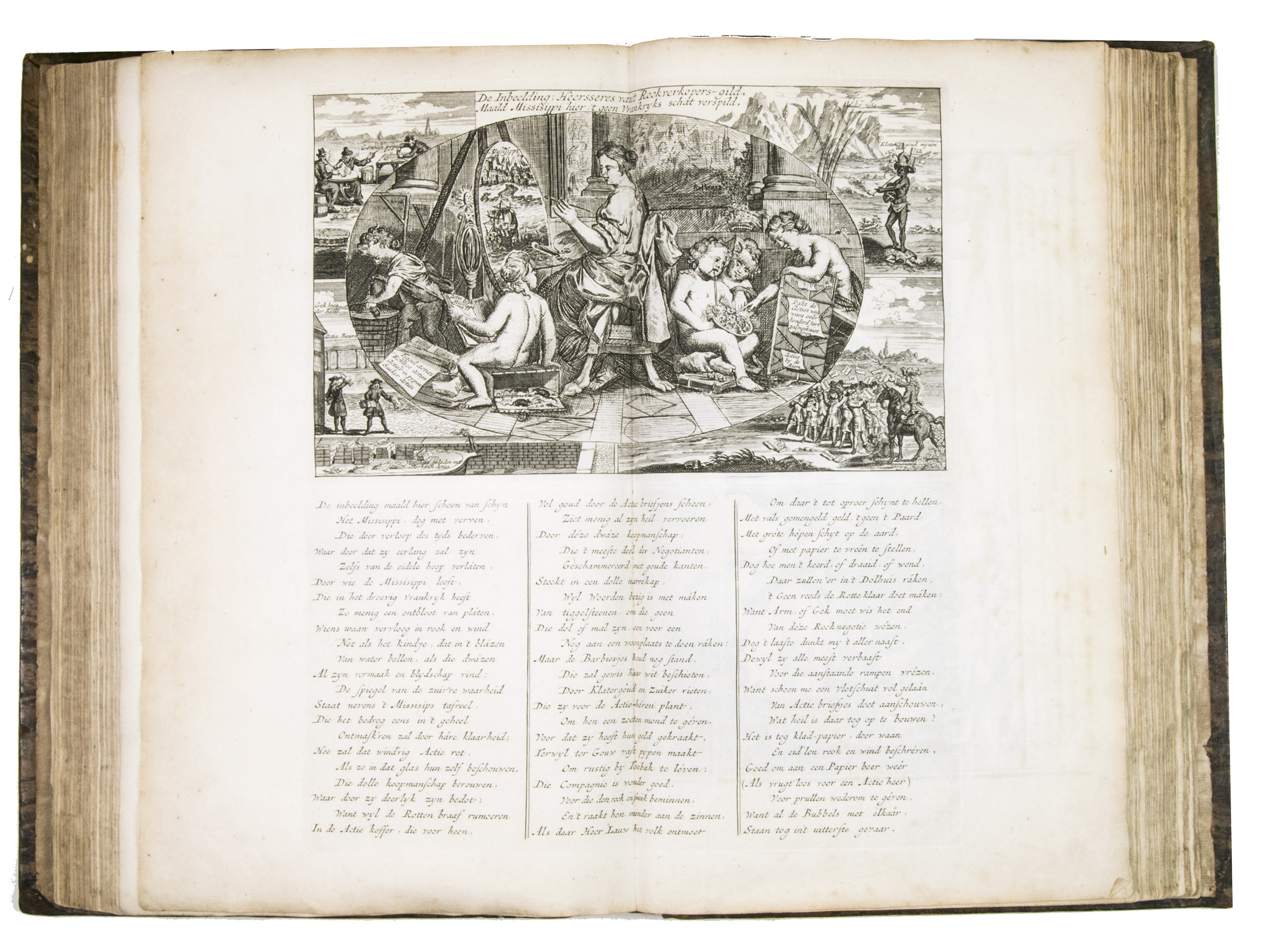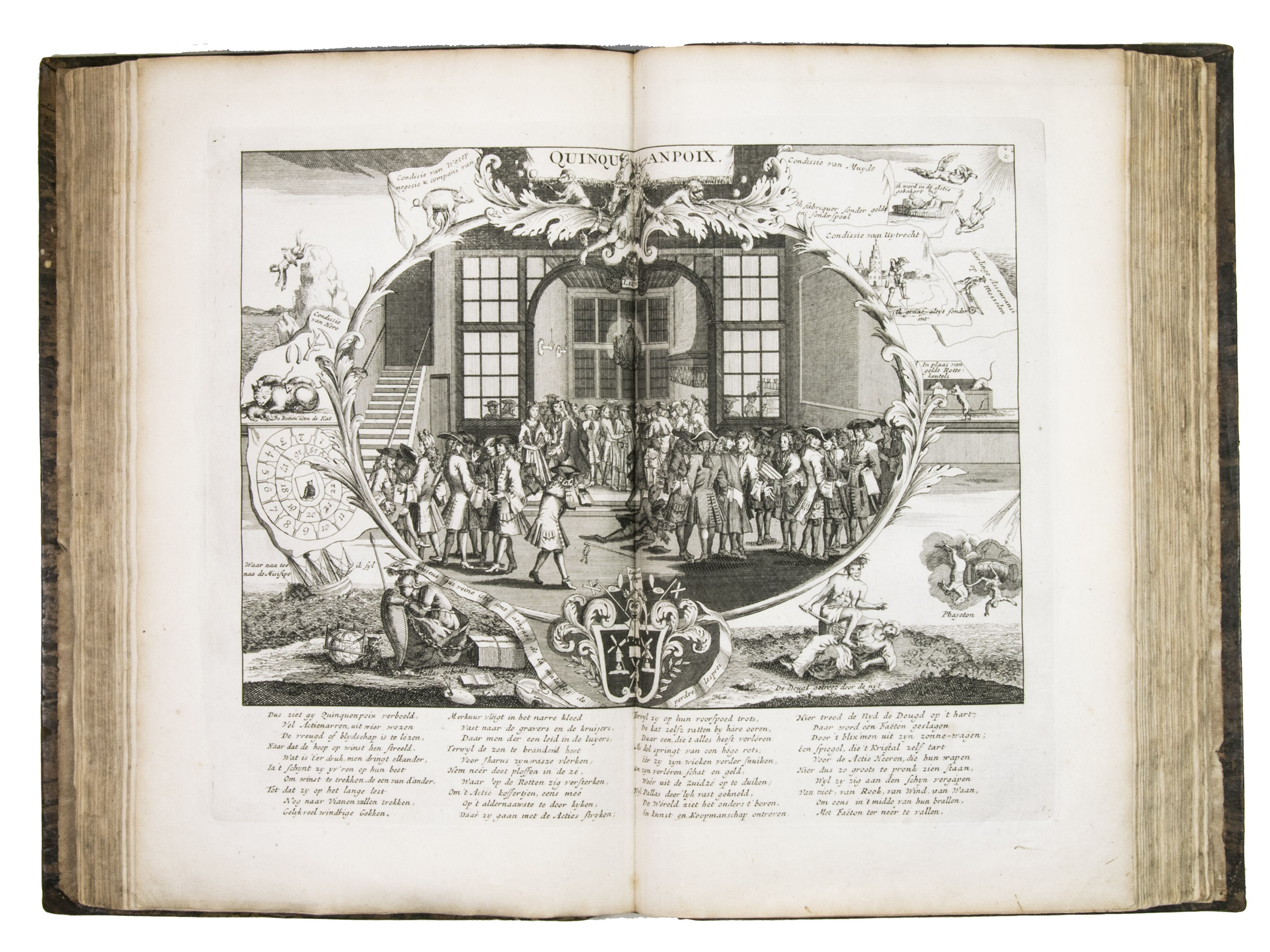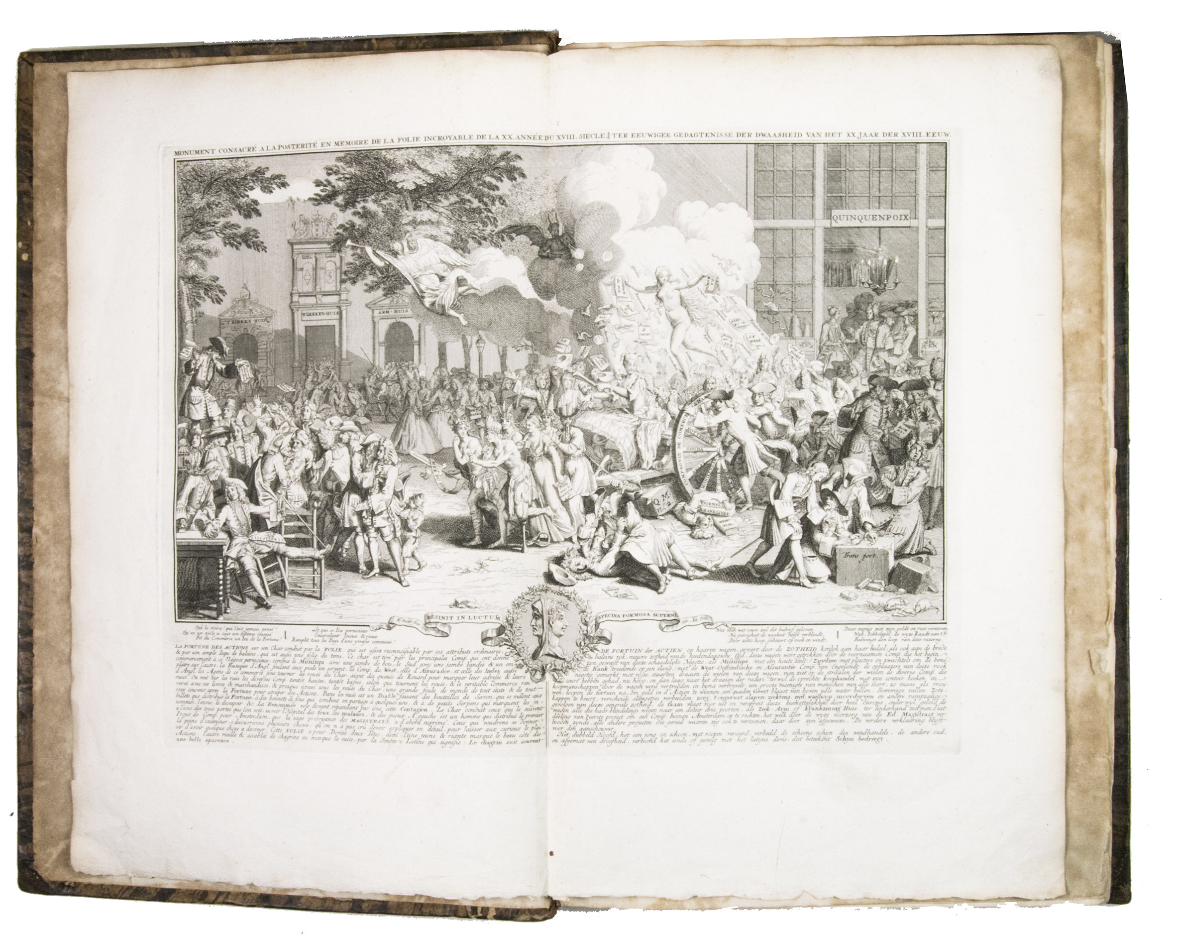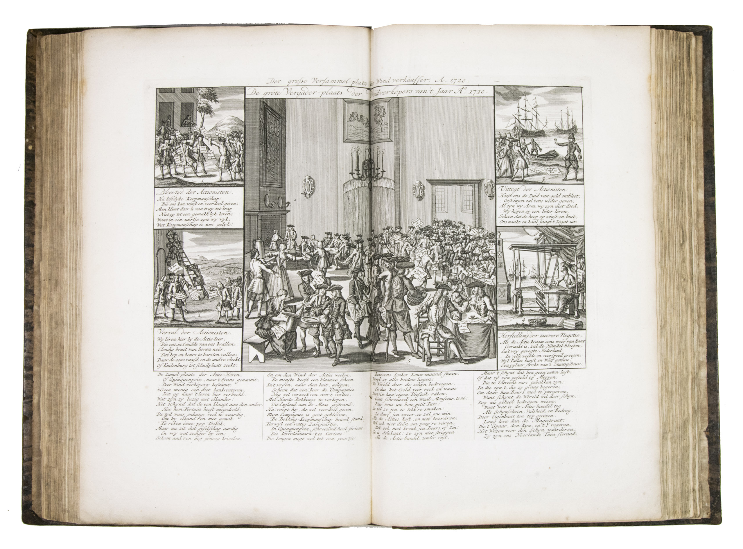 A famous collection of texts and plates satirizing the Englishman John Law, his Mississippi Company, and the international land and trading speculation in worthless shares of the South Sea Bubble of 1719-1720, which resulted in an international scandal. The speculation began in Paris, London and Hamburg, spreading to the Netherlands in the summer of 1720. While plays satirizing the speculation already opened in September 1720, the bubble really burst in October. Pieter Langendijk and Gysbert Tysens have been identified as authors of some of the plays. The book also provides the texts of official documents relating to the Dutch trading companies involved.