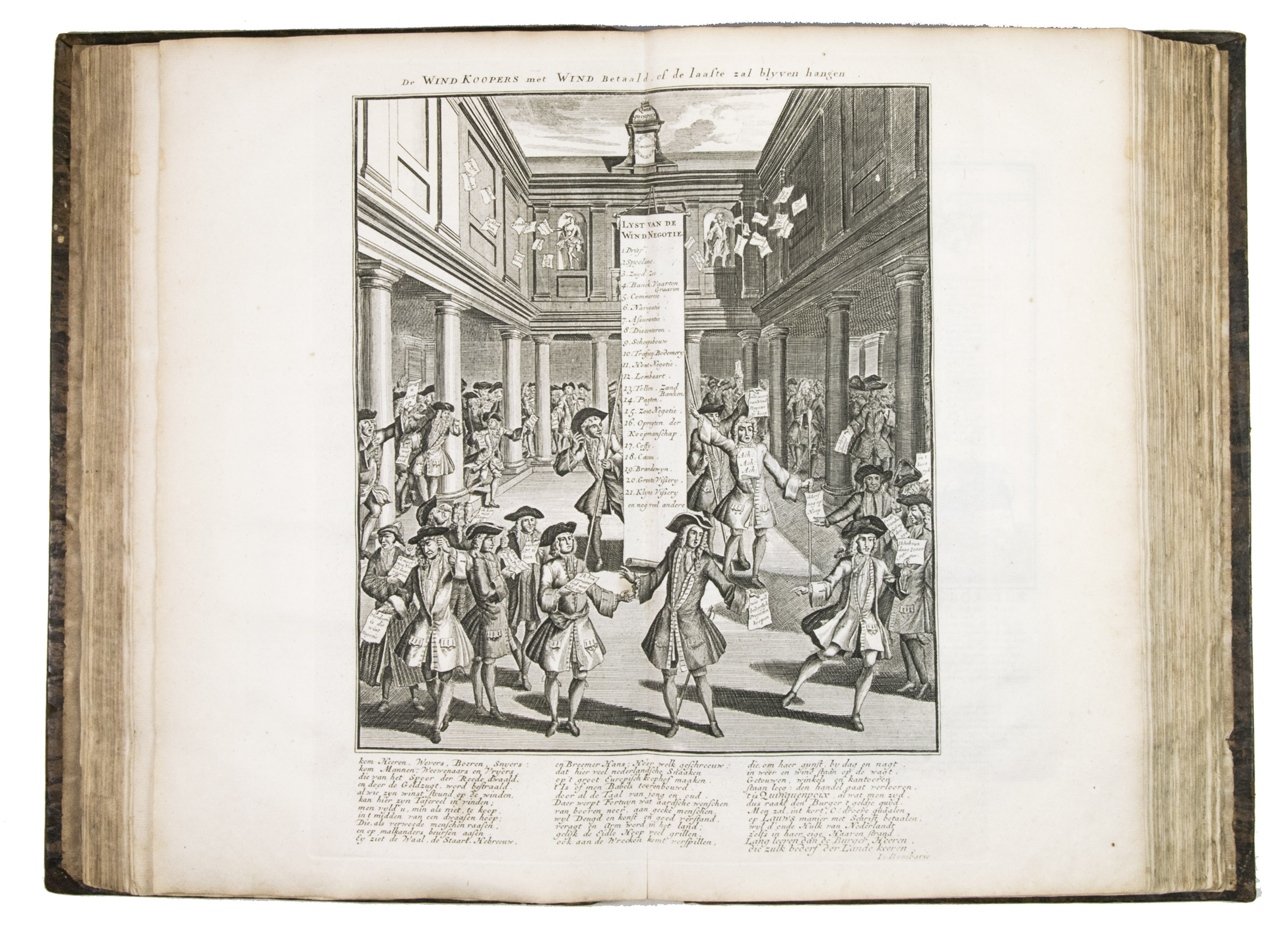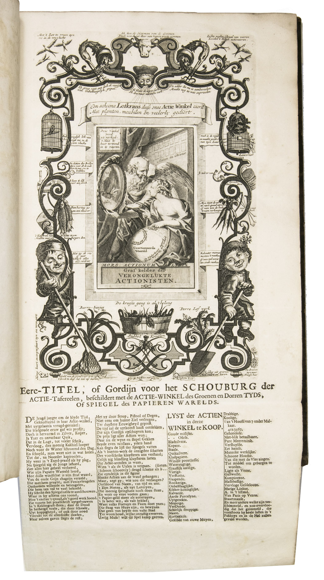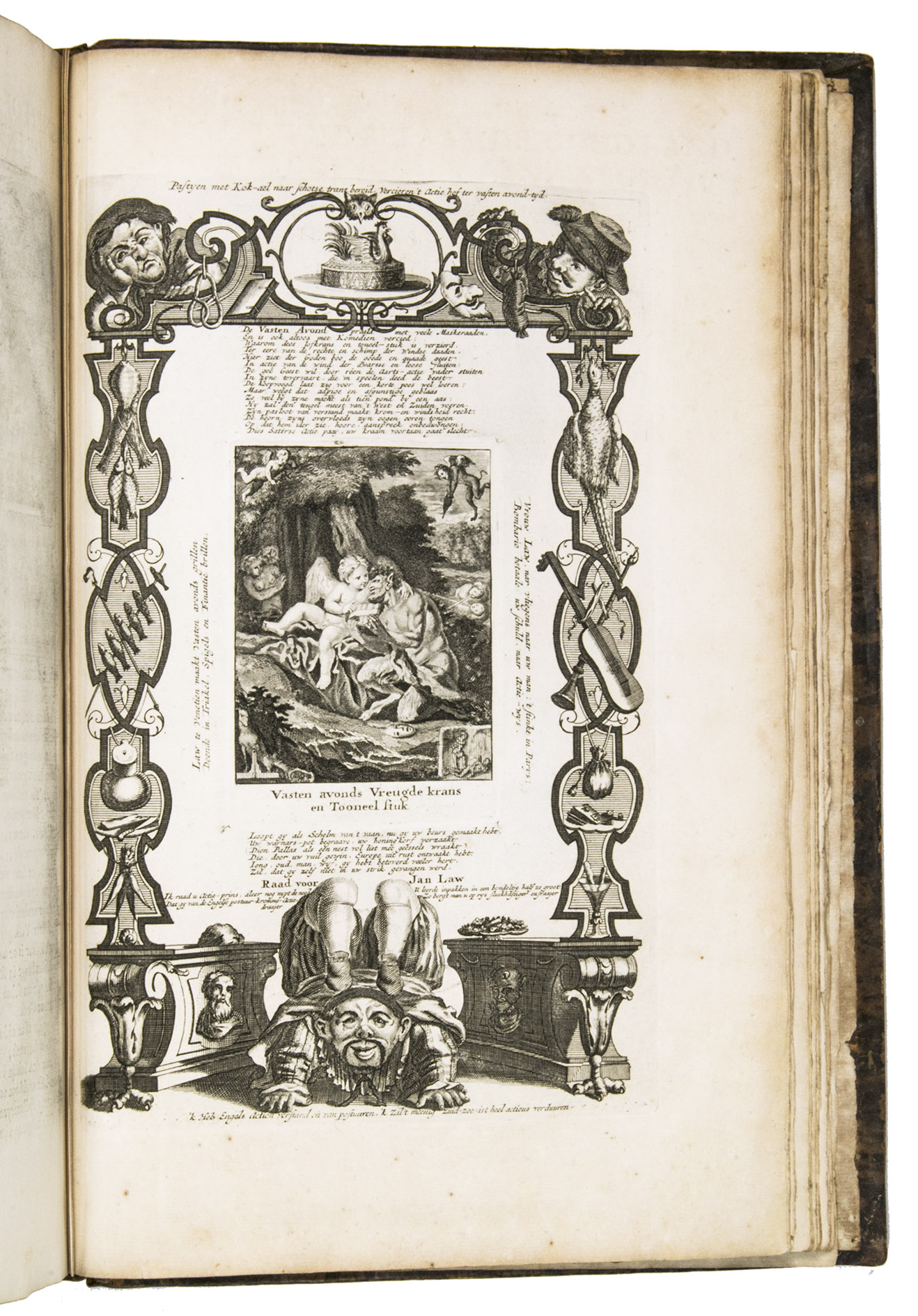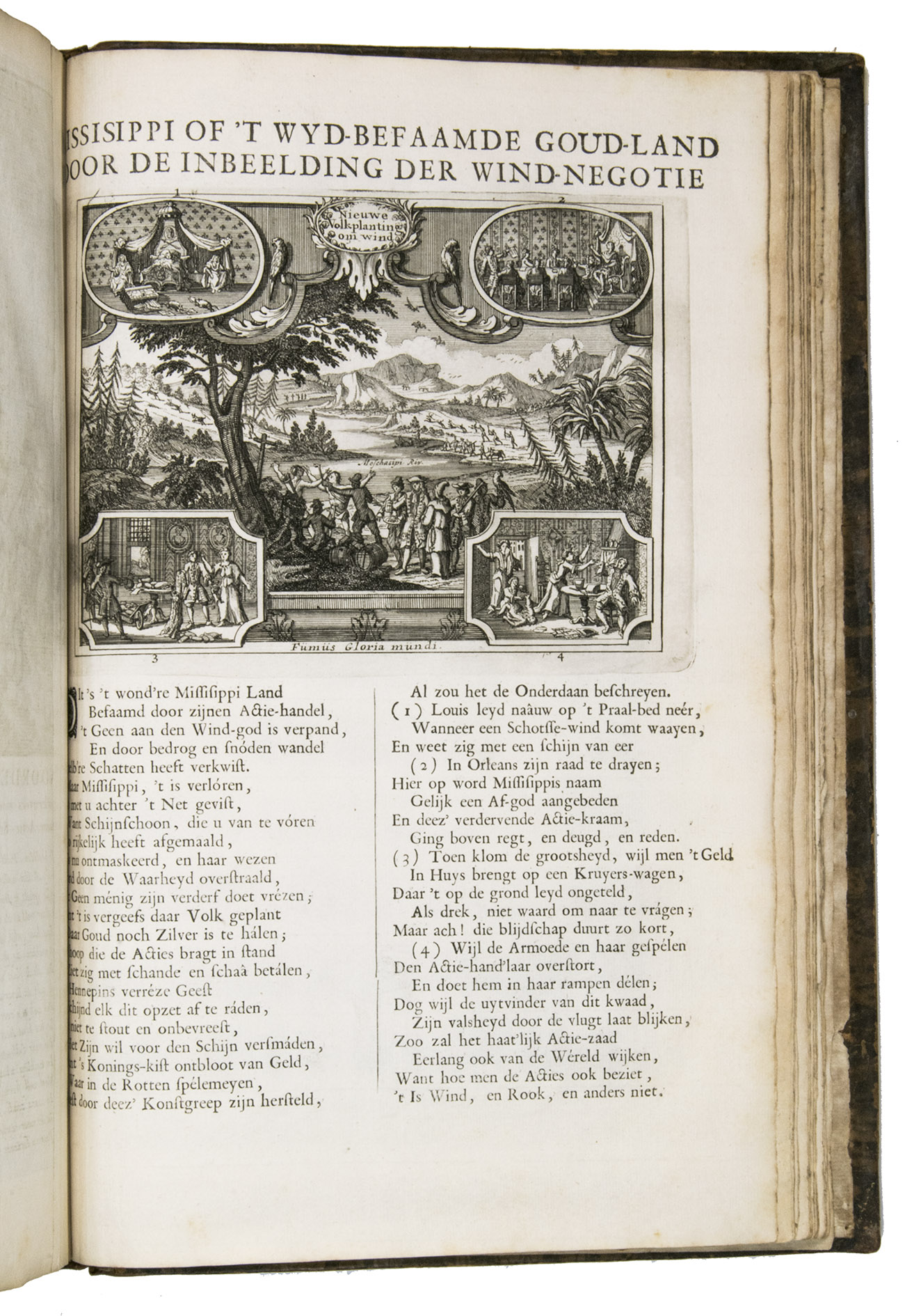 A famous collection of texts and plates satirizing the Englishman John Law, his Mississippi Company, and the international land and trading speculation in worthless shares of the South Sea Bubble of 1719-1720, which resulted in an international scandal. The speculation began in Paris, London and Hamburg, spreading to the Netherlands in the summer of 1720. While plays satirizing the speculation already opened in September 1720, the bubble really burst in October. Pieter Langendijk and Gysbert Tysens have been identified as authors of some of the plays. The book also provides the texts of official documents relating to the Dutch trading companies involved.