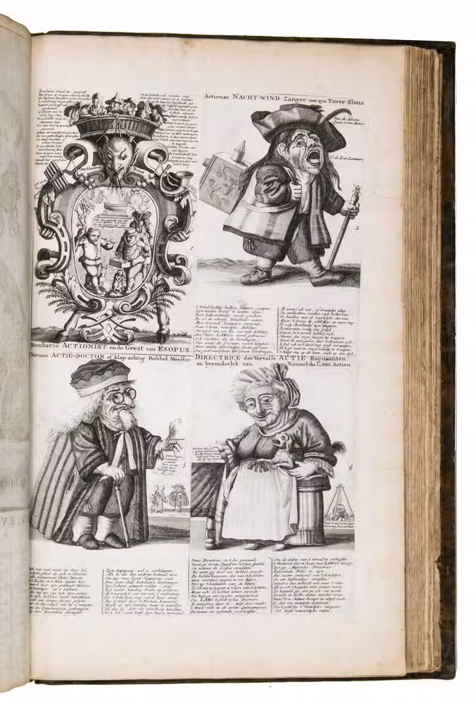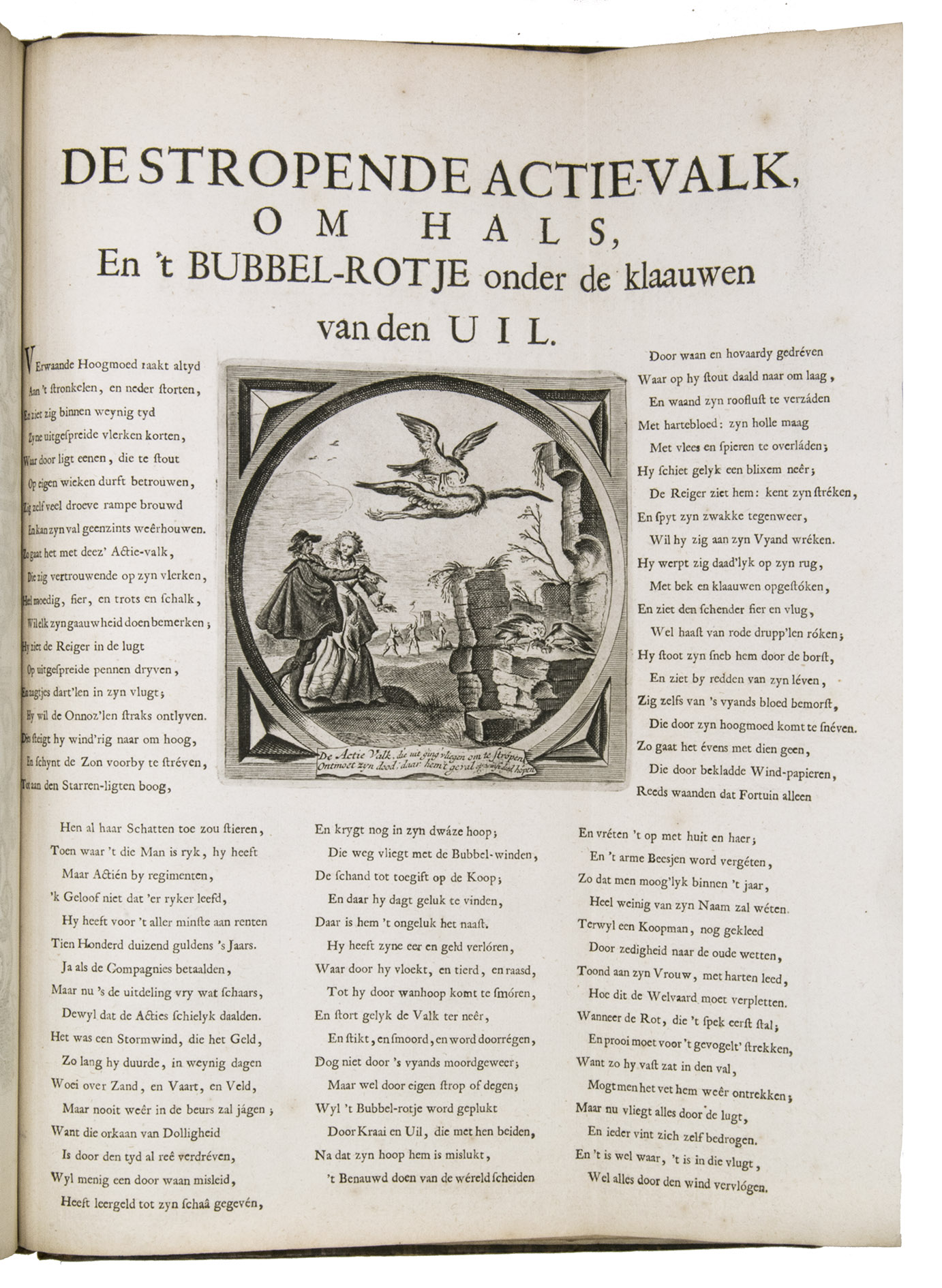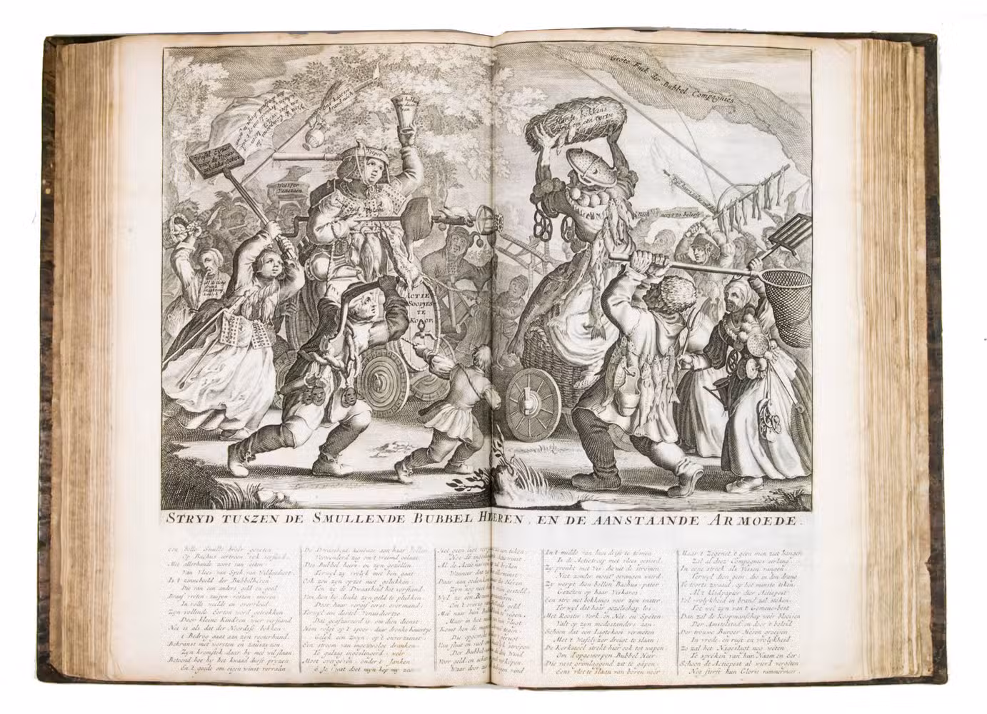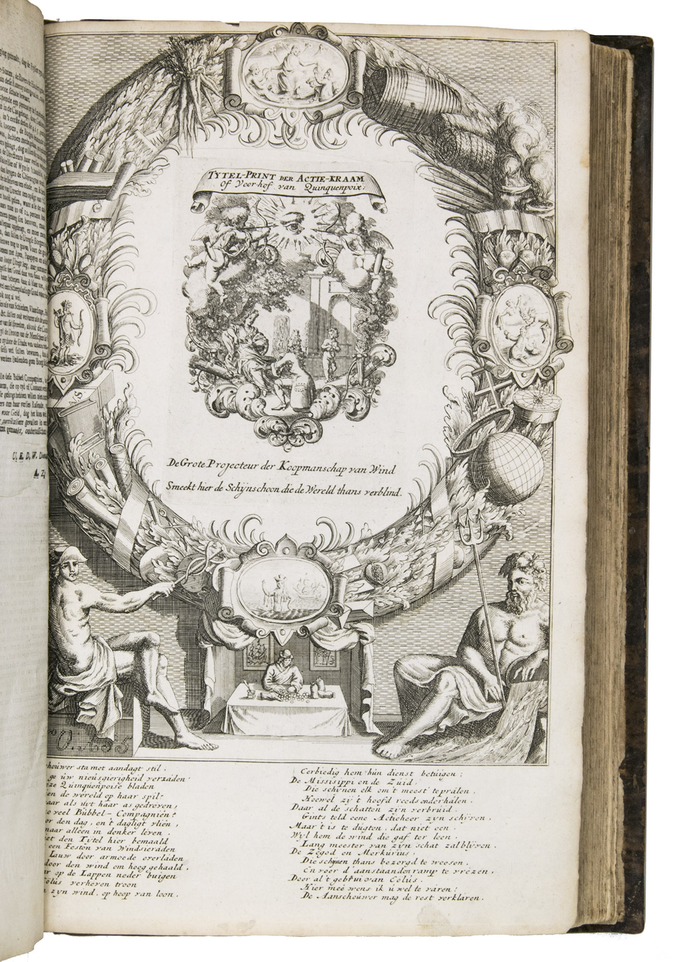 A famous collection of texts and plates satirizing the Englishman John Law, his Mississippi Company, and the international land and trading speculation in worthless shares of the South Sea Bubble of 1719-1720, which resulted in an international scandal. The speculation began in Paris, London and Hamburg, spreading to the Netherlands in the summer of 1720. While plays satirizing the speculation already opened in September 1720, the bubble really burst in October. Pieter Langendijk and Gysbert Tysens have been identified as authors of some of the plays. The book also provides the texts of official documents relating to the Dutch trading companies involved.
