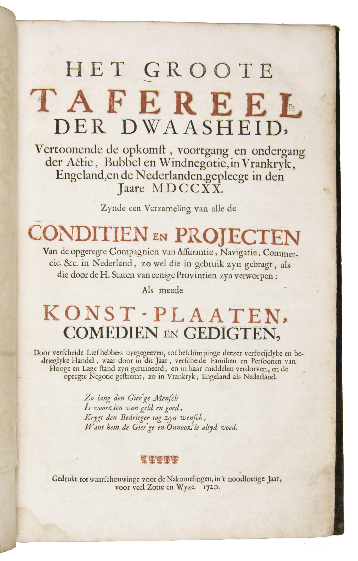 Het groote tafereel der dwaasheid, vertoonende de opkomst, voortgang en ondergang der actie, bubbel en windnegotie, in Vrankrijk, Engeland en de Nederlanden, gepleegt in den Jaare MDCCXX.