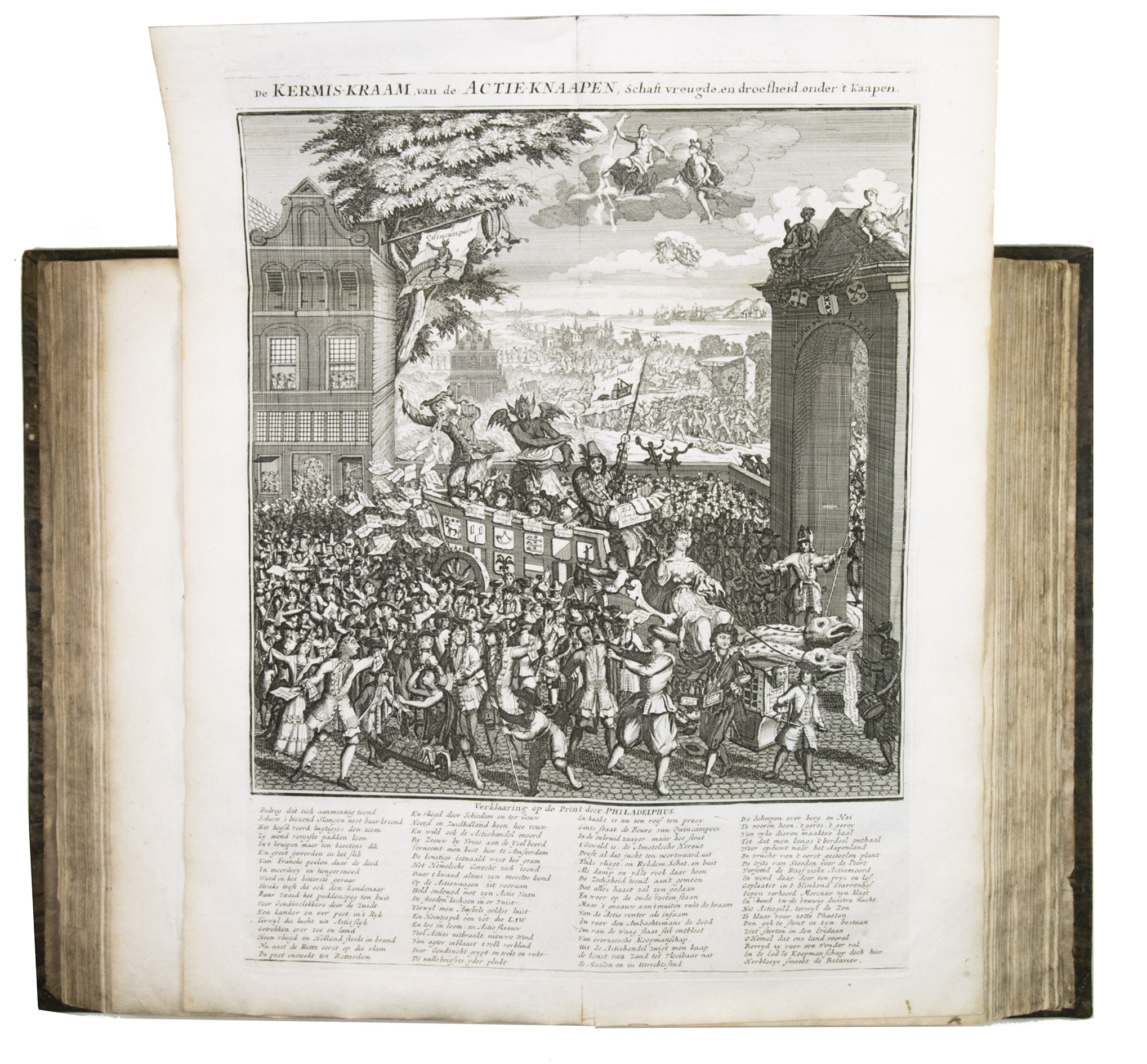 Text and plates were originally issued in parts, and were continuously supplemented over a longer period. Work on the book as a whole must have begun after the Amsterdam disturbances of 5 October 1720, though some of the plays and other items had been separately published before that. There are four editions known of the letterpress, of which this one is listed as the first by Muller. Within each edition the number and makeup of the plates varies greatly from copy to copy. Muller gives a list of 74 plates in the most extensive contemporary published list, but no copy of any edition includes them all (some are alternatives) and several plates frequently included are not in those lists. The present copy includes 72 in Muller's list of 74 (omitting nos. 57 and 74) and includes 4 not in that list (Muller 3611-3613 and 3615). The book is an important source for multidisciplinary research, e.g. iconology, economic history, colloquial proverbs and idioms.
