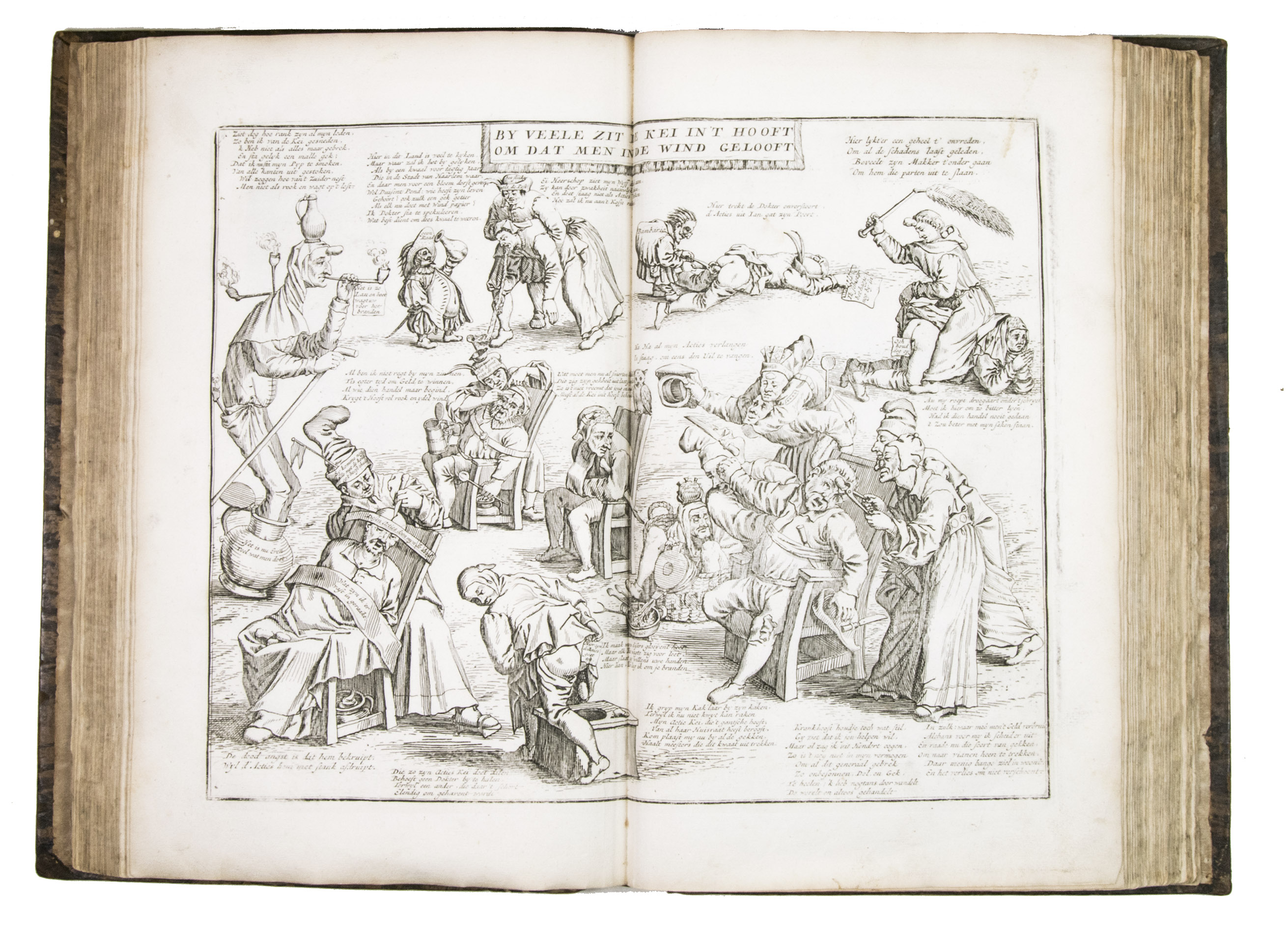 The binding is very slightly rubbed, the joints have been professionally reinforced, slightly browned throughout, some plates show small tears along the folding lines, without any loss. Otherwise in very good condition. De Bruyn, "Het Groote Tafereel ... ," in: Eighteenth-Century Life XXIV (2000), pp. 62-87; Kress 3217 (eds. not distinguished); Muller, Historieplaten II, pp. 103-124; Van Rijn, het groote tafereel der dwaasheid, 1905; Sabin 28932 (eds. not distinguished); STCN 254984576; cf. (slightly differing collation or fingerprint) STCN 254984185, 293084076, 228136539; for the binding: Storm van Leeuwen vol. I, pp. 228-284.