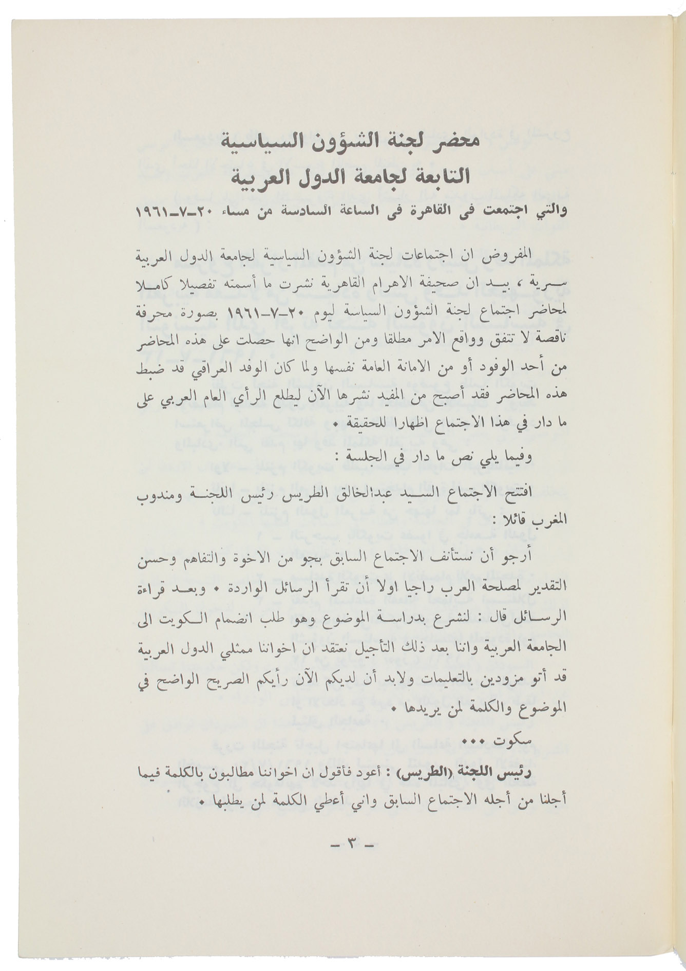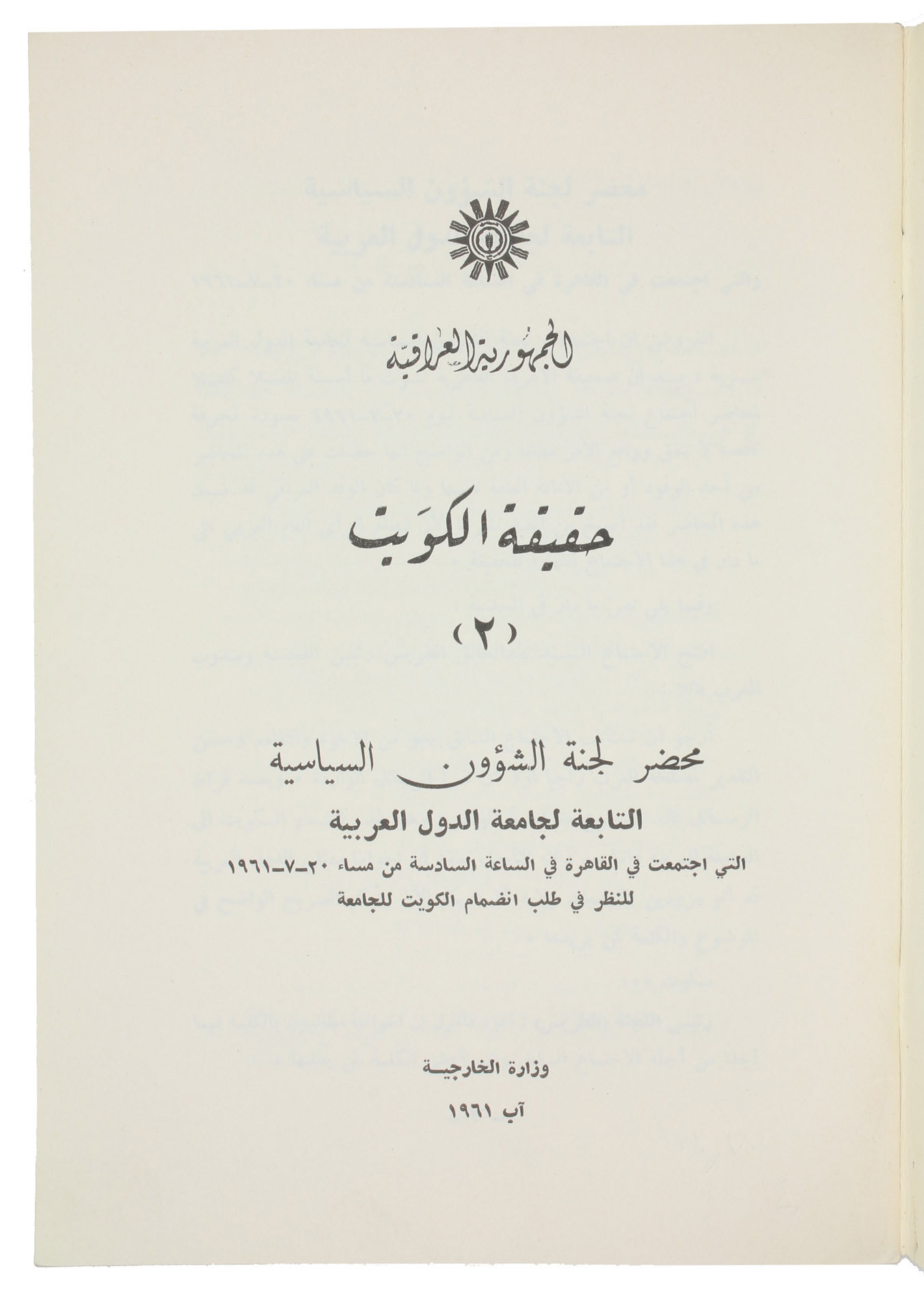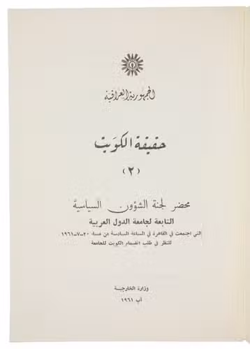 First edition of the second of two rare pamphlets published by the Iraqi government, opposing the independence of Kuwait. The first pamphlet, published in English and Arabic, outlined Kuwait's historical connection to Iraq and analysed its "imperialist relations" with Britain. This second one, in Arabic throughout, prints the minutes of the Political Affairs Committee of the Arab League, which met in Cairo on 20 July 1961 to consider Kuwait's request to join the League.
