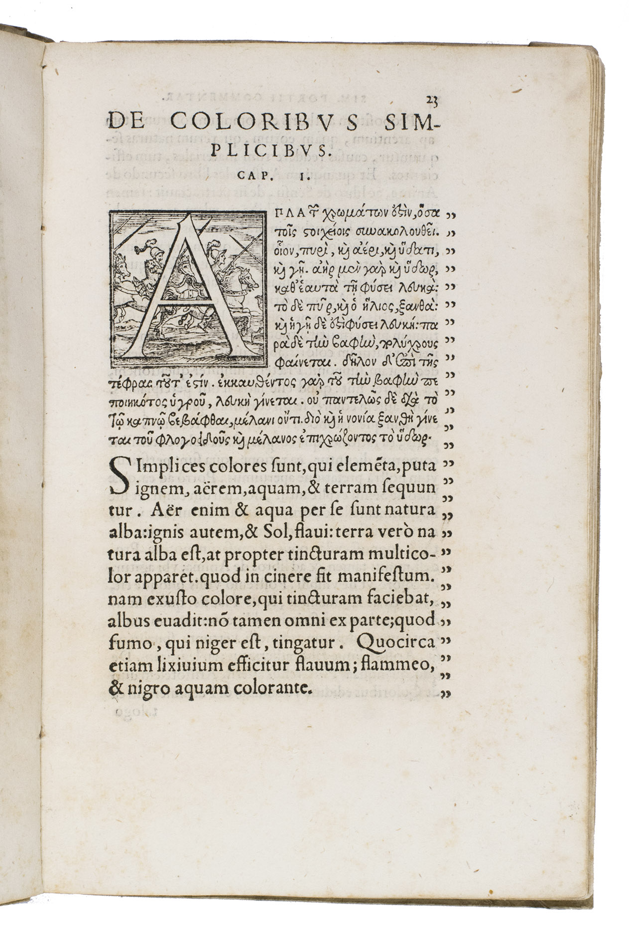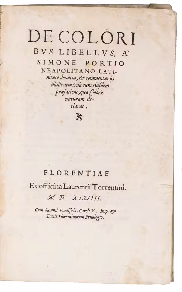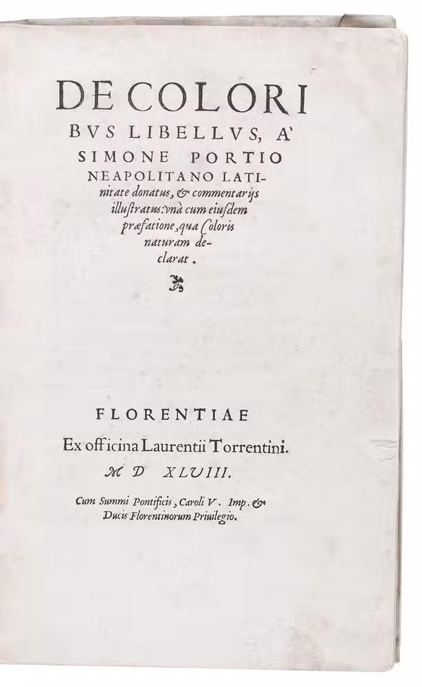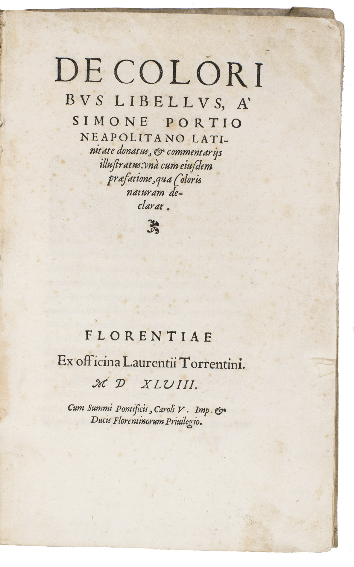 First edition of one of the earliest printed books about colour, translated from the Greek into Latin and with commentary by the Neapolitan physician and philosopher Simone Porzio (1497-1554). Usually attributed to Aristotle, it is now thought to be the work of the peripatetic scholar and pupil of Aristotle, Theophrastus.