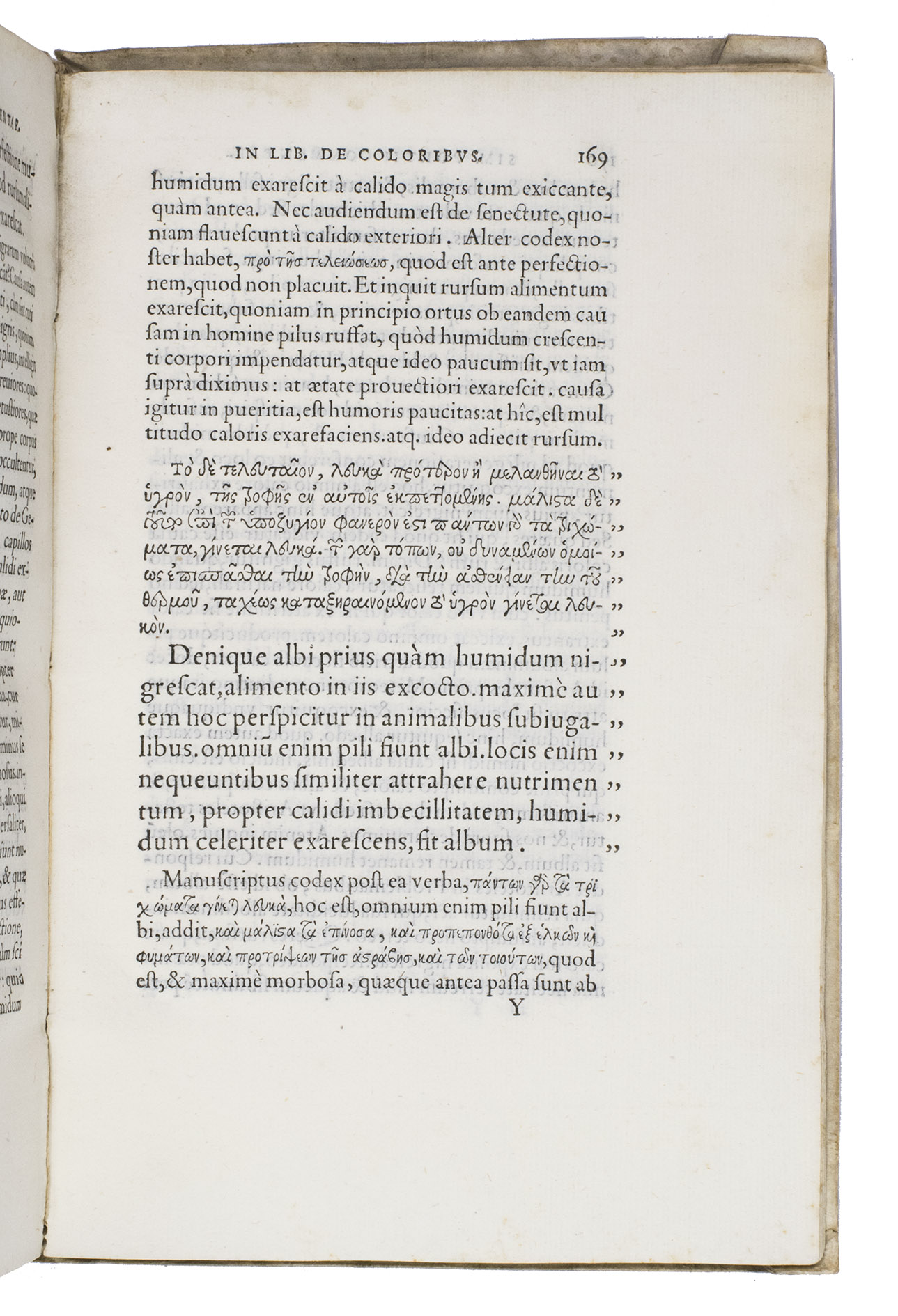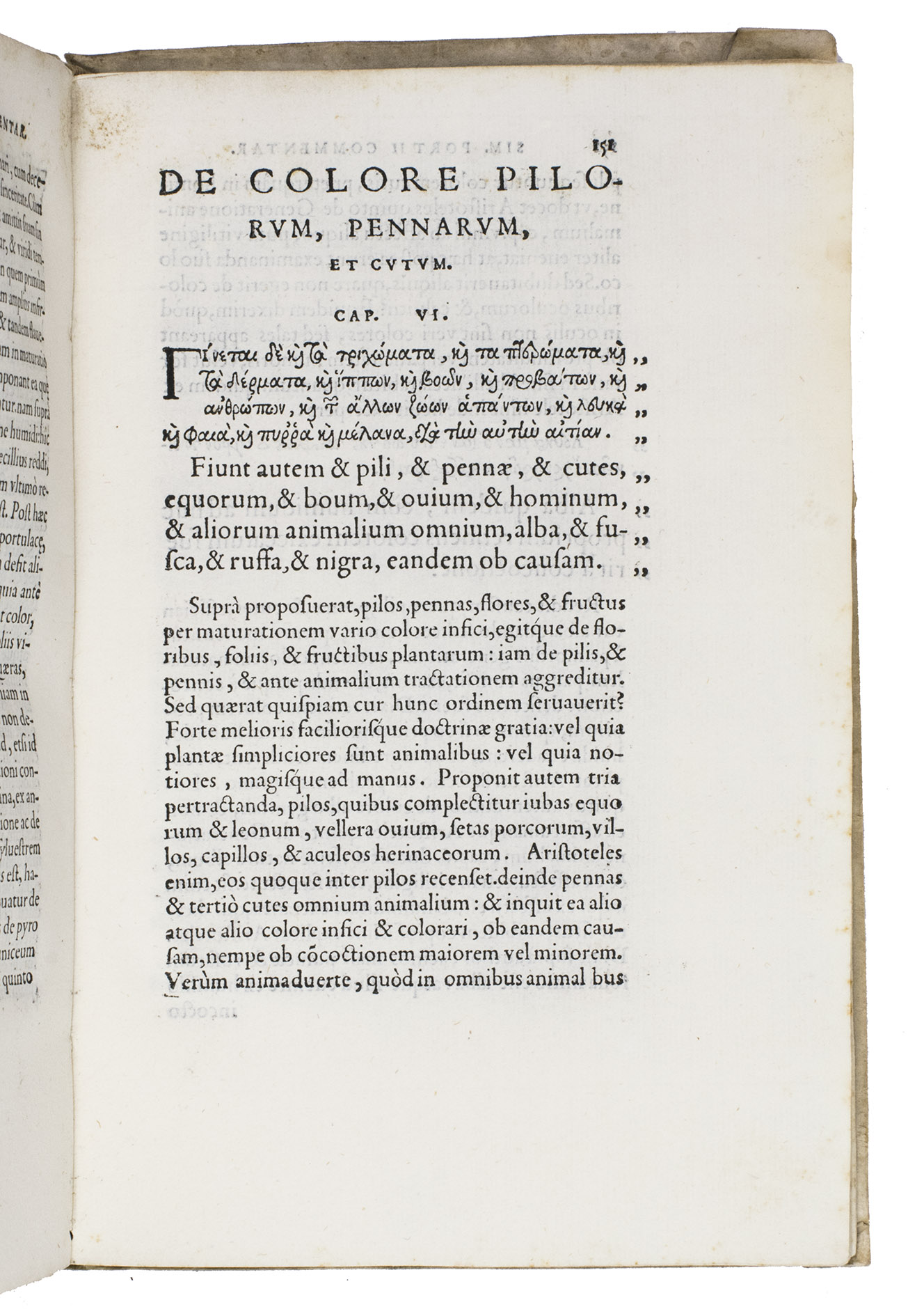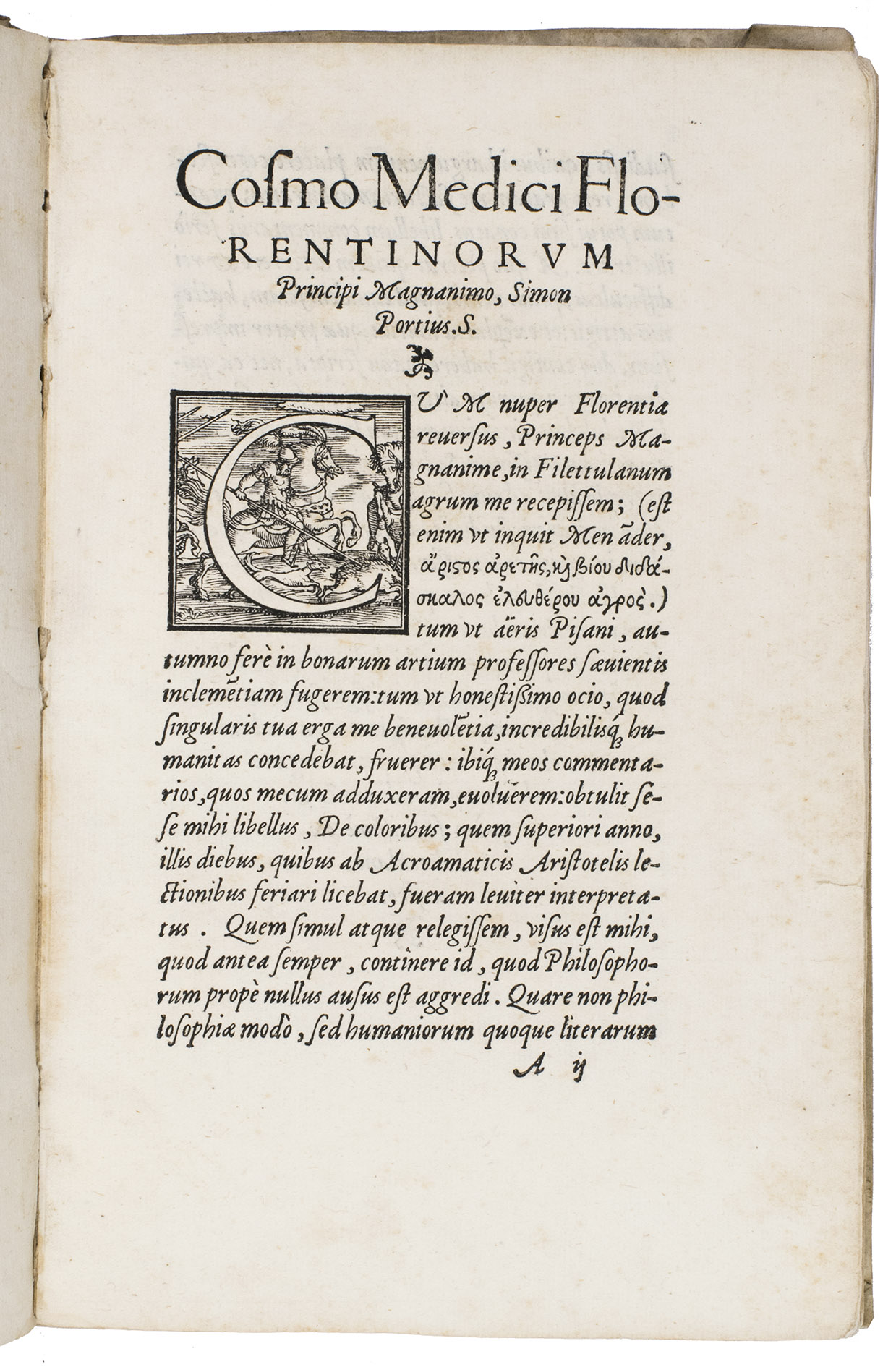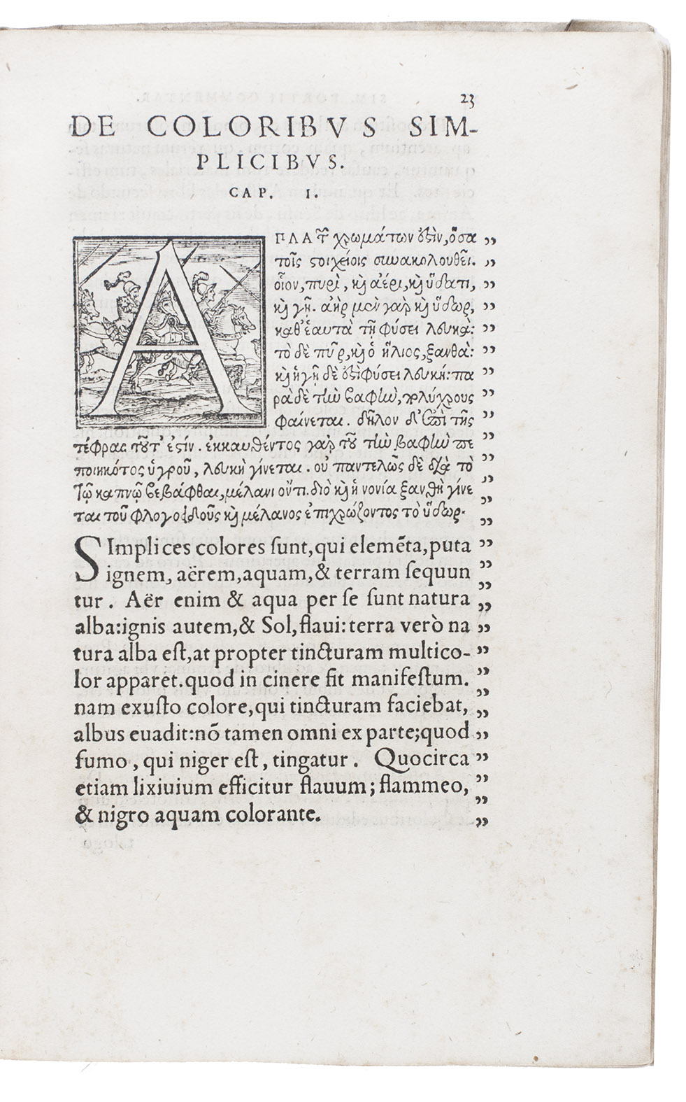 First edition of one of the earliest printed books about colour, translated from the Greek into Latin and with commentary by the Neapolitan physician and philosopher Simone Porzio (1497-1554). Usually attributed to Aristotle, it is now thought to be the work of the peripatetic scholar and pupil of Aristotle, Theophrastus.
