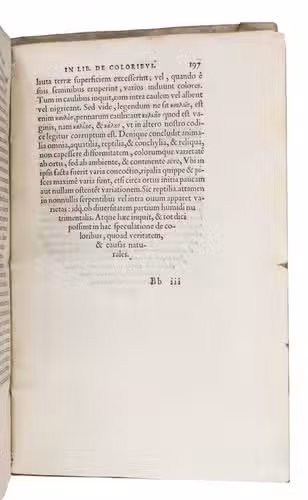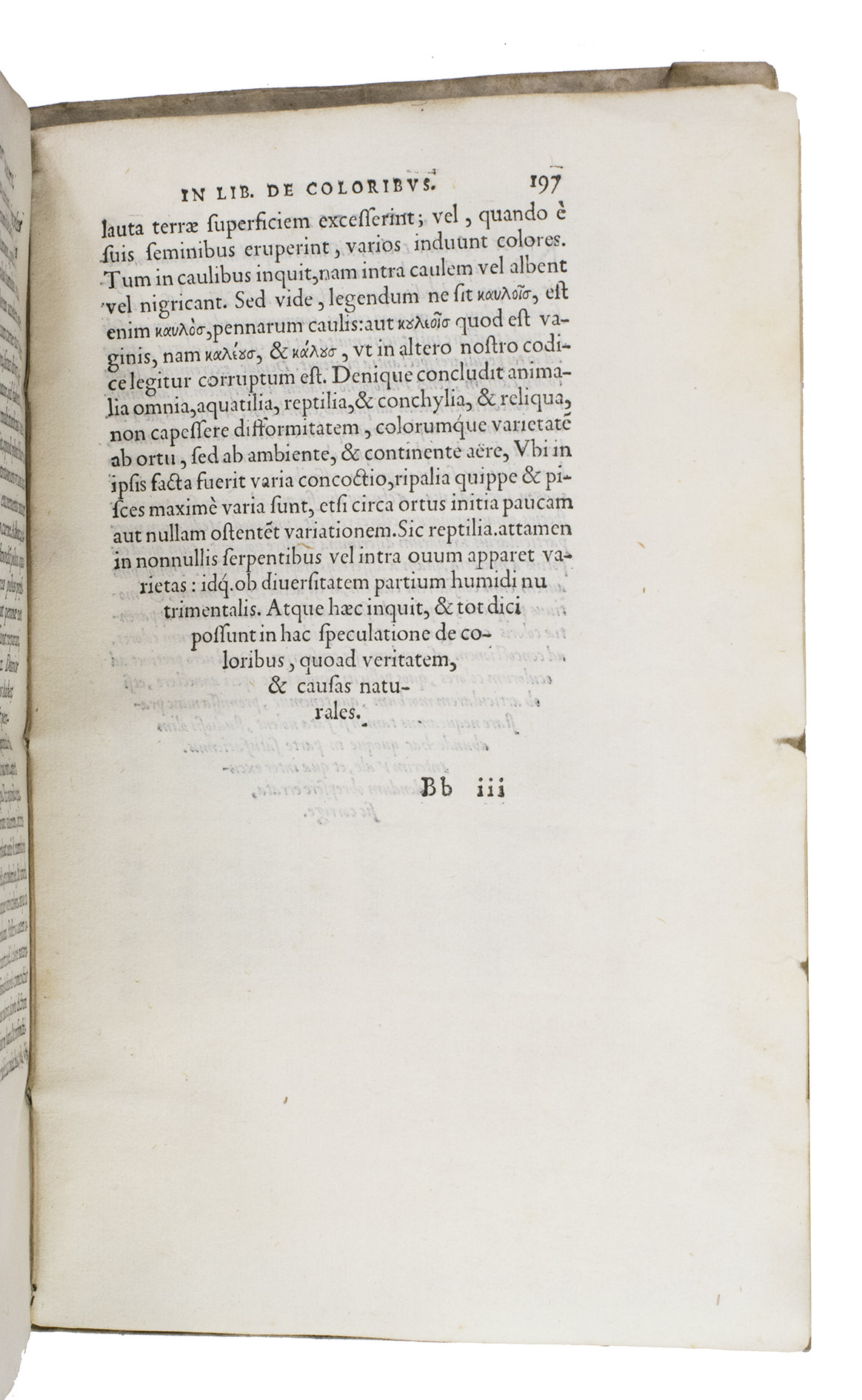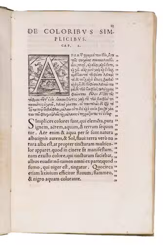 With some spotting on the title-page and some marginal tears, not approaching the text, but otherwise in very good condition and with large margins. Binding with the sewing supports broken, a tear in the backstrip and some small stains. An important treatise on colour and one of the earliest. Adams P1958; Caillet 8881; EDIT16, CNCE 16133; Hoffman I, 289 ("rare and very important"); Kemp, The science of art, p. 264; Schwab, Bibliographie d'Aristotle 3503; USTC 803281.