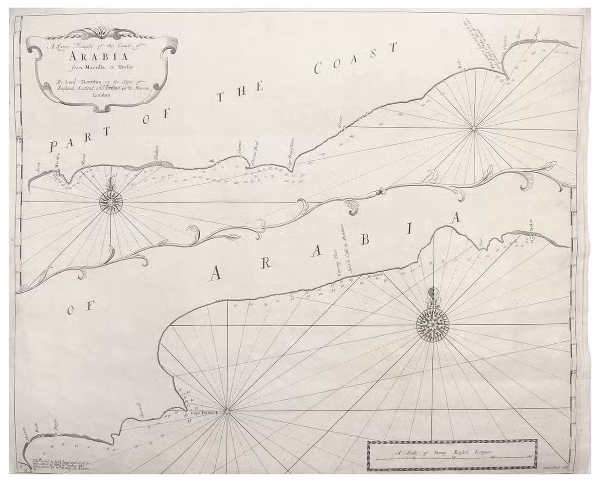 Rare nautical chart of the southern coasts of Yemen and Oman, published in The English pilot ... the third book, and signed at lower right by the engraver: "Sutton Nicholls sculp". The coast is shown in two slightly overlapping parts, the western part above and the eastern part below, with a charming decorative vine dividing them (running diagonally across the chart). Each half has a reticulated scale of degrees latitude, the upper (western) part in the left border and the lower (eastern) part in the right border. Together they show the coast from "Sooa" (?) and "Maculla" (al Mukalla in Yemen) in the west to "Dofar" (Dhofar or Dhufar in Oman) in the east (about 750 km of the coast from about 49 to a bit more than 54°E, at a scale of about 1:750,000). John Seller first published the third book of The English pilot in 1675, but brought John Thornton (1641-1708) into partnership in 1677 and later turned the publication over to him. He served as hydrographer to the English East India Company and published a new edition of the third book in 1703. When he died in 1708, his son Samuel (d. 1715) took charge and published a new edition, including the present map bearing his imprint, in 1711. The three lines with Samuels imprint were removed in a later state of the chart. Tibbetts 177. Not in Al Ankary; Al-Qasimi. For the English Pilot: Tooley, Maps and mapmakers, pp. 59-61.