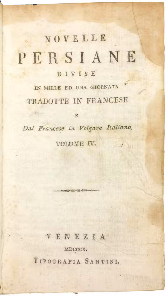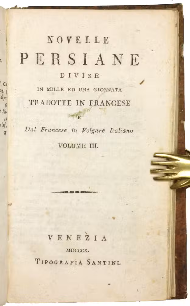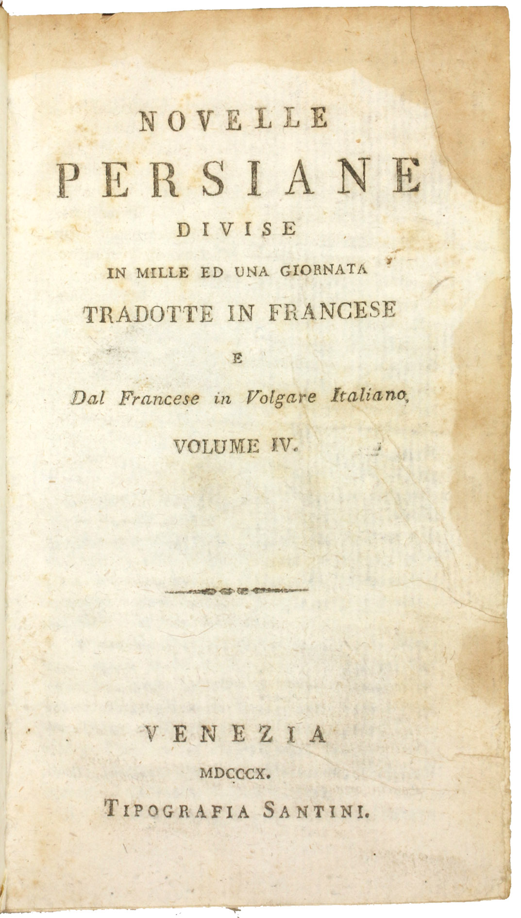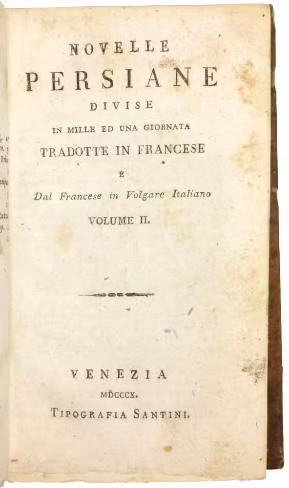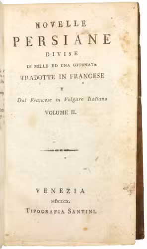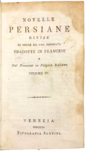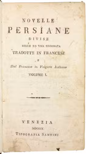 Charming Italian edition of the Heyaryek-Rouz or Thousand and One Days, so called to "give the work an air of originality" (Chauvin IV, 124). A Persian manuscript of this work was given to Francois Petit de la Croix in Isfahan in 1675, but enjoyed far fewer editions and translations than the Alf layla wa-layla. As Chauvin notes, it cannot be determined whether the Thousand and One Days or the Thousand and One Nights was composed first; nevertheless, to this day the Heyarek-Rouz is much less well-known to the Western world (IV, 123f.). Chauvin quotes one commentator who declares the Heyarek-Rouz "much more ingenious and more realistic, as it sometimes includes marvels, following the taste of the Oriental".