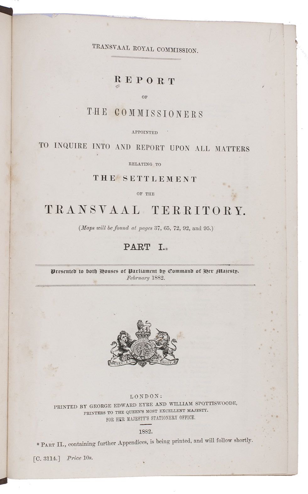 Report of the commissioners appointed to inquire into and report upon all matters relating to the settlement of the Transvaal territory. Part 1[-2].