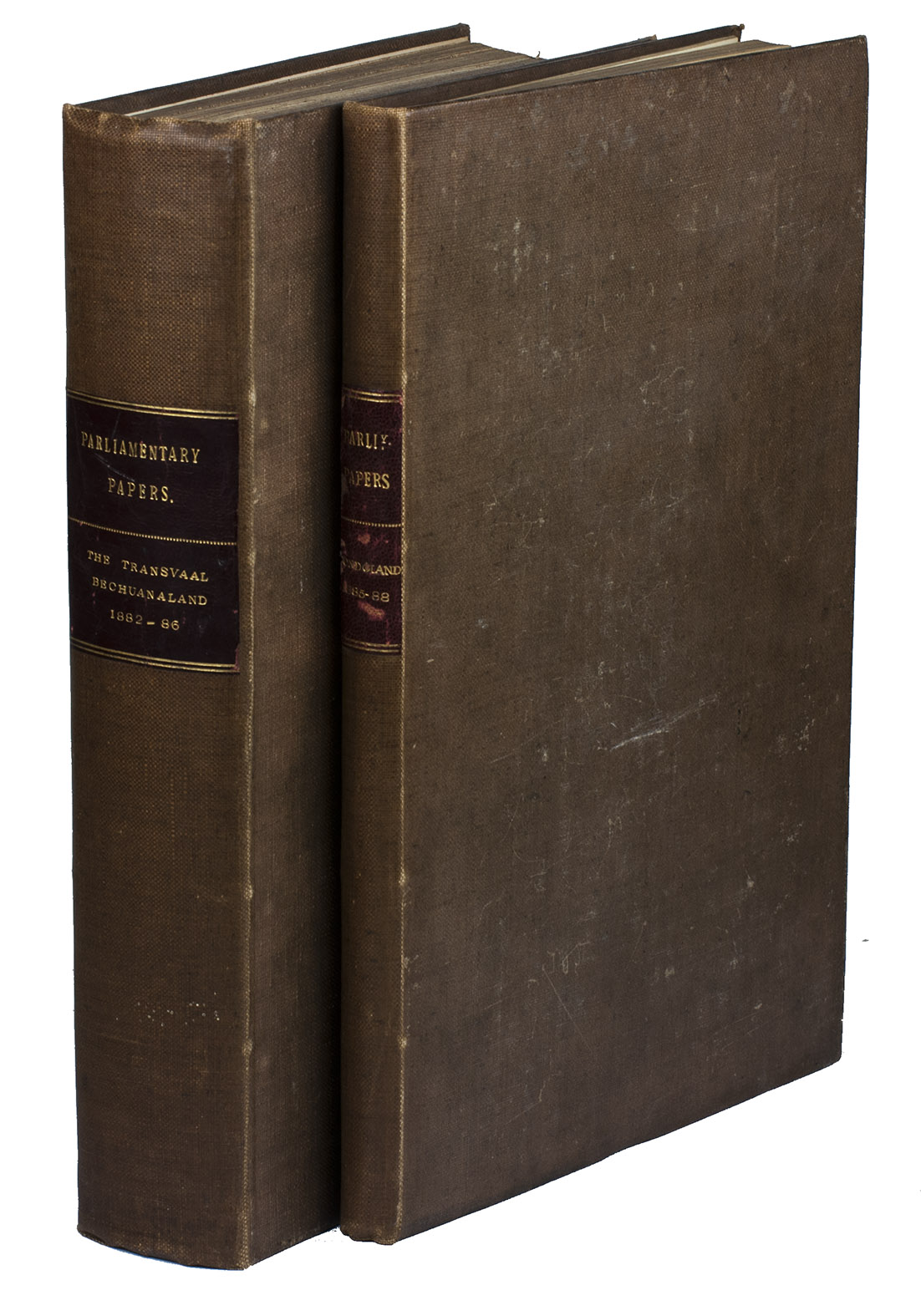 Collection of eight parliamentary papers, individually published between 1882 and 1888, dealing with disputes and affairs in Transvaal, Bechuanaland and Pondoland. The first volume opens with three subsequent reports on land disputes in Transvaal, resulting from the First Boer War (1880-1881), executed by the Transvaal Royal Commission. It includes numerous telegrams, letters, transcripts of interviews and conferences, and maps showing the boundaries of different territories. The papers on Transvaal are followed by 2 similar reports on Bechuanaland, also including several maps. The second volume deals with Pondoland in the east of South Africa, containing 3 published papers with correspondence on different affairs in the area.