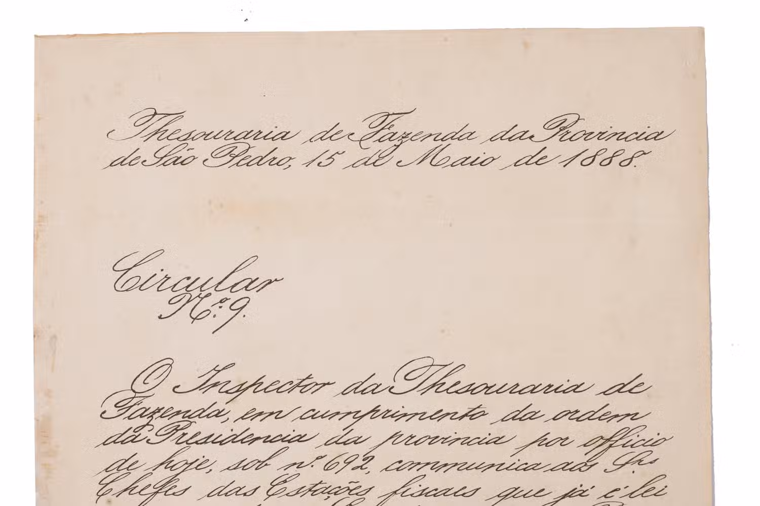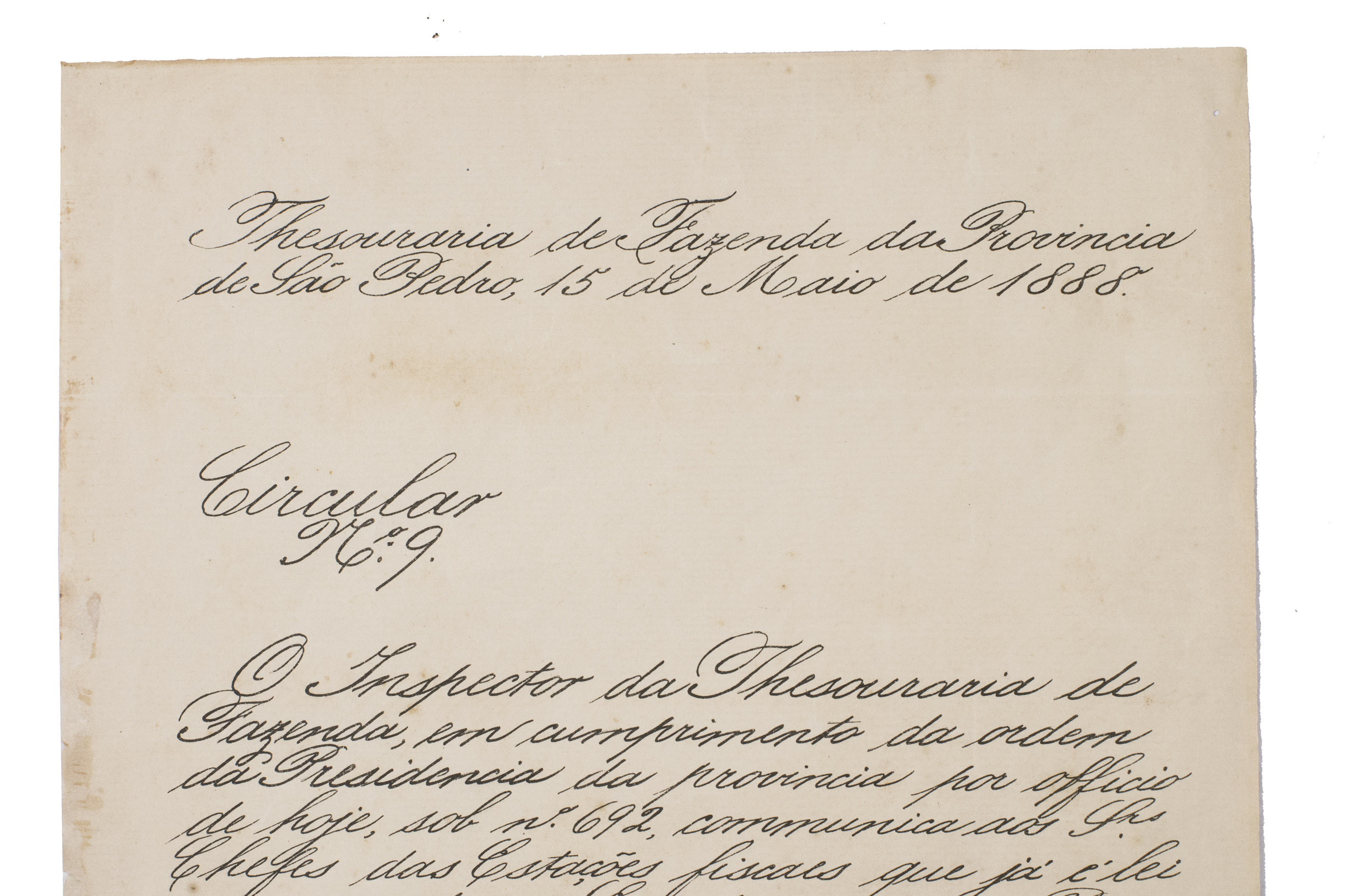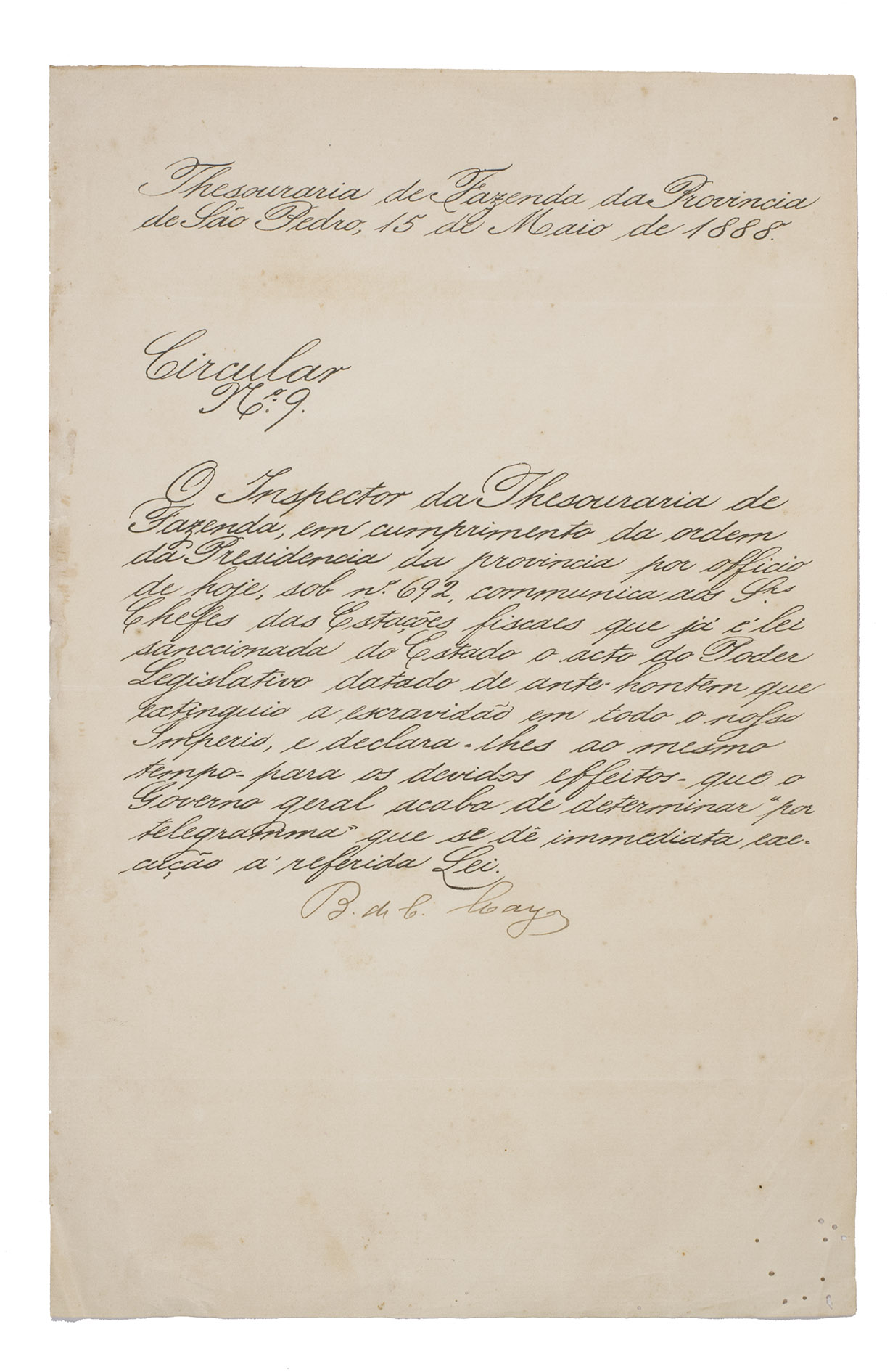 [Official circular by the Treasury of Finance of the Brazilian province Saõ Pedro (now Rio Grande do Sul)]. [drop title:] Thesouraria de Fazenda da Provincia de Saõ Pedro, 15 de Maio de 1888. Circular No: 9.
