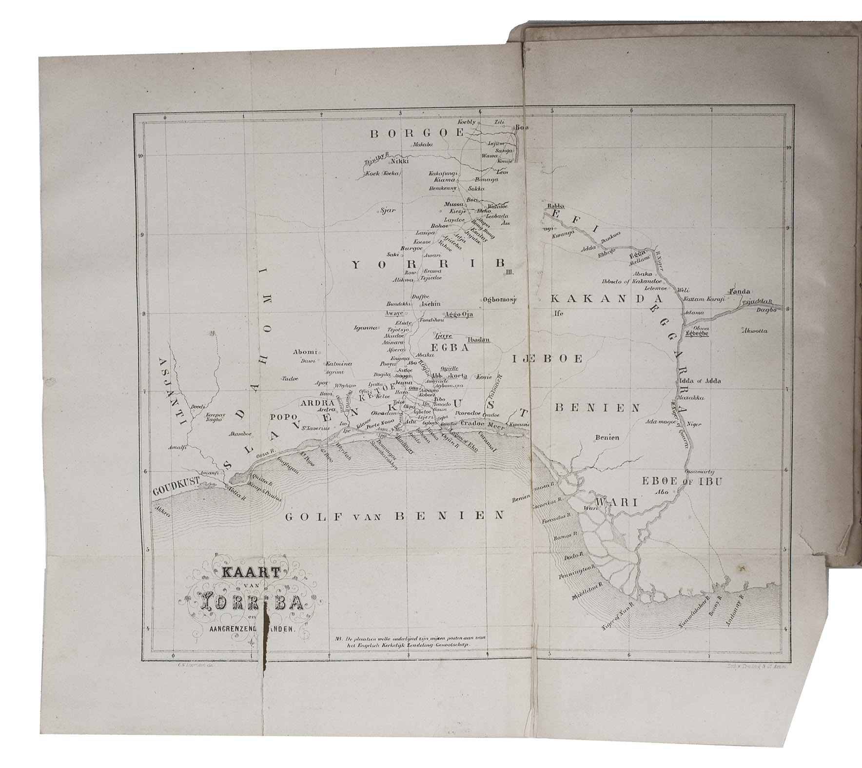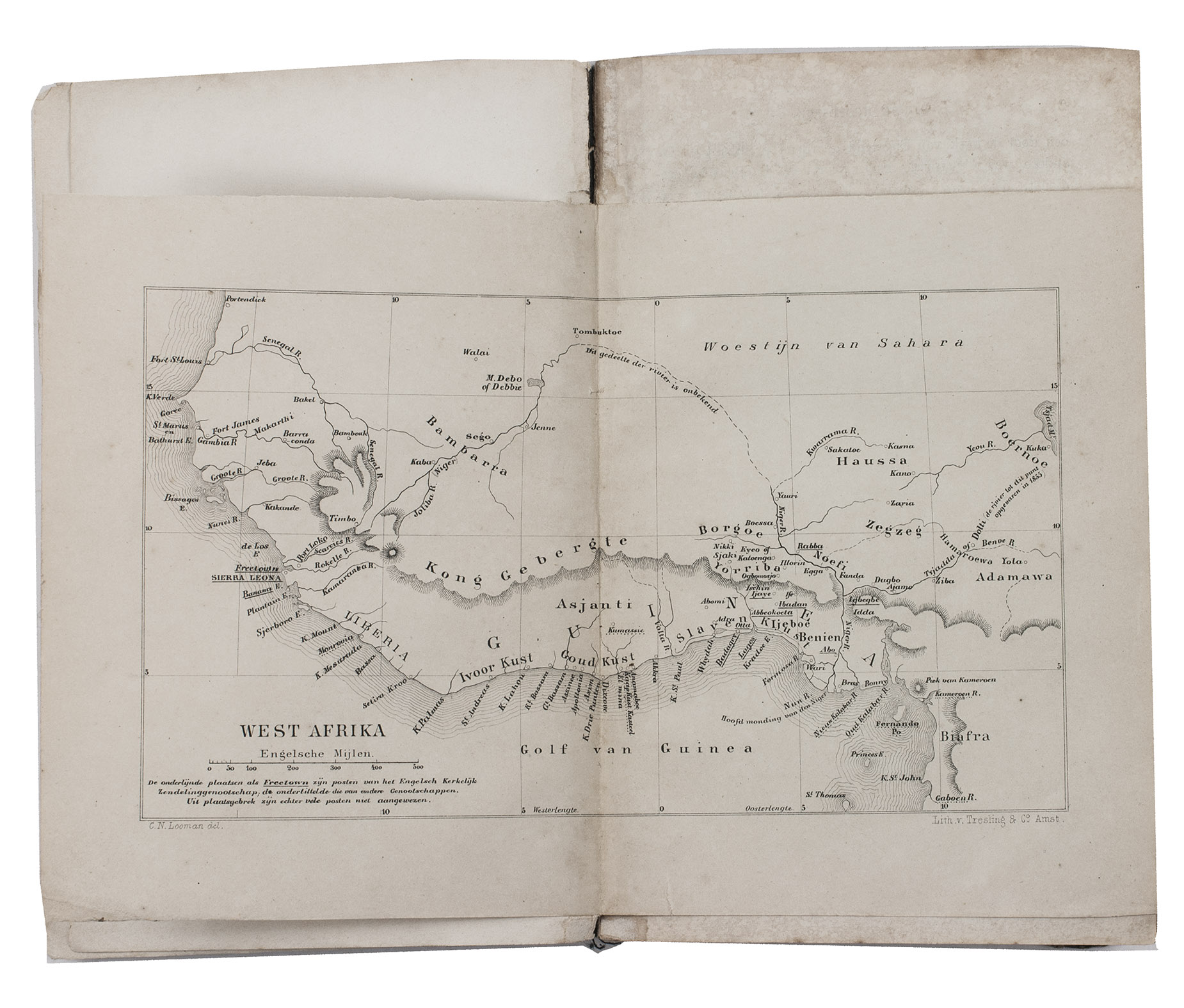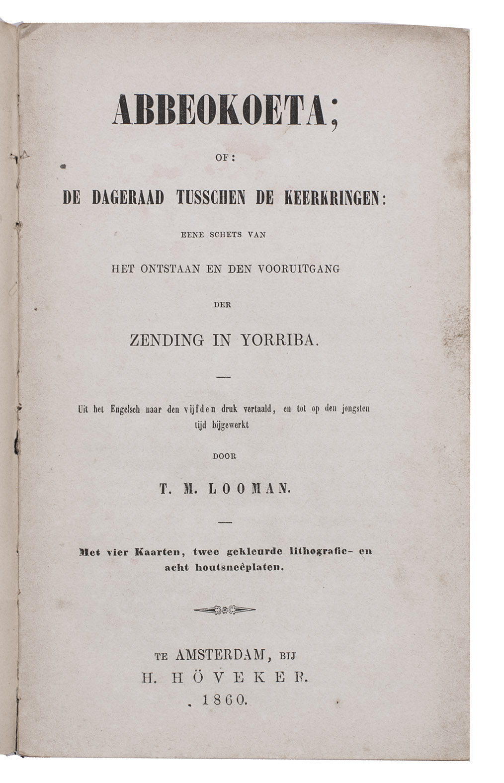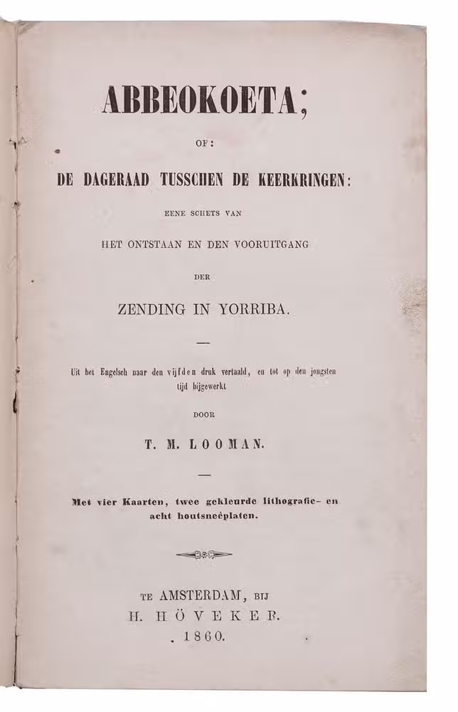 First and only edition of the expanded Dutch translation of Abbeokuta, or Sunrise within the tropics by Charlotte Maria Tucker (1821-1893), translated and expanded by Theodorus Matthijs Looman (1816-1900). It is a description of Yorubaland, West Africa, and the Christian mission. The book opens with a chapter on the slave trade -- the Yoruba people were among the most heavily targeted -- followed by chapters on the Muslim Fula people, the Niger-expedition, Abeokuta, etc. It includes maps of West Africa, Yorubaland and Abeokuta, and several other illustrations.